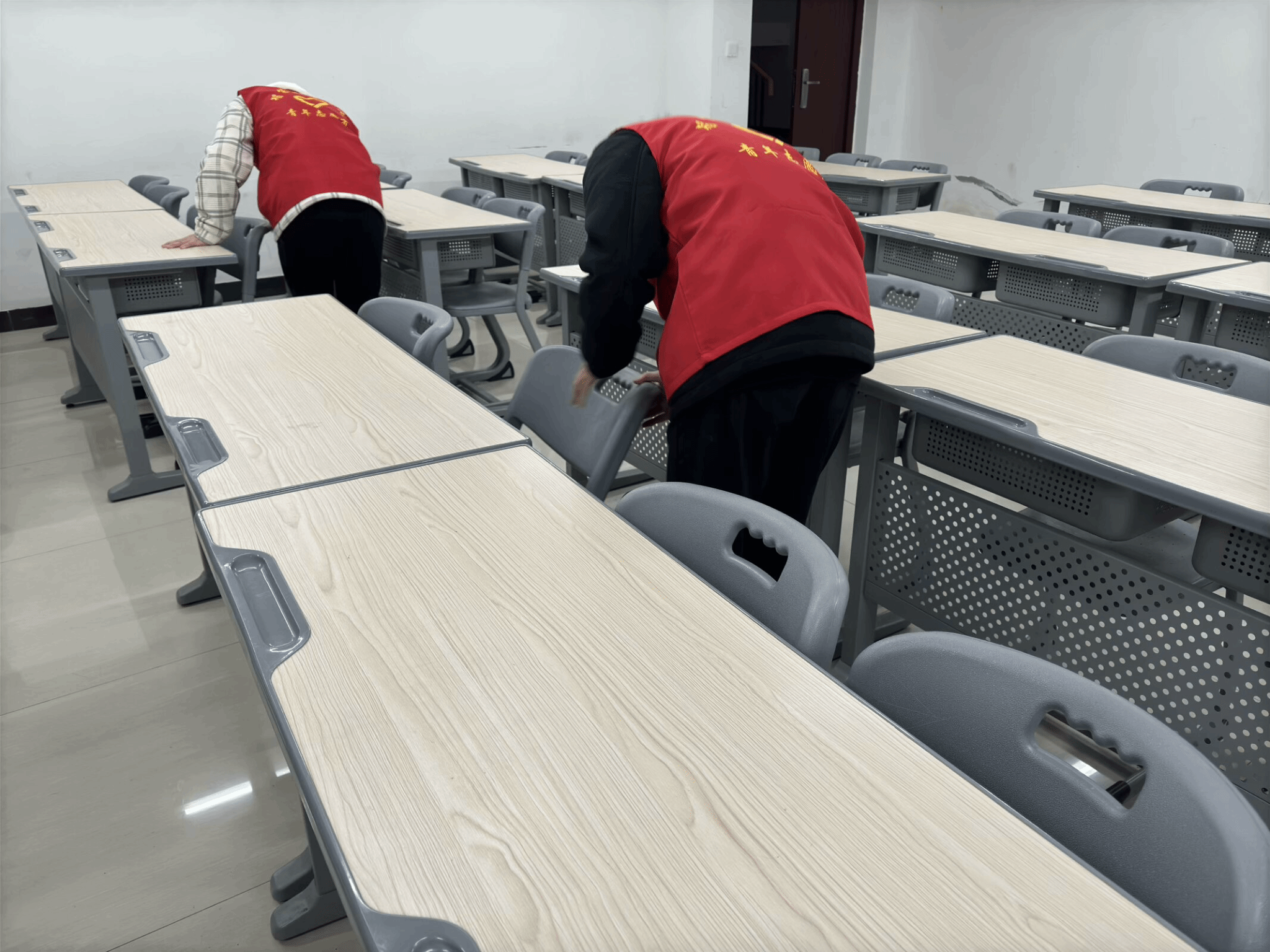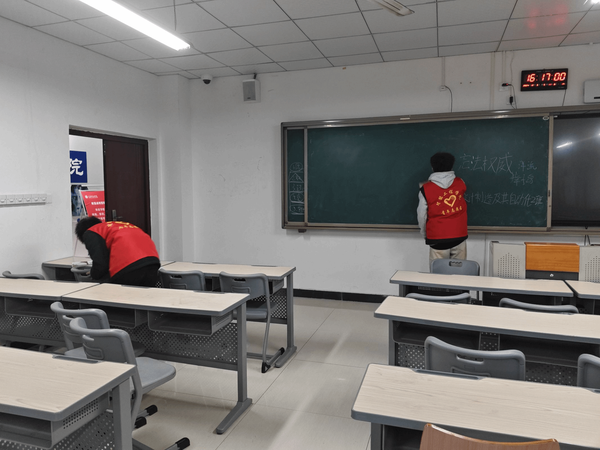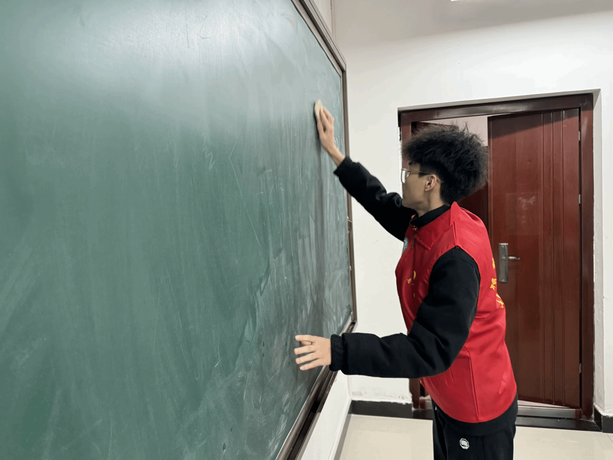 智工青协的志愿者们身着鲜艳的红马甲,如同一簇簇跃动的火焰,汇聚在校园的各个角落。他们目光坚定,脚步有力,怀揣着对校园的热爱与守护之心,开启了一场清洁之旅。教室里,擦黑板的志愿者专注地与粉笔灰“战斗”,所到之处,黑板焕然一新;扫地的志愿者们细致入微地搜寻着每一片纸屑、每一粒灰尘,他们不嫌脏、不怕累,用双手拾起垃圾;摆桌椅的志愿者们,如同校园里的“秩序大师”,他们轻挪桌椅,让每一排都整齐划一,每一列都秩序井然,为教室营造出一种井然有序的和谐氛围。此外,教室外及老师的办公室也有着志愿者们的身影。当活动接近尾声时,负责人与志愿者们围坐在一起,大家分享着活动中的点点滴滴,志愿者们脸上洋溢着自豪的笑容,他们坦言:“能为同学们打造一个更舒心的学习环境,再辛苦也值得。”