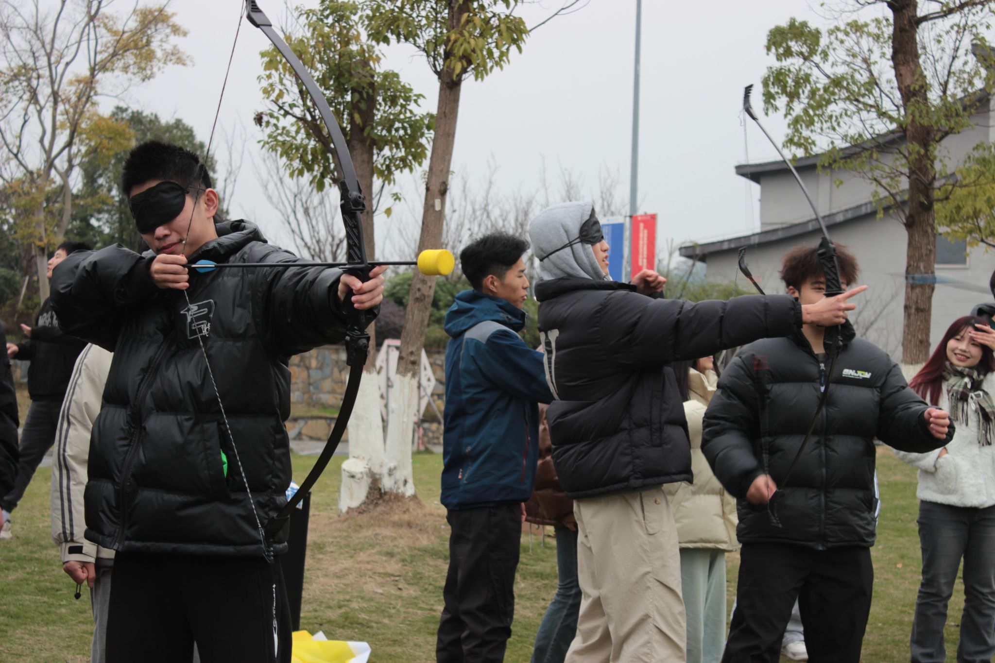 三人一组,每轮比赛共三组同时进行。每组中,一人担任箭手,一人蒙上眼睛充当盲人,还有一人则负责摆放纸杯并发出射箭口令,充当摆设者。在摆设者灵活多变的纸杯摆放和指挥者的精准口令下,盲人箭手们凭借感觉和团队间的默契,向目标发起挑战。每当箭矢划破空气,精准射中纸杯并使其掉落时,现场便爆发出阵阵欢呼和掌声。这不仅考验了同学们的团队协作能力和射箭技巧,更在欢声笑语中传递了友谊与拼搏的精神。
