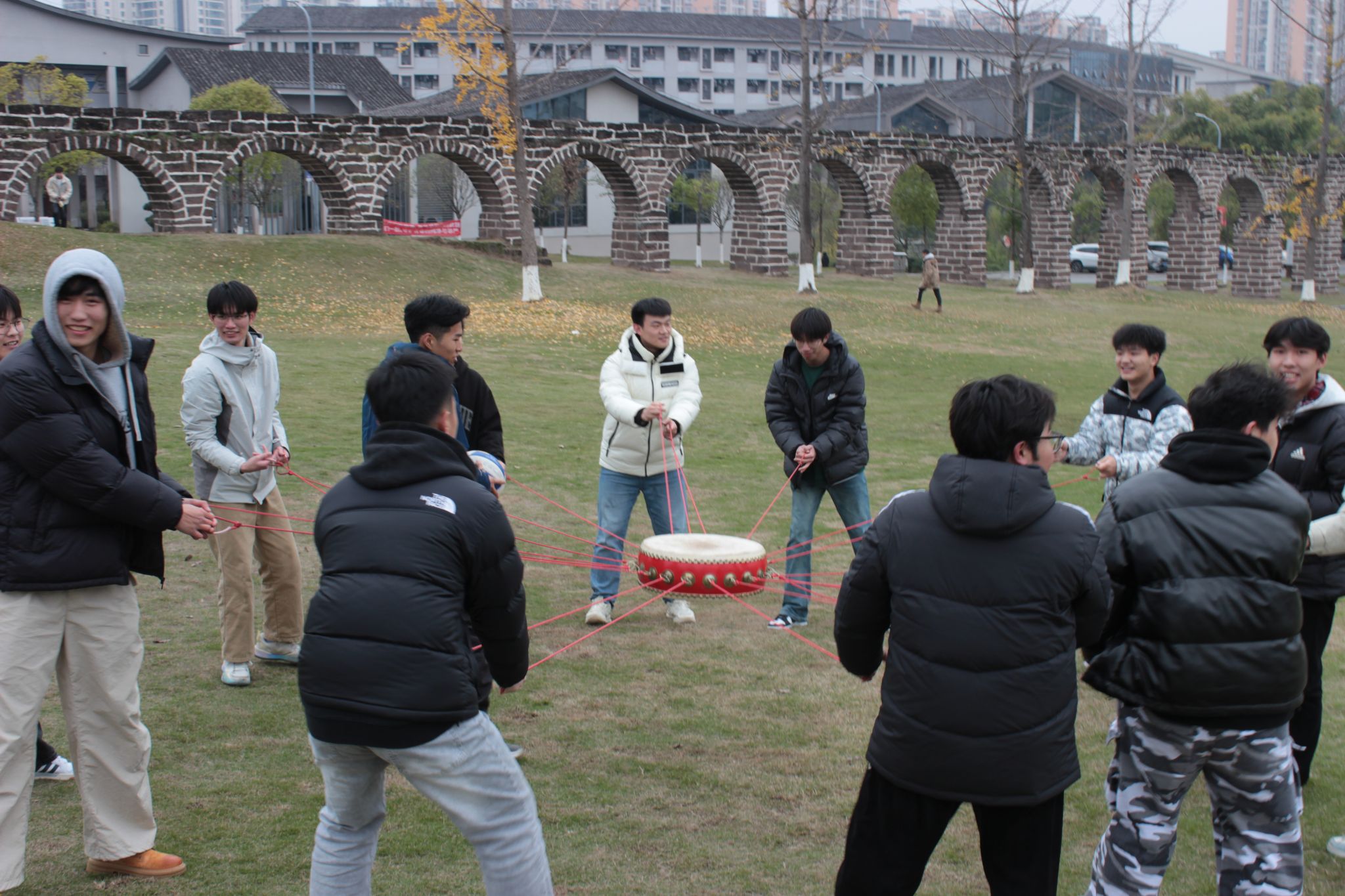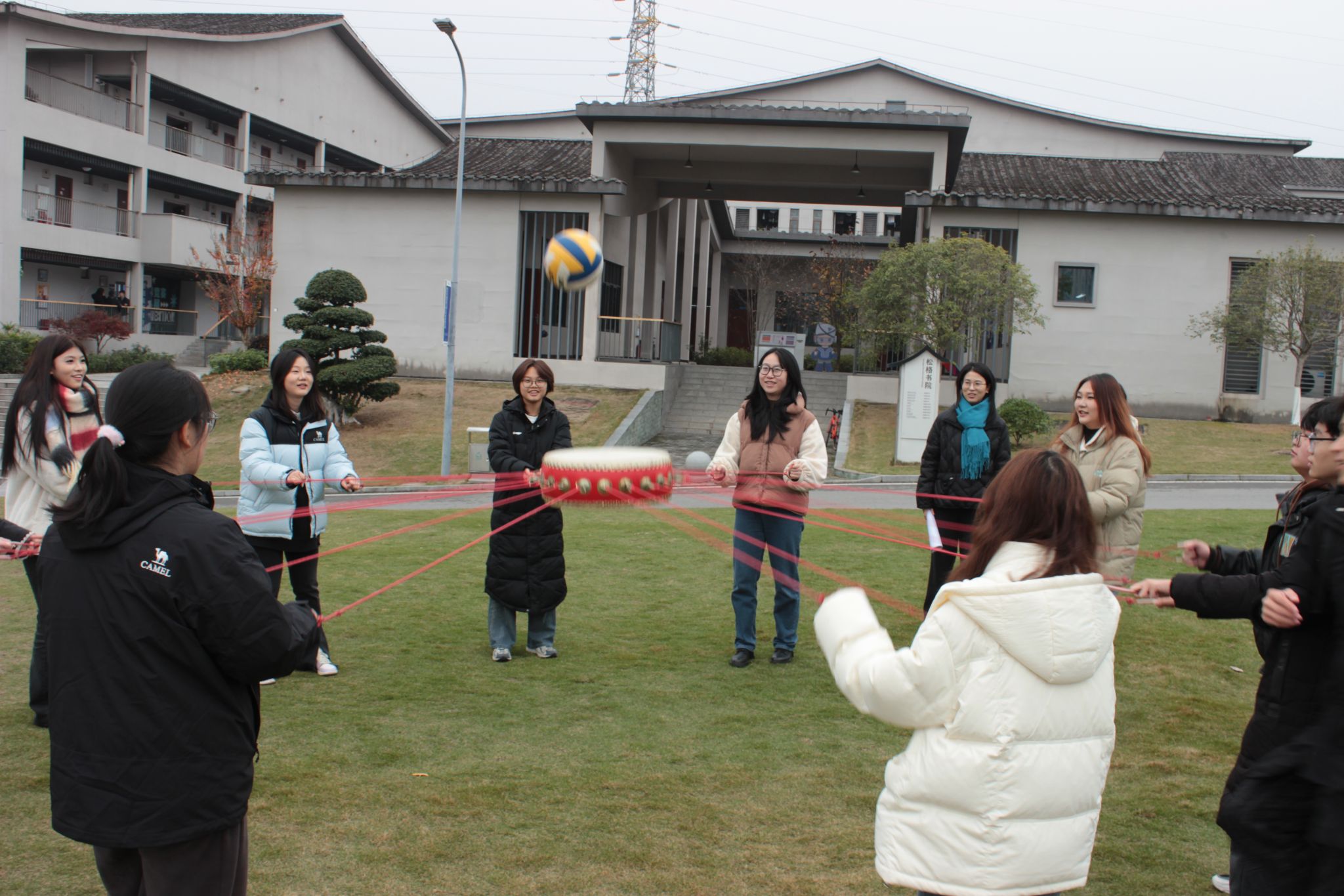 每组 8 名同学围站在同心鼓四周,双手紧紧拉住鼓上的绳子,眼神专注地盯着鼓面上的排球。随着一声清脆的哨响,比赛正式开始,同学们齐声高喊着口号,试图通过默契的配合让排球在鼓面上有节奏地颠起。每一次成功的颠球都伴随着同学们的欢呼与呐喊,而一旦球落地,同学们则迅速调整状态,相互鼓励,准备下一次的尝试。默契与团结,在此刻悄然萌发。