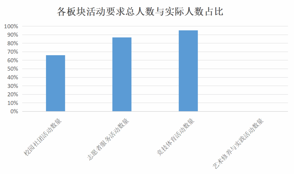 在智能工程学院的完满教育活动中不一样的板块活动规模大不相同,但从各个板块活动要求总人数和实际报名参加的人数可以看出,竞技体育活动参与人数最多,有参与率达到了95%,志愿者服务活动参与率达到了87%,校园社团活动达到了66%。