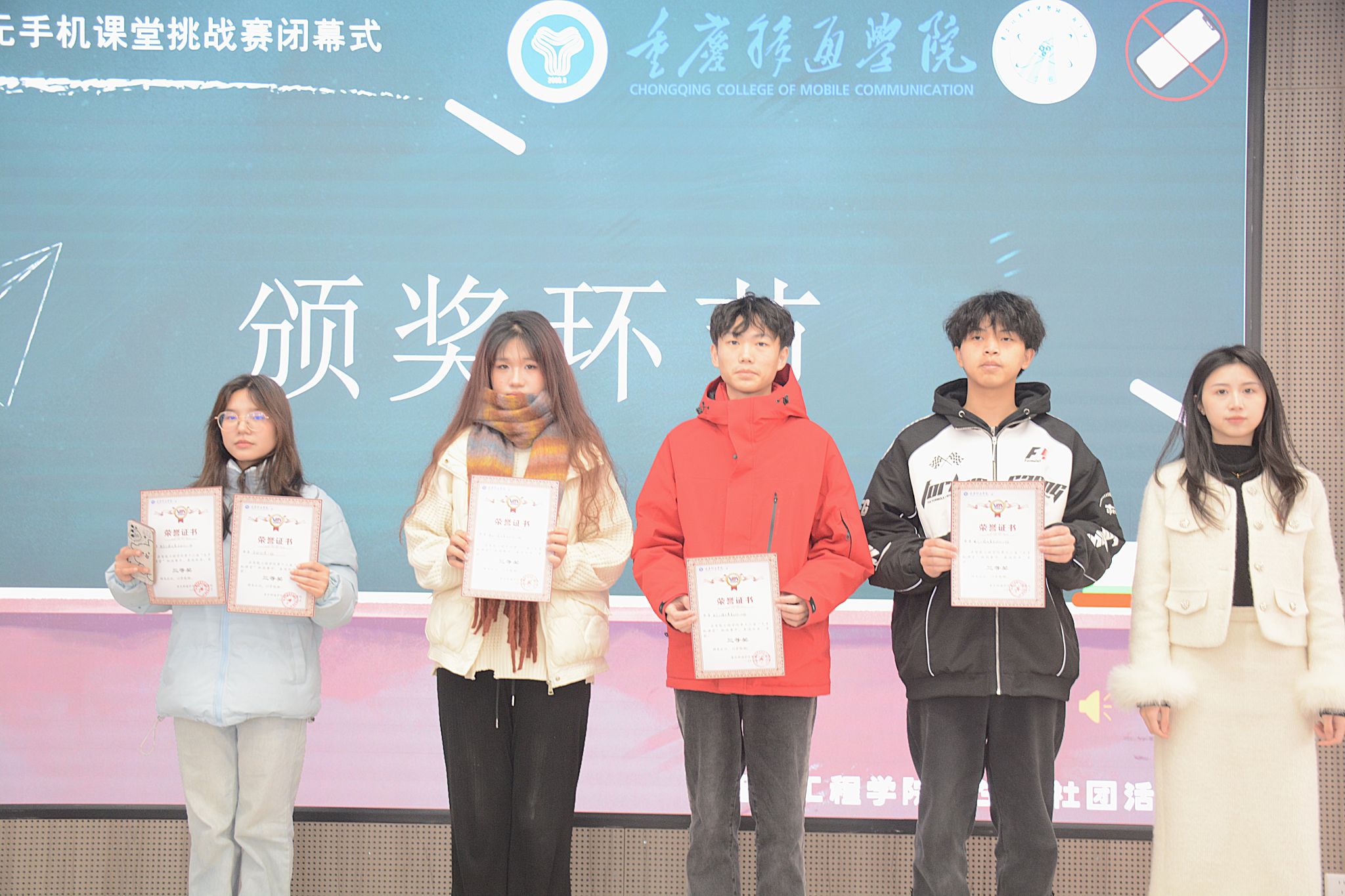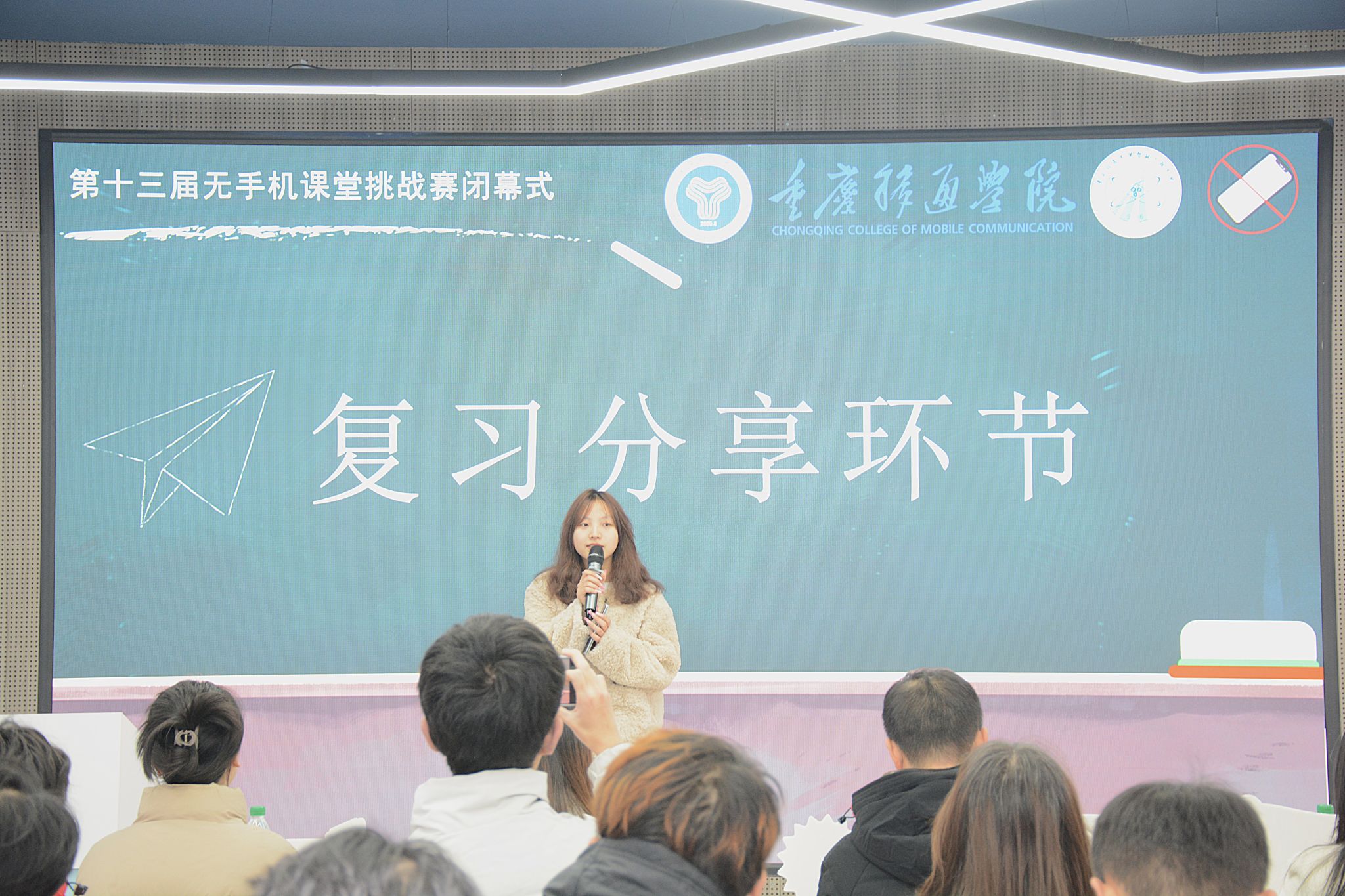 闭幕式伊始,播放了本次“无手机课堂”挑战赛过程中各班级精彩表现的集锦。视频展示中,同学们积极配合,课前主动将手机关机并放置于专属的“手机休息室”中,在活动开展期间,课堂上“低头族”的人数明显减少,课堂气氛更加活跃,学生们的听课质量也明显提高,活动赢得了学院师生的广泛好评。