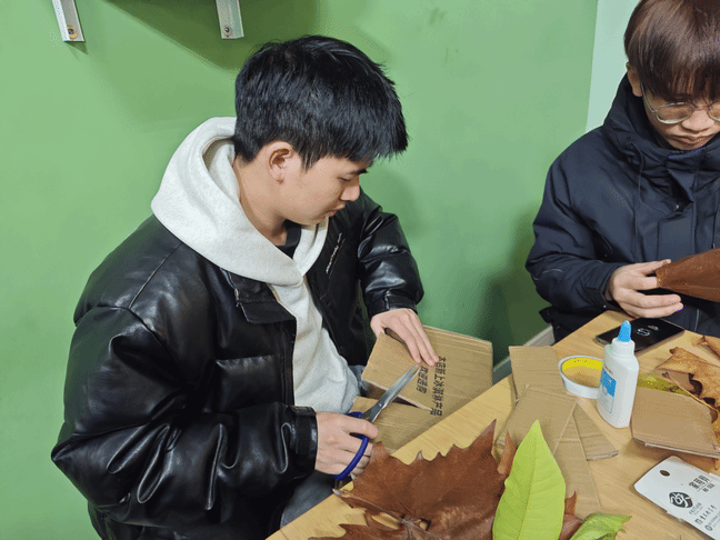 为提高同学们的动手能力,强化环保意识,班级在双栀书院数智展厅开展环保手工制作活动。整个活动现场充满了生机与活力,在一片欢声笑语之中,同学们利用自己平日中积攒的快递纸箱和维护校园环境时收集到的树叶和废弃材料进行二次创作。一样样废弃物品在一双双手中,摇身一变成了件件作品,有效实现了对废弃物品的二次利用。参与的同学们纷纷表示:用自己的双手将一份份废弃物品变成一件件手工作品,倍感自豪。