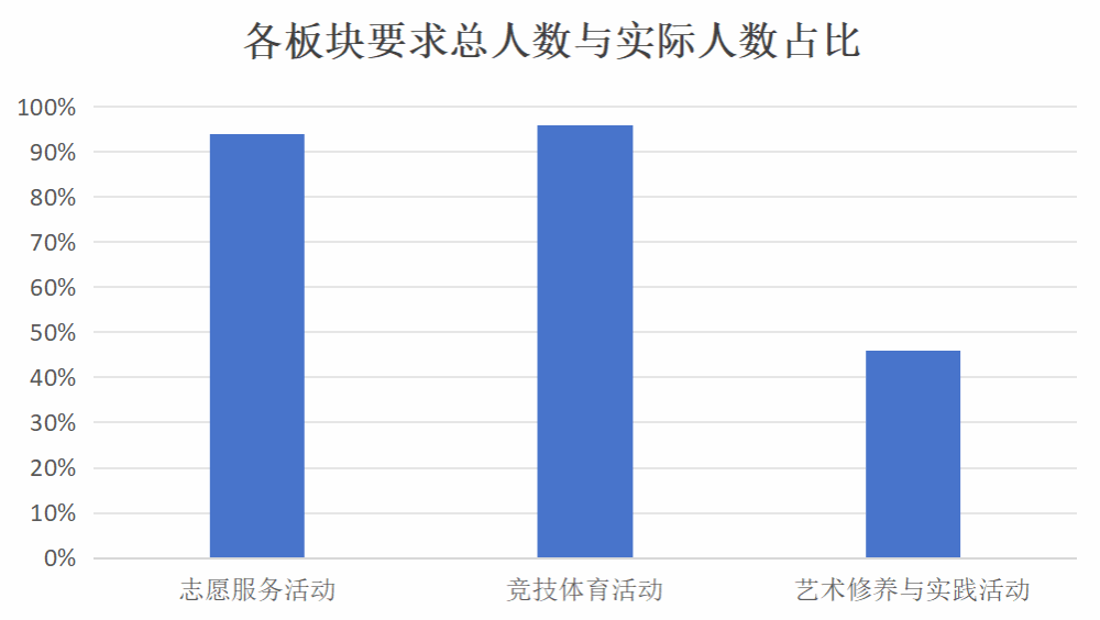 在智能工程学院的完满教育活动中不一样的板块活动规模大不相同,但从各个板块活动要求总人数和实际报名参加的人数可以看出,竞技体育活动参与人数最多,有参与率达到了96%,志愿者服务活动参与率达到了95%,艺术修养与实践活动达到了46%。
