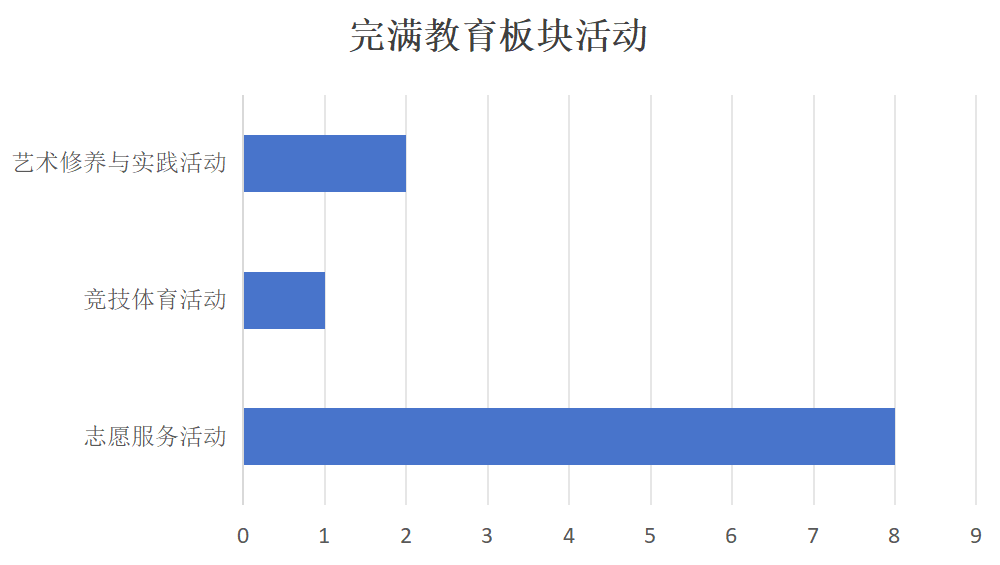 完满教育开展了各色各样的活动,它们可以帮助我们成长,提升我们的修养,其中校园社团活动可以参与各种社团活动,开拓我们的视野;艺术修养与实践可以陶冶我们的情操,提高我们的修养;志愿者服务可以让我们投身于社会公益活动,奉献于社会;而书院类活动是一项综合性很强的活动,包含着四大板块的所有性质。