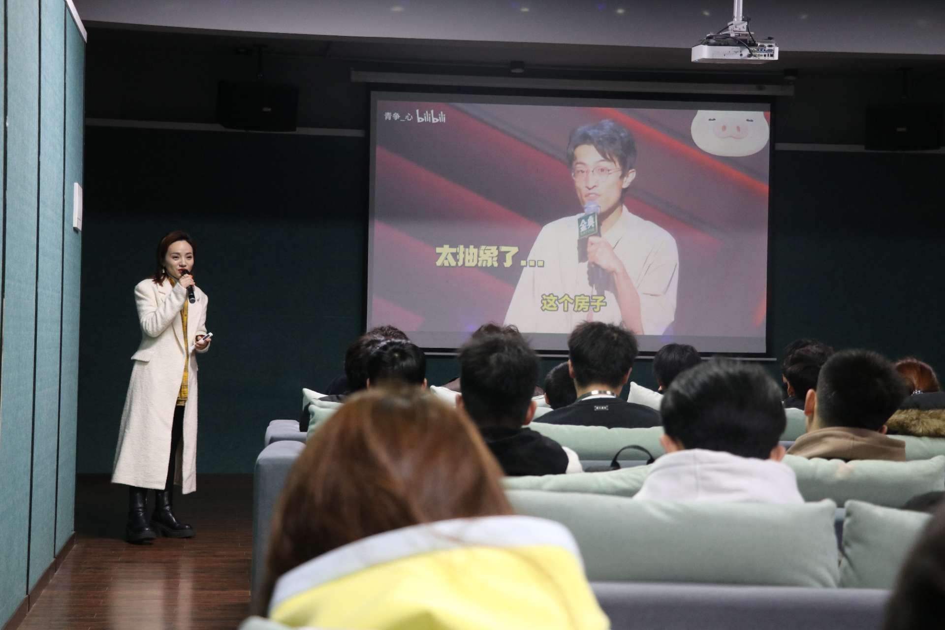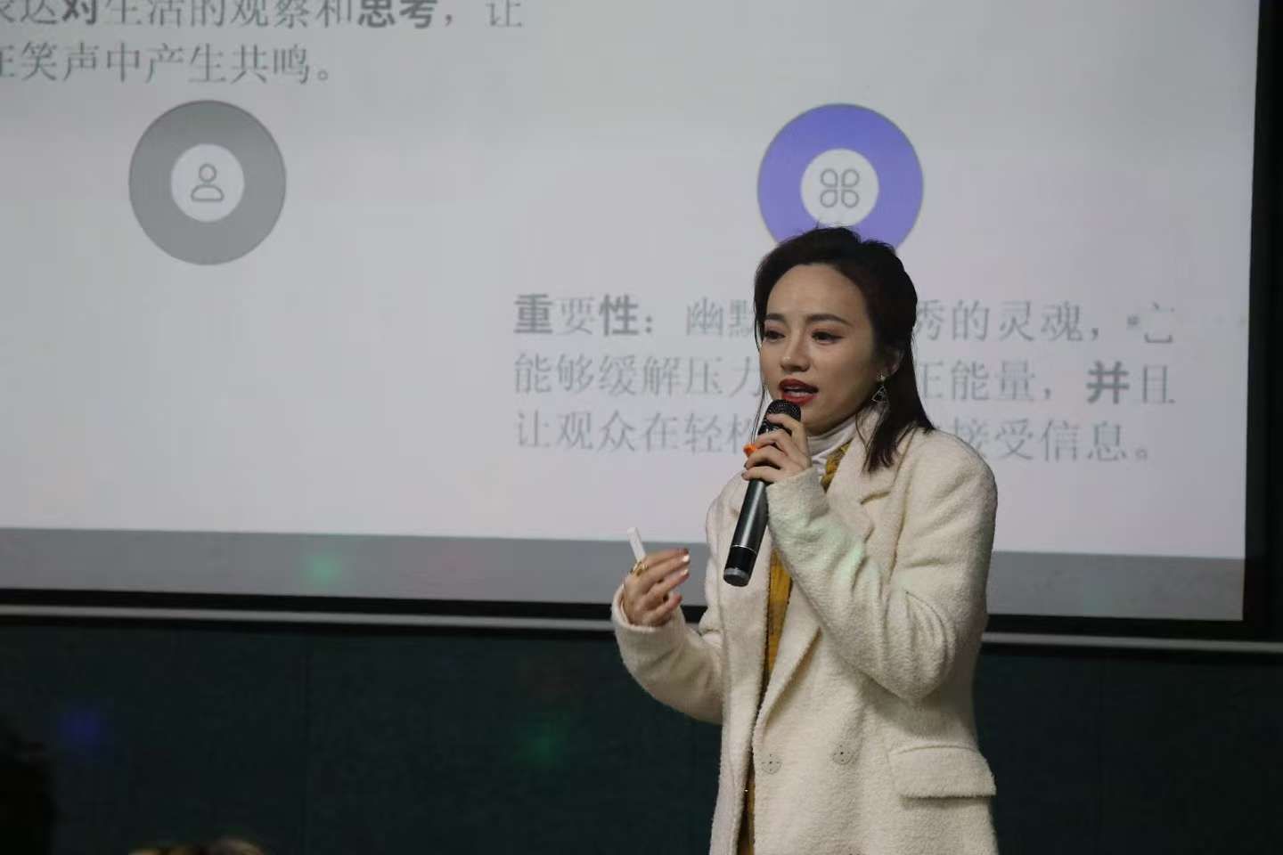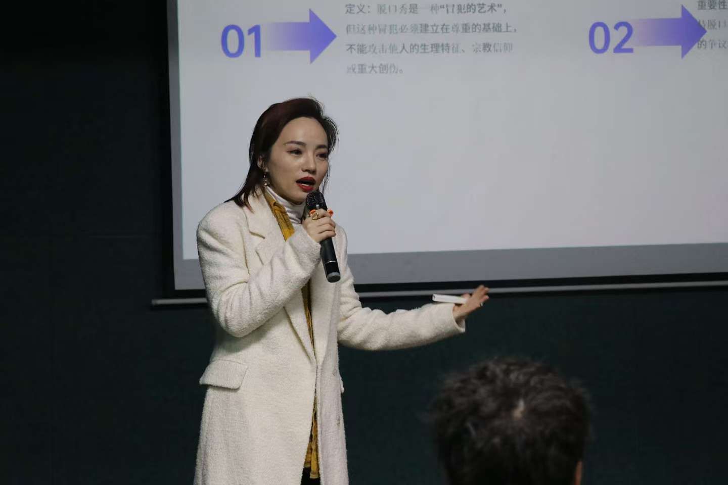同时,黄丽萍老师还通过播放优秀脱口秀视频,详细解读成功案例中的表达技巧。从开场的巧妙引入,到中间内容的层层递进,再到结尾的有力收束,每一个细节都不放过。选手们聚精会神地聆听,不时被屏幕上的演出者的话术逗得欢笑出声,也对表达上的语言艺术有了更深刻的理解。老师不仅传授技巧,还鼓励大家在日常生活和表达中积极借鉴脱口秀技巧,从而提升沟通与表达能力。