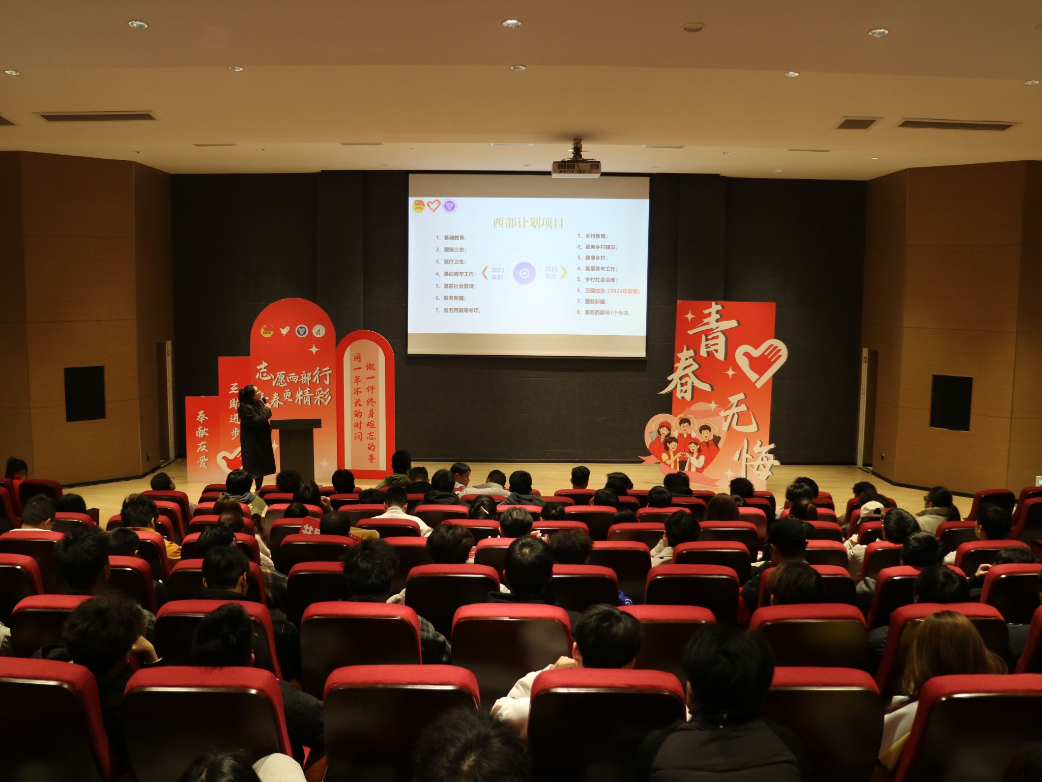 西部计划(全称“大学生志愿服务西部计划”)是由共青团中央、教育部、财政部、人力资源和社会保障部共同组织实施的一项重大人才工程。为深入贯彻国家关于推动西部地区发展的战略部署,鼓励青年学子投身基层、服务社会,智能工程学院青年志愿者协会于3月21日在六度空间105°学术报告厅举办了“青春无悔,筑梦西部”西部计划解读会。校团委志愿服务中心主任刘月老师、智能工程学院就业创业办公室主任李杨老师,辅导员陈林、黄一、方港利老师及目前服务于中共重庆市涪陵区委统一战线工作部的2024届西部计划志愿者石大山同学出席本次活动。