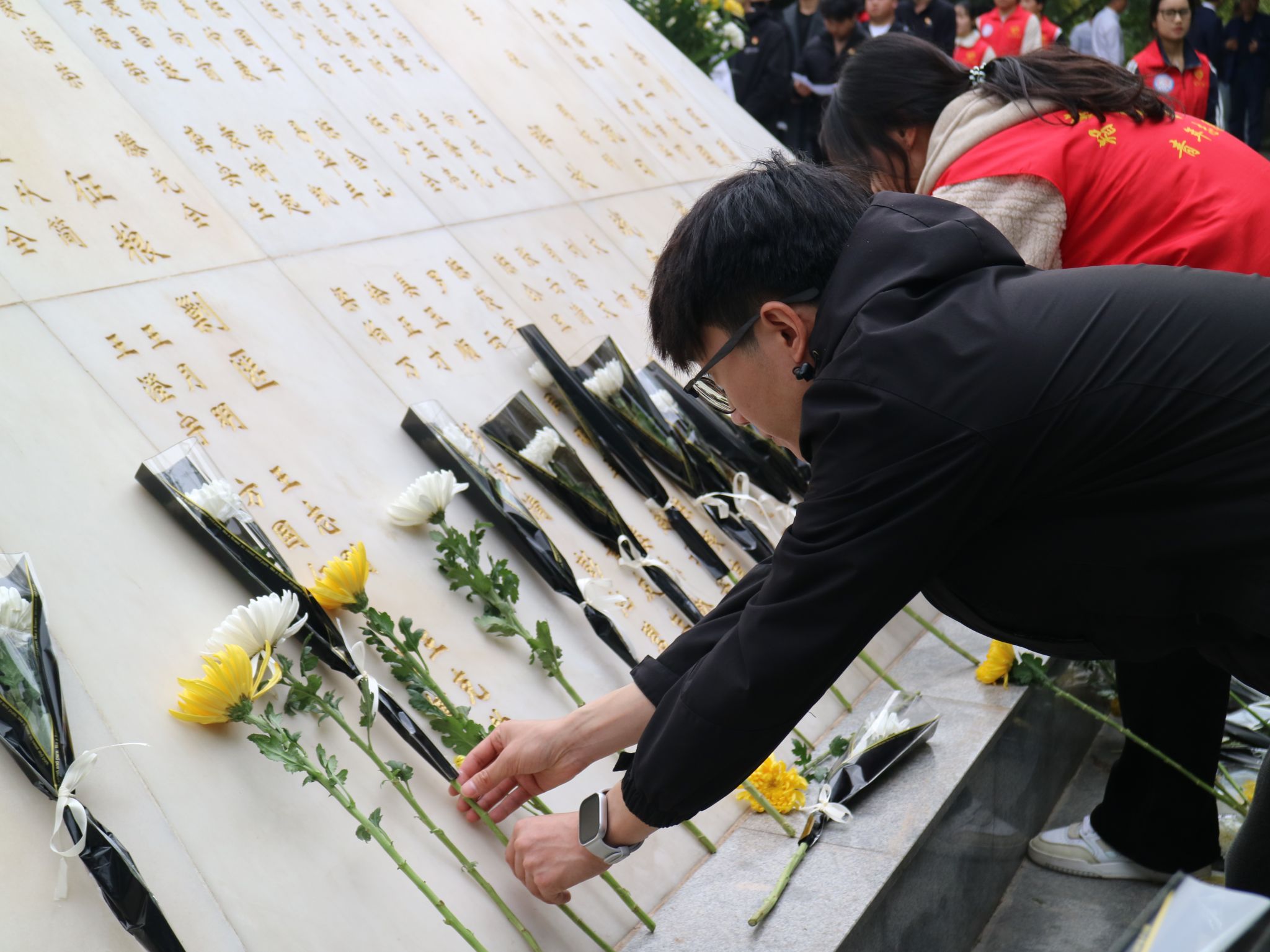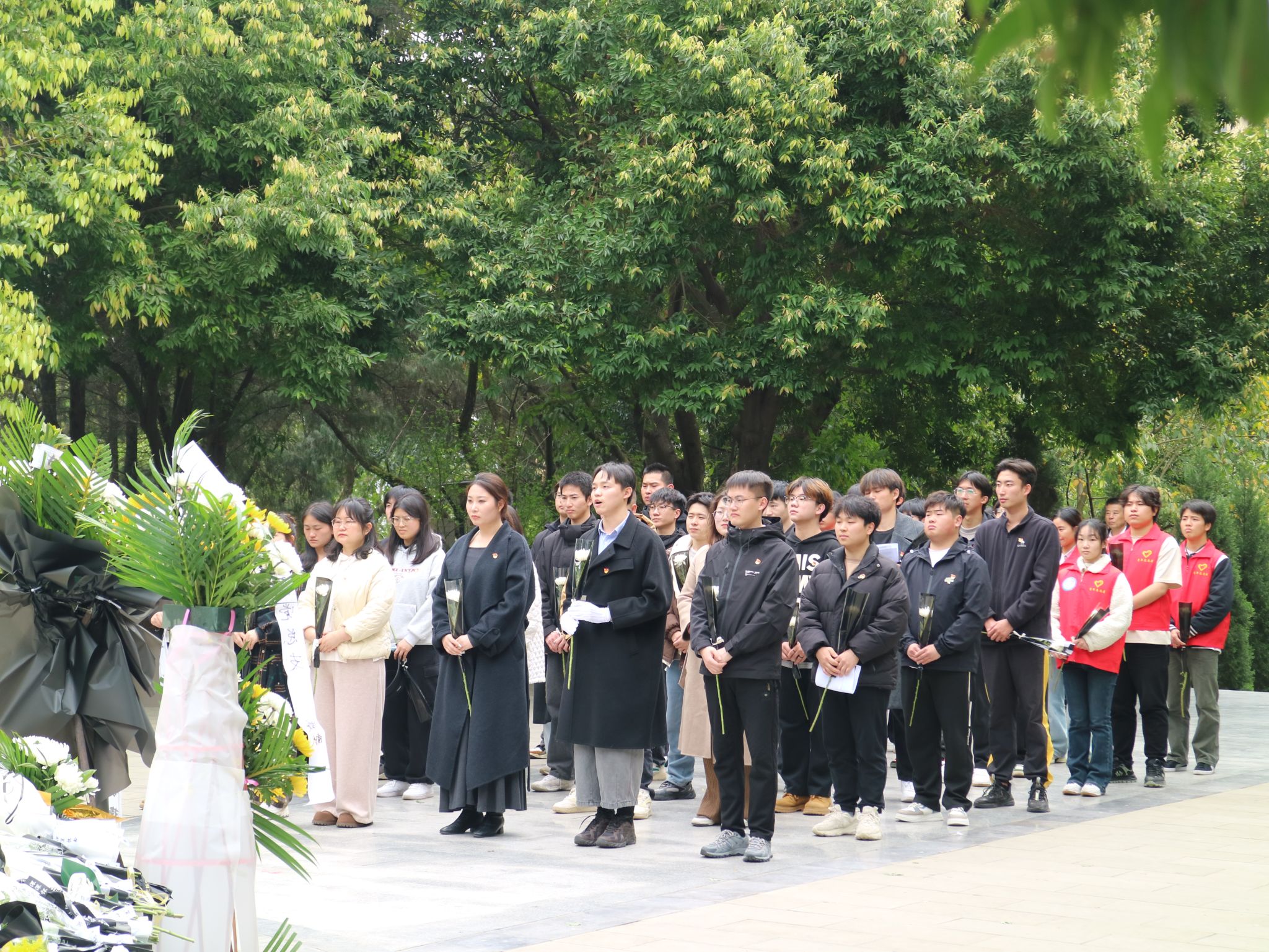 中午13时,烈士陵园内松柏苍翠,革命烈士纪念碑巍然矗立。全体人员整齐列队,神情肃穆。活动在激昂的《义勇军进行曲》合唱中拉开序幕,嘹亮的歌声回荡在陵园上空,表达对先烈精神的崇高敬意。随后,全体人员垂首肃立,向为国家和人民献出生命的革命先烈默哀三分钟,现场庄重肃然。默哀毕,参与人员缓步走向纪念碑,将手中的菊花轻轻摆放在碑前。朵朵白菊寄托着对先烈的深切缅怀,也象征着后人继承遗志、砥砺前行的坚定信念。