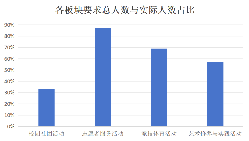 在智能工程学院的完满教育活动中不一样的板块活动规模大不相同,但从各个板块活动要求总人数和实际报名参加的人数可以看出,竞技体育活动参与人数最多,有参与率达到了69%,志愿者服务活动参与率达到了87%,艺术修养与实践活动达到了57%,校园社团活动参与率达到了33%。