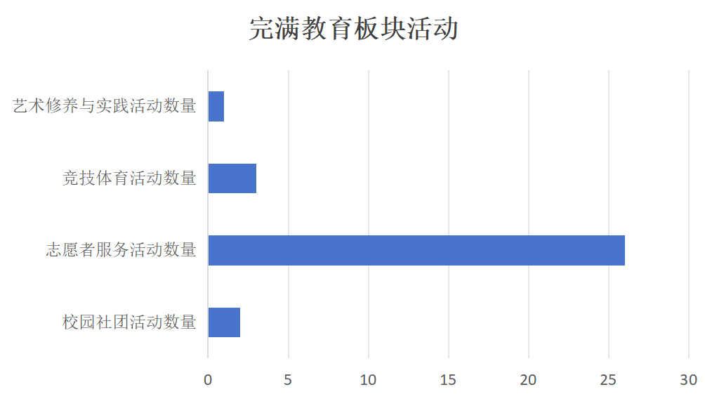 完满教育开展了各色各样的活动,它们可以帮助我们成长,提升我们的修养,其中校园社团活动可以参与各种社团活动,开拓我们的视野;艺术修养与实践可以陶冶我们的情操,提高我们的修养;志愿者服务可以让我们投身于社会公益活动,奉献于社会;而书院类活动是一项综合性很强的活动,包含着四大板块的所有性质。