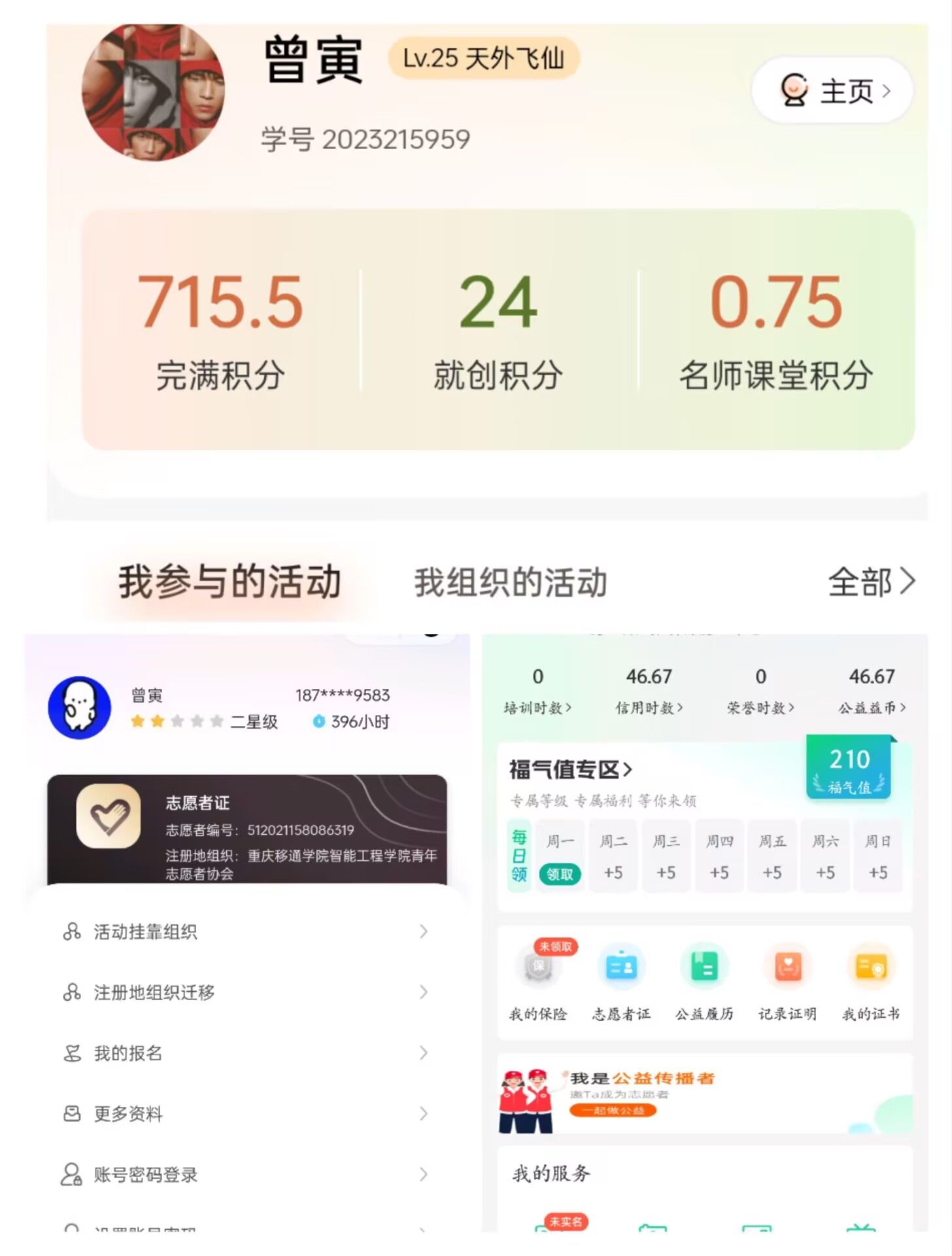 “442.67小时的志愿服务,带给我的远比我付出的多”曾寅表示到。未来他也将继续以共青团员的标准要求自己,带动更多同学参与志愿服务,让爱心在校园持续传递。从迷茫新生到志愿先锋,曾寅用行动证明:志愿服务是大学生成长的重要课堂。期待更多同学加入志愿行列,在奉献中收获成长!