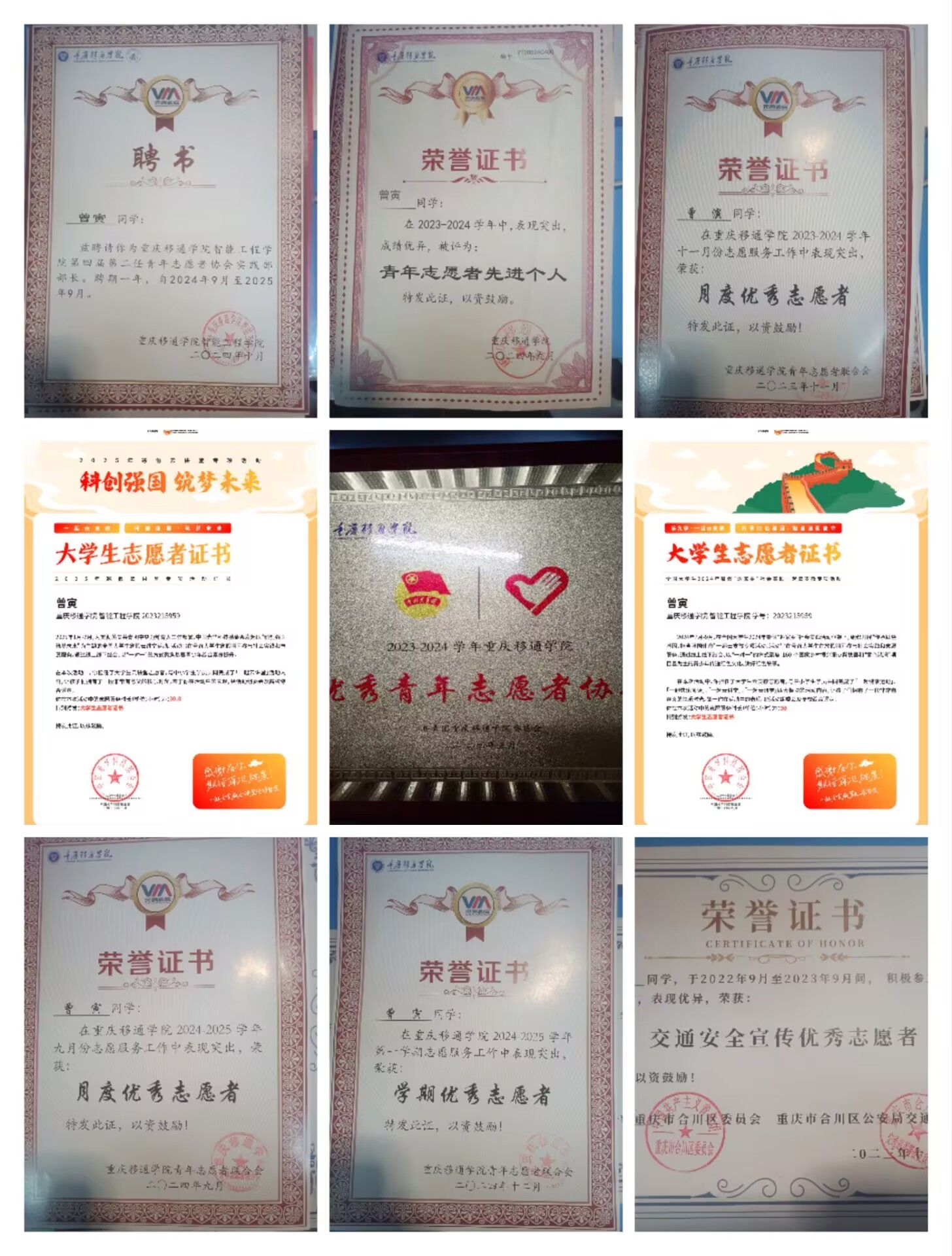 作为智能工程学院青年志愿者协会的骨干成员,曾寅先后参与了30余场大型志愿服务活动。从校园环保到社区服务,从支教助学到敬老爱老,处处都能看到他忙碌的身影。“记得第一次带队做交通劝导时紧张得手心冒汗”他回忆道,“但看到市民们配合的样子,所有的付出都值得了”。在青协工作的日子里,他不仅提升了组织协调能力,更深刻体会到奉献的快乐。