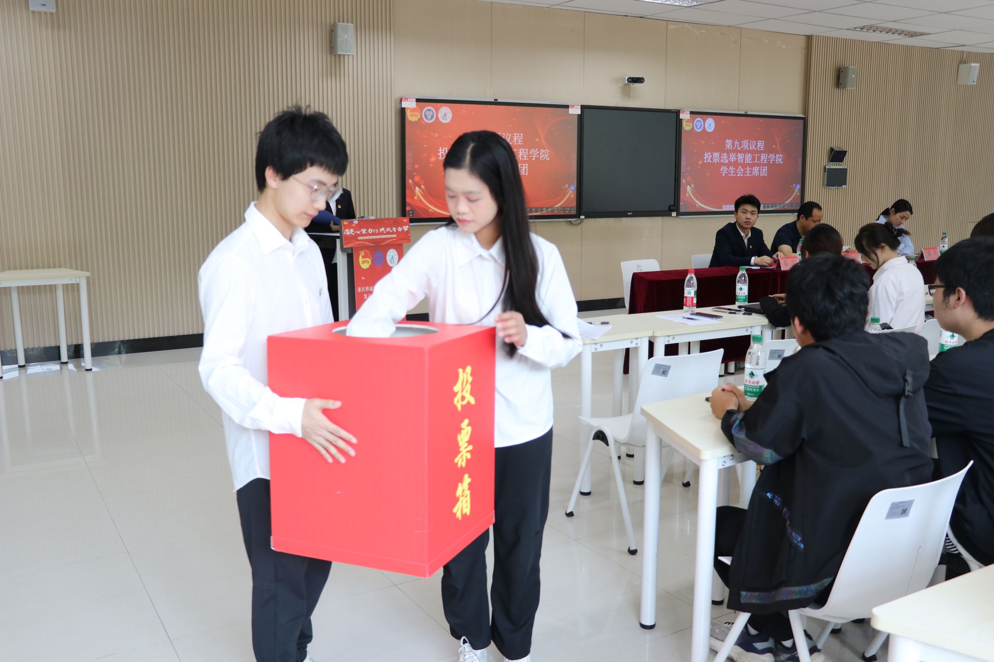 紧随其后是对学生会章程的解读,让各位学生代表了解学院学生组织的构造、宣读重庆移通学院智能工程学院第六次学生代表大会选举办法。随后,介绍新一届智能工程学院学生会主席团候选人,对四位候选人进行学生组织工作介绍,全体学生代表秉持着公平、公正、公开的原则,选举智能工程学院第四届第二任学生会主席团成员。根据大会选举办法的规定和选举计票结果,杨旭、黄佳敏、黄思源3位同学脱颖而出,当选为重庆移通学院智能工程学院第四届第二任学生会主席团成员。会议最后由团总支书记张颖超老师进行讲话,针对本次学生代表大会的开展进行了总结,肯定会议成果,并对未来工作提出期望。