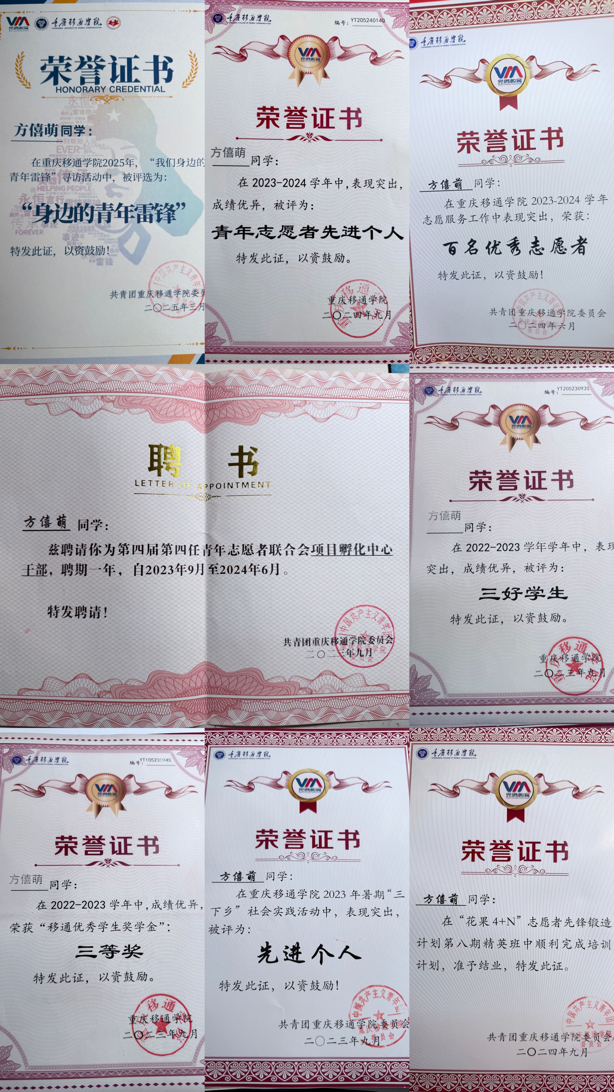 自入学以来,方僖萌便以高标准要求自己,积极进取、努力学习,在各方面不断突破。学习方面,方僖萌综合成绩排名年级前二十,班级排名第一,荣获学校优秀三等奖学金、校三好学生等个人荣誉15项。同时,在保证学业成绩的前提下,方僖萌也积极参加学校完满教育活动,大一便加入校青年志愿者联合会,在一次次工作中锻炼提升自己,磨砺自我。
