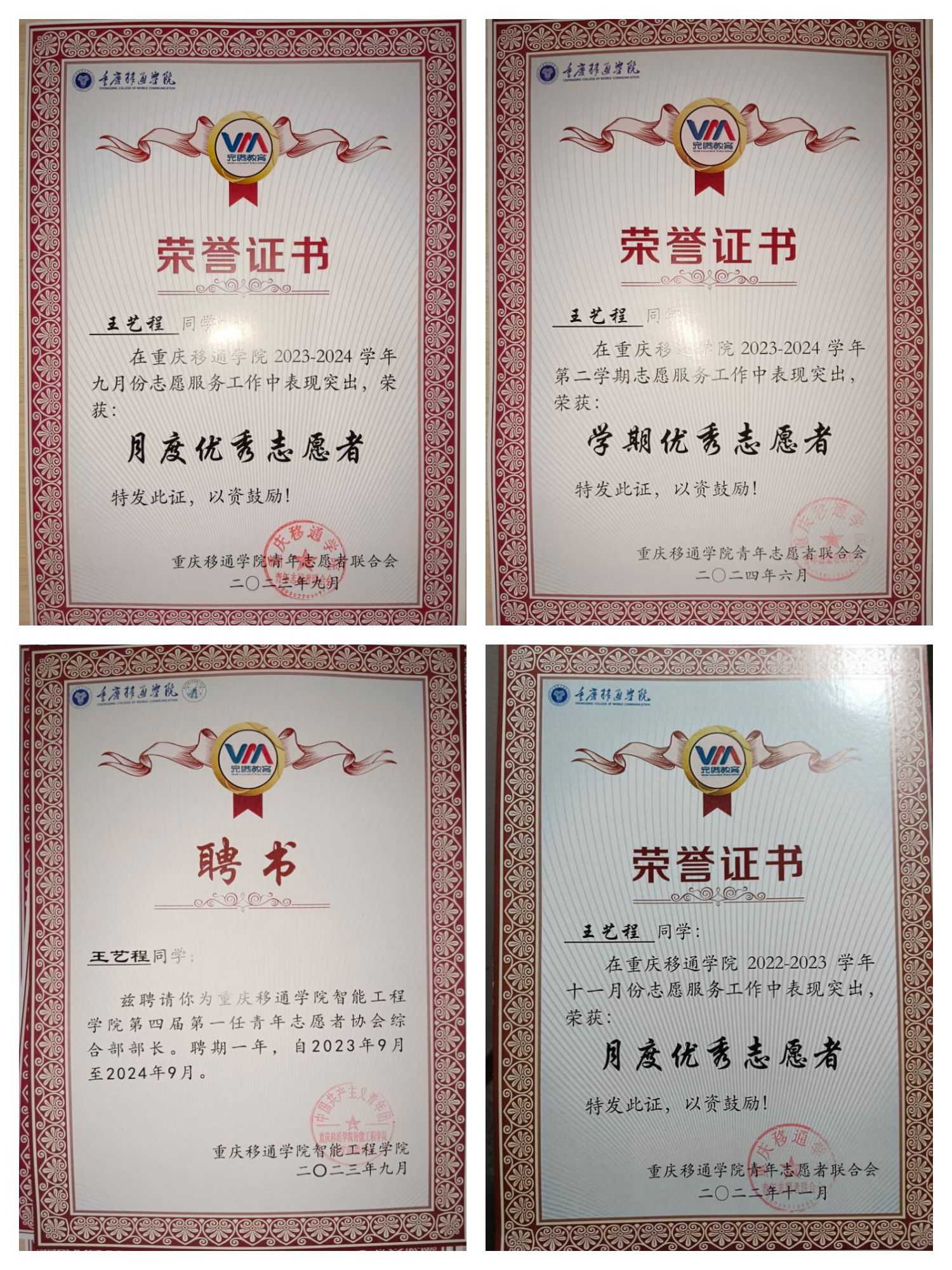“道阻且长,行则将至”。累计166小时的志愿服务时长,见证了王艺程的付出与成长。他荣获全国暑期三下乡优秀图片奖、校级青年雷锋称号以及学期和月度优秀志愿者先进个人等诸多荣誉。未来,他将继续以预备党员的高标准要求自己,带动更多同学加入志愿队伍,让志愿精神如星星之火,在校园中形成燎原之势。从初涉志愿的懵懂青年,到如今的志愿先锋,王艺程用行动证明:志愿服务是大学生成长的生动课堂,在奉献中,青春将绽放出更加绚烂的光彩。