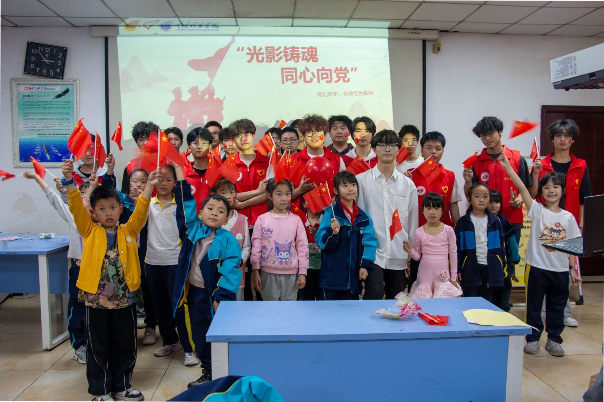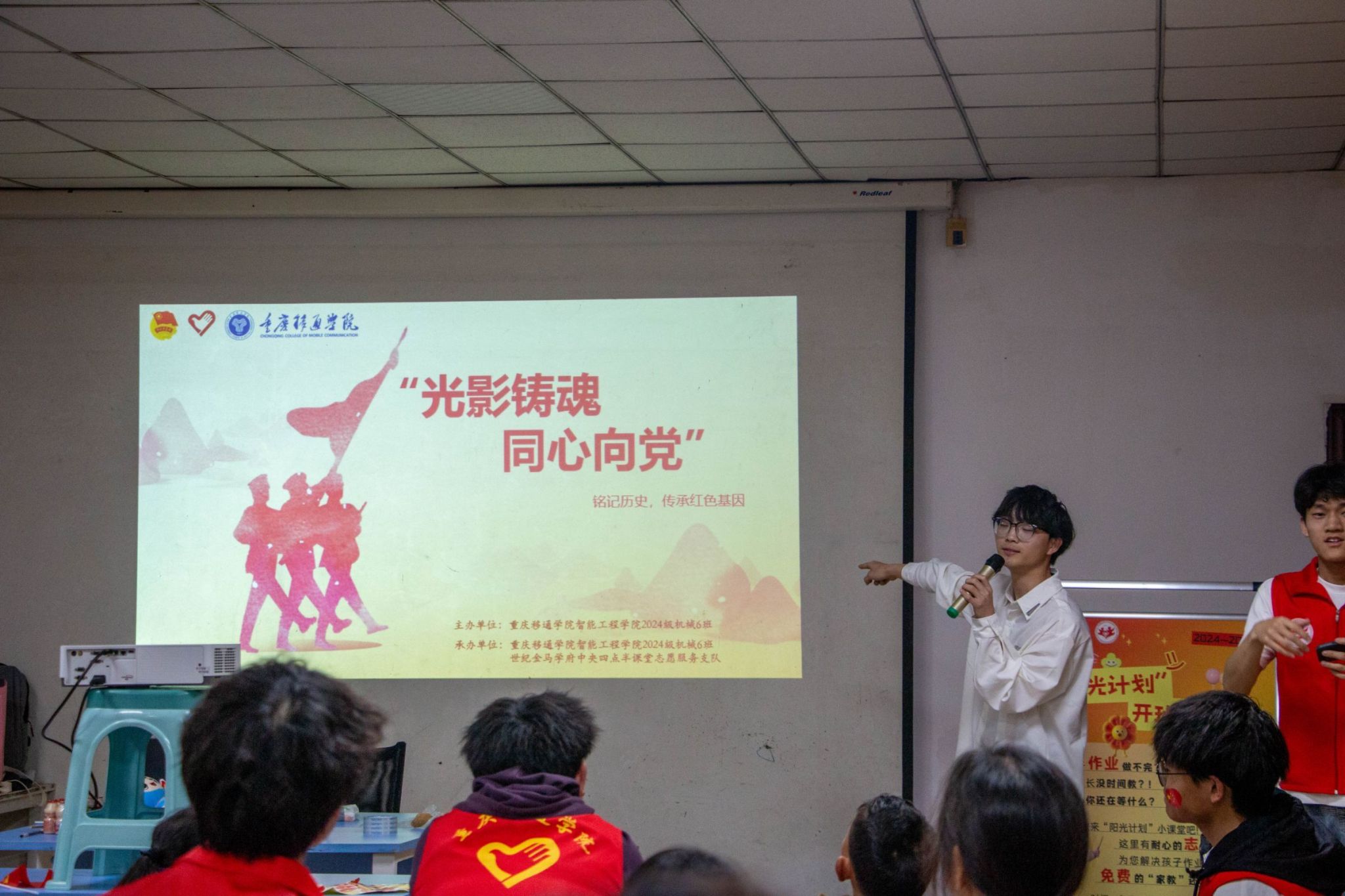 中国共产党从风雨中走来,带领人民建立新中国,走向繁荣富强。每一个光影片段,都是历史的见证,是精神的传承。为纪念抗日战争胜利80周年,弘扬爱国精神,传承红色基因,帮助青少年树立正确的历史观和价值观。重庆移通学院智能工程学院2024级机械类6班携手世纪金马学府中央“四点半”课堂志愿服务支队,在世纪金马中央学府举办“不忘初心 牢记使命——红色观影志愿活动”。