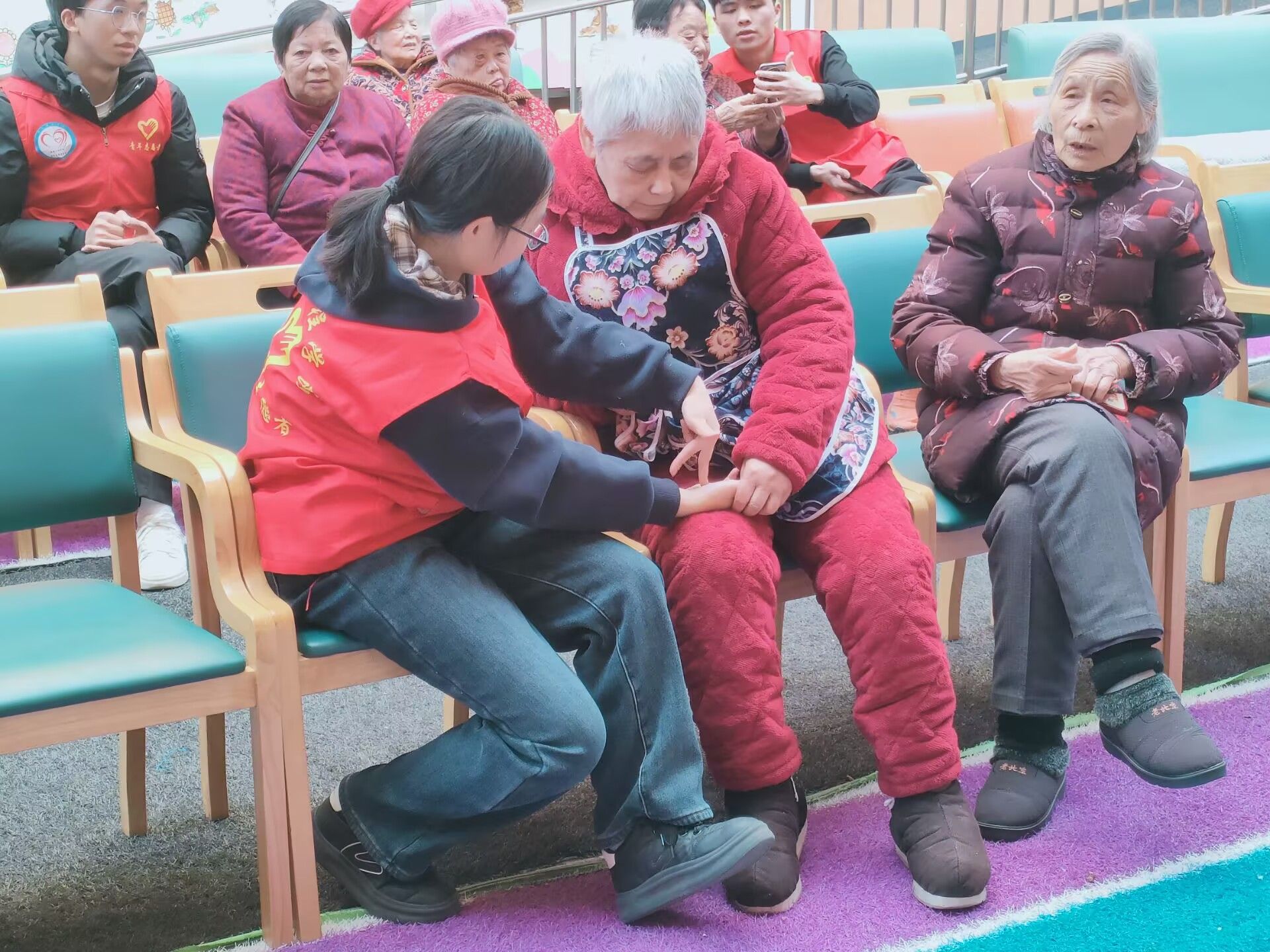 在这次敬老院活动中,青年志愿者们躬身力行,坚持以行动去帮助老人,让他们感受来之大学生们的关心与照护。活动伊始,青年志愿者来到当地的康乐老年公寓,为老人们带去来自新时代青年的殷切关心。志愿者主动地向老人进行聊天,与他们谈谈家常,了解老人的家庭情况,谈谈老人身体有哪些不便。青年志愿者会细心的去发现问题,并解决问题:遇到腿脚不方便的,会主动搀扶:看到手部灵活的,会主动按摩,舒缓筋骨。