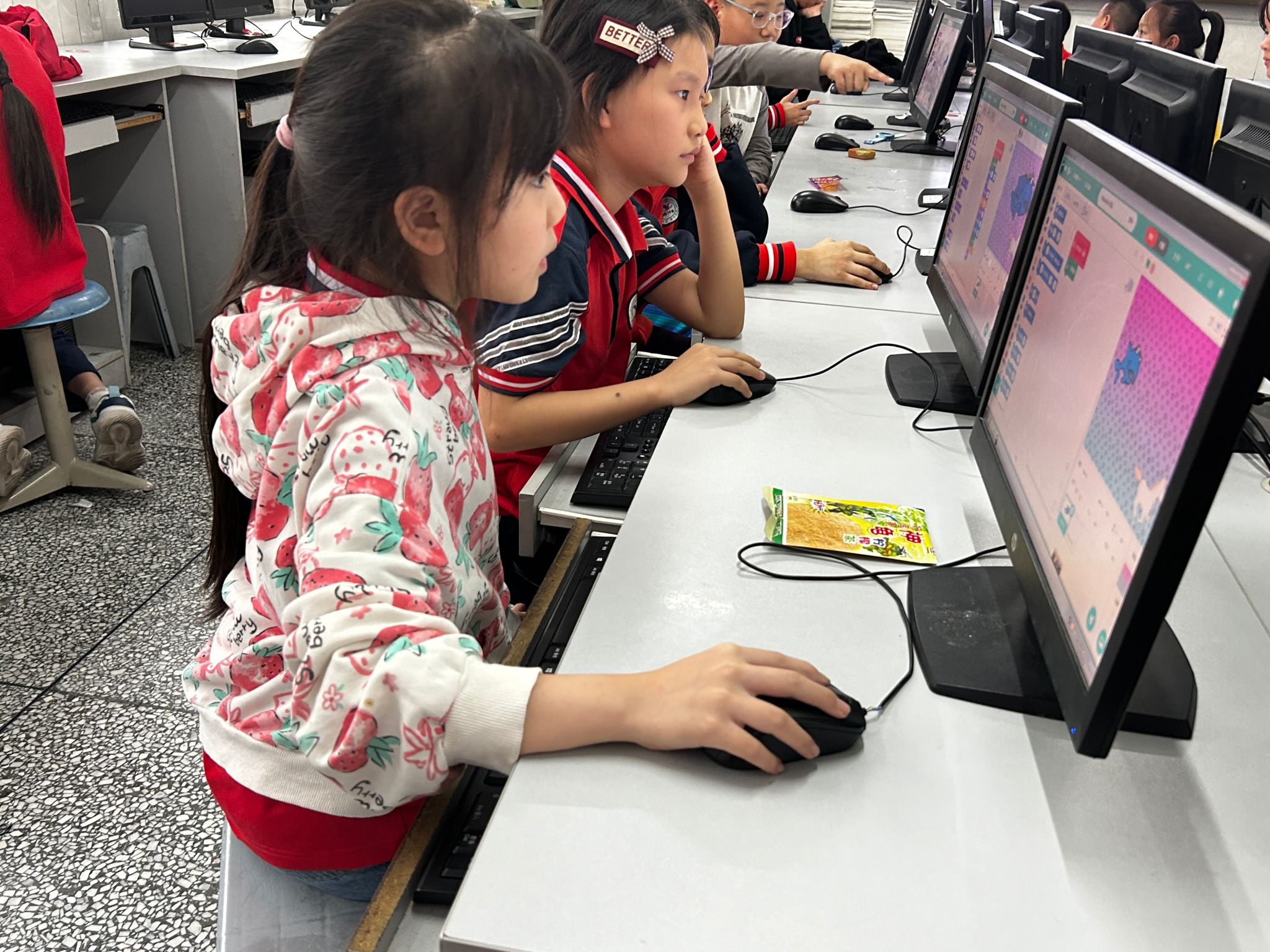 2024年10月25日,志愿者们去到学昌门小学进行基础编程教学,第一节课志愿者带领同学们回顾了上节课所用到的脚本,发现同学们都成功的掌握到了学过的知识。接着学习了新脚本,虽然这节课运用到的脚本比较复杂,但是同学们听的很认真,不懂的问题也有及时提出,随后志愿者便提出今天的目标——鲨鱼特效,志愿者对操作过程进行了讲解随后便将时间交给了同学们。第二节课同学们认真做着本节课的目标,不懂的步骤举手向志愿者询问,有迅速完成的同学也有较慢的同学,但最终同学们都完成了本节课的目标,收拾好电脑桌椅,同学们有序离开教室