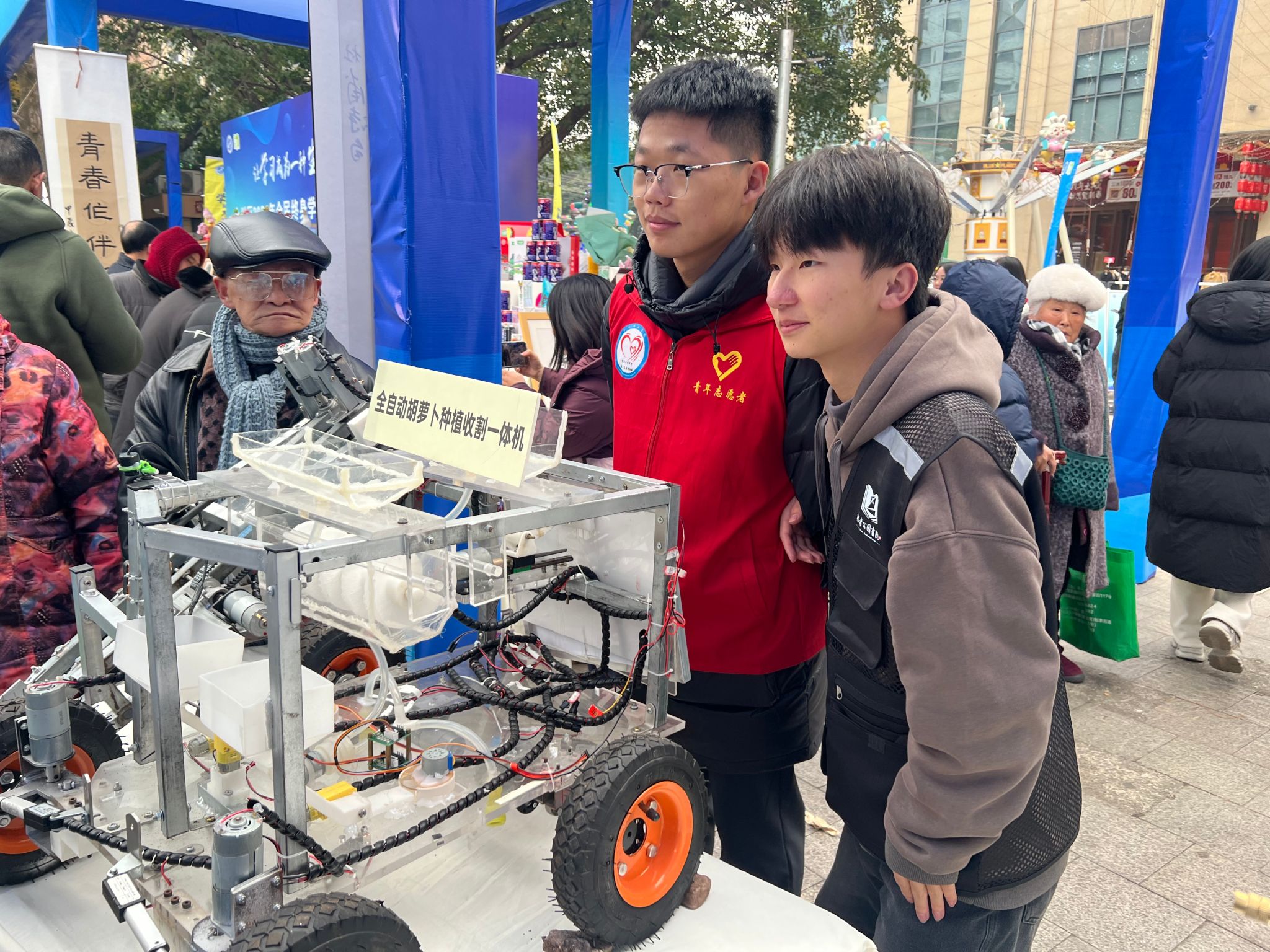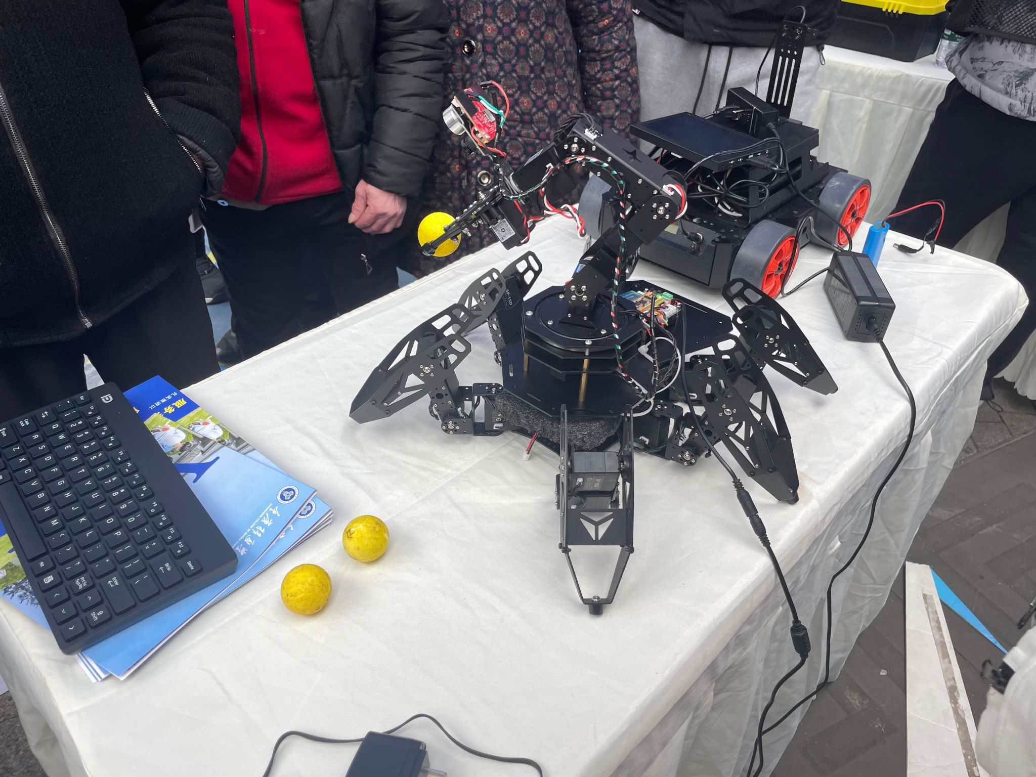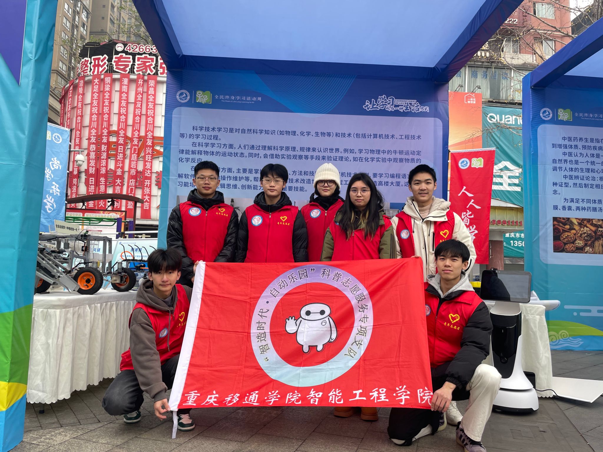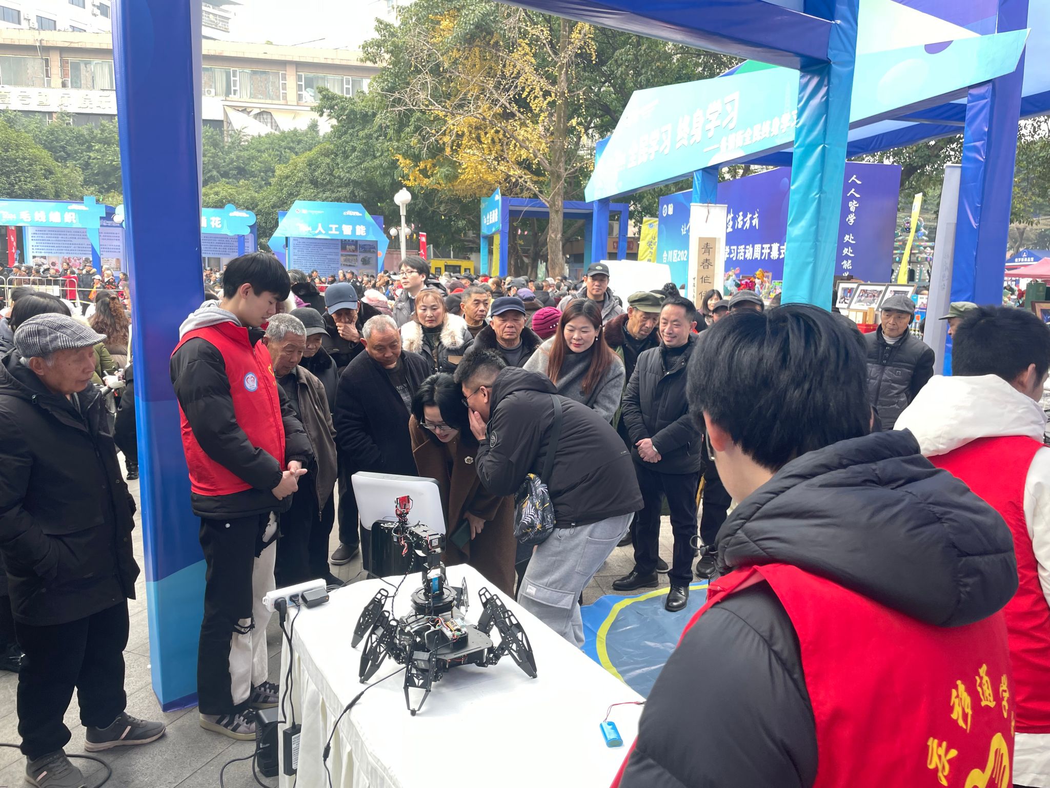 2024年12月25日星期三,智能工程学院智造时代的支队员们经区委区政府的同意,在合阳城街道塔尔门广场参加了合川区2024年全民终身学习活动开幕式,在广场布置了科技展台。