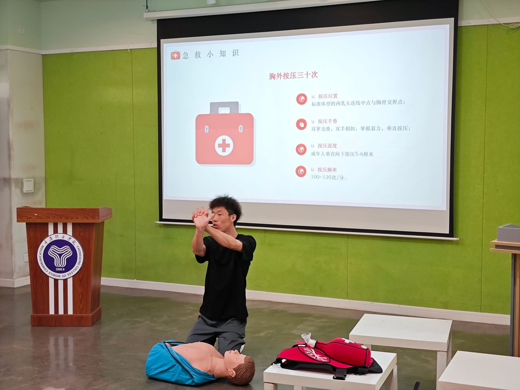 活动中,李刚同学走上讲台,为大家详细讲解心肺复苏术(CPR)。他一边操作模拟假人,一边细致地解说:“在发现有人心脏骤停时,先要确保现场环境安全,然后快速判断患者意识和呼吸。若患者无意识且无呼吸或仅有濒死叹息样呼吸,应立即呼叫急救并开始心肺复苏。双手交叠,垂直按压患者两乳头连线中点,频率至少100次/分钟 ,深度5 - 6厘米,每按压30次,进行2次人工呼吸。”讲解结束后,浦绍党同学通过李刚同学的分享积极上前给同学们进行演示,眭凯和浦绍党同学积极补充,强调了按压位置准确、力度稳定以及避免过度通气等要点。