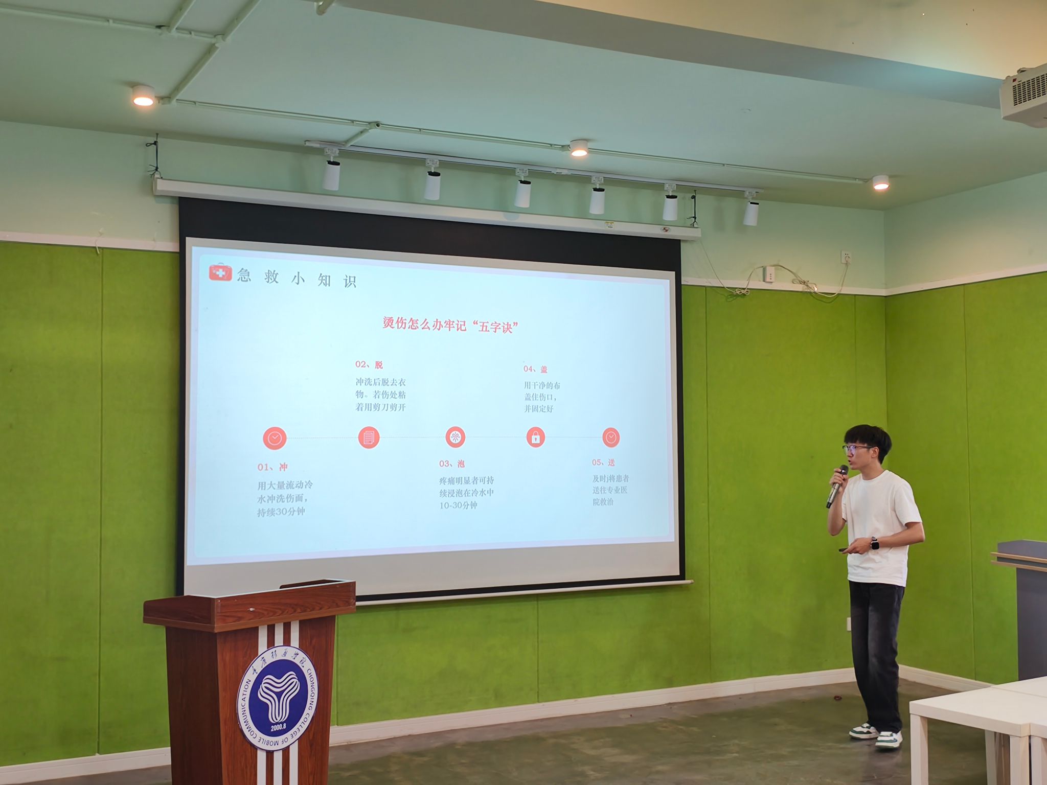 针对烫伤这一常见意外,同学们共同总结出“冲、脱、泡、盖、送”五字诀。先用流动的凉水冲洗烫伤部位15 - 30分钟降温,再小心脱去受伤部位衣物,接着将伤处浸泡在冷水中缓解疼痛,随后用干净纱布或毛巾覆盖伤口,最后尽快送往医院治疗。