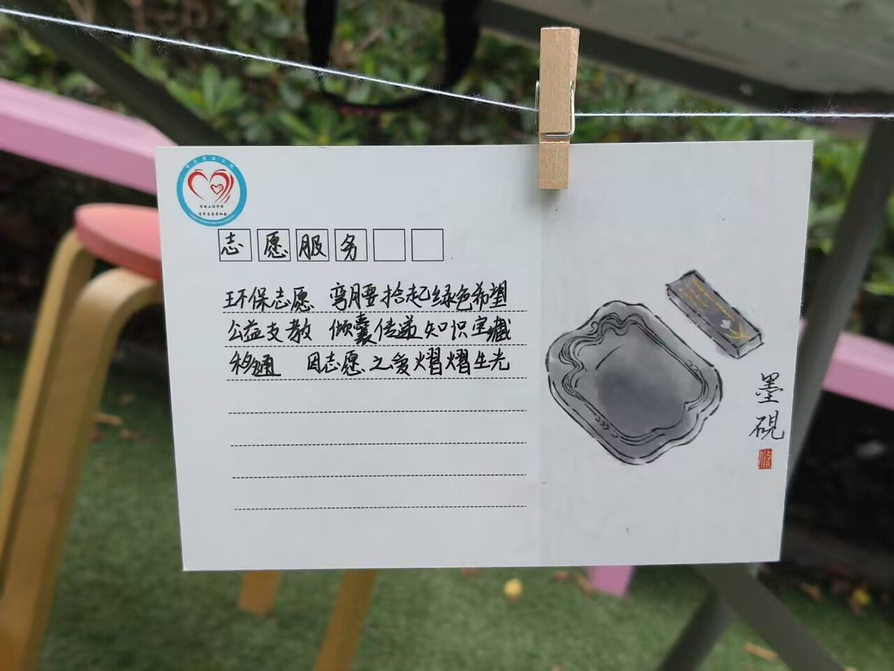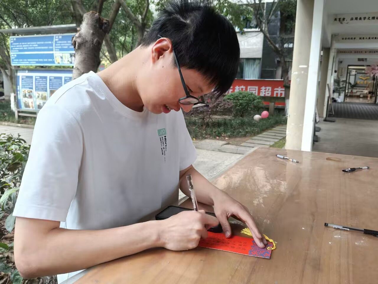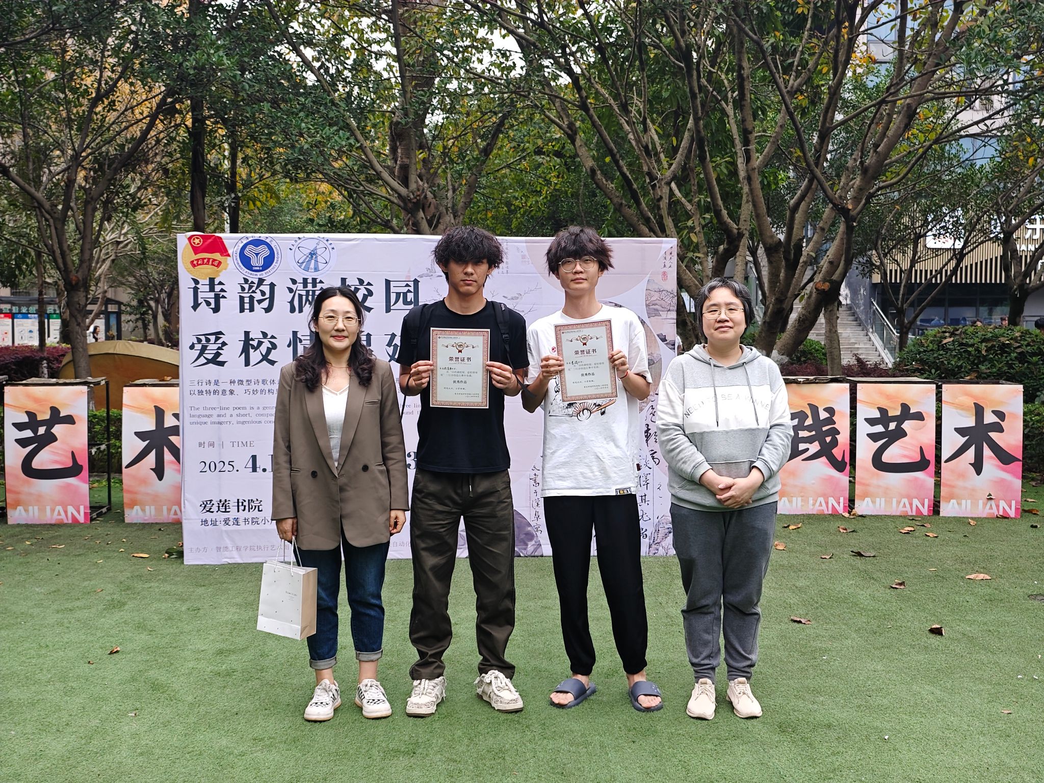 活动后期,经过来自创意写作学院的顾皓然老师的收集与评选,一批优秀作品脱颖而出。这些优秀的三行诗被精心打印到明信片和卡纸上,并于4月11日11时至13时在爱莲小广场进行展示,吸引了众多师生驻足欣赏。现场还摆放着毛笔、卡纸、精美书签等创作工具,为同学们提供了现场创作的空间。不少同学拿起笔,在现场挥毫泼墨,将自己对校园生活的感悟凝练成动人的诗句。活动现场还邀请了来自智能工程学院的两位异科导师——陈华艳、李乐艳,对优秀作品创作者进行了颁奖,表彰他们的精彩创作,获奖者们脸上洋溢着自豪的笑容。