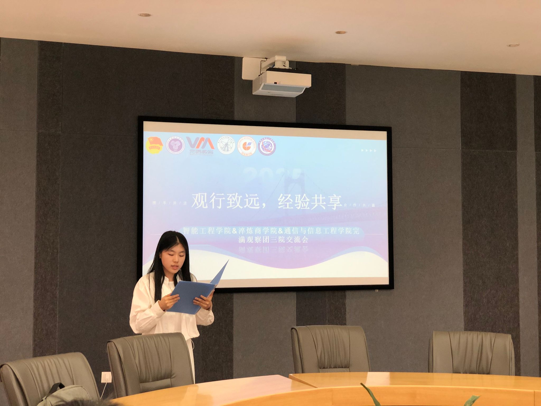 2025年5月14日中午12时30分,智能工程学院、淬炼商学院、通信与信息工程学院完满观察团齐聚南湖书院圆桌会议室,以“观行致远,经验共享”为主题开展跨界交流活动。三院观察团指导老师及观察团成员代表共赴思想之约,通过主题分享与深度研讨,共商完满观察团实践新路径。交流会在诗意开场中拉开帷幕,主持人点明活动旨在搭建思想碰撞平台,随后各学院观察团代表依次分享。