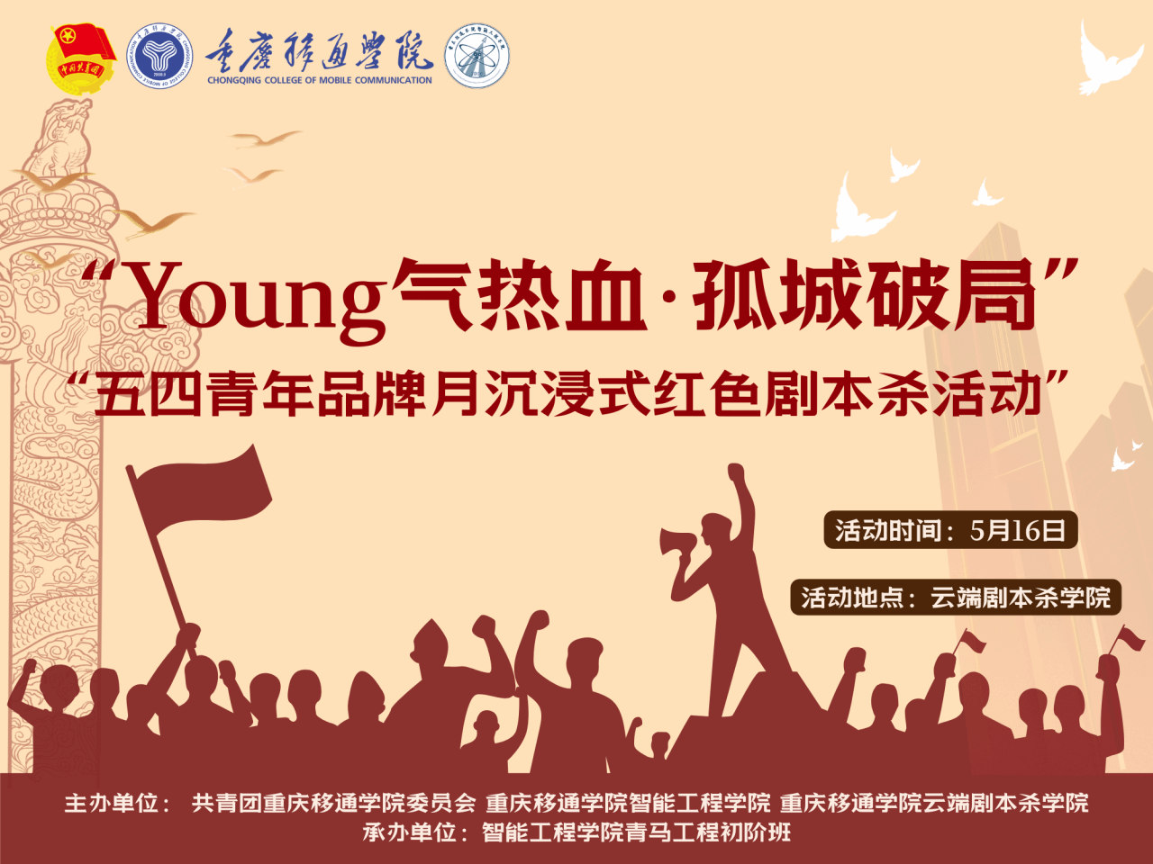 为传承和弘扬五四精神,打造五四品牌月子活动特色IP,5月16日,智能工程学院与云端剧本杀学院,于廊桥苑联合举办第七期“青马工程完满教育学生骨干培养计划”实践课——“Young 气热血・孤城破局”沉浸式红色剧本杀活动。