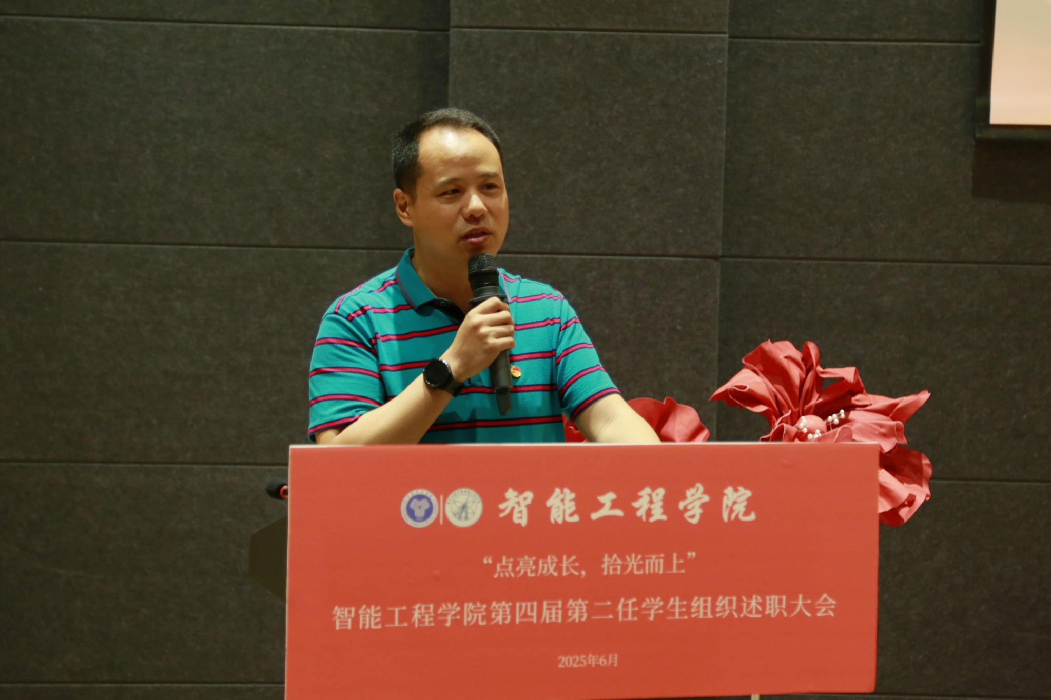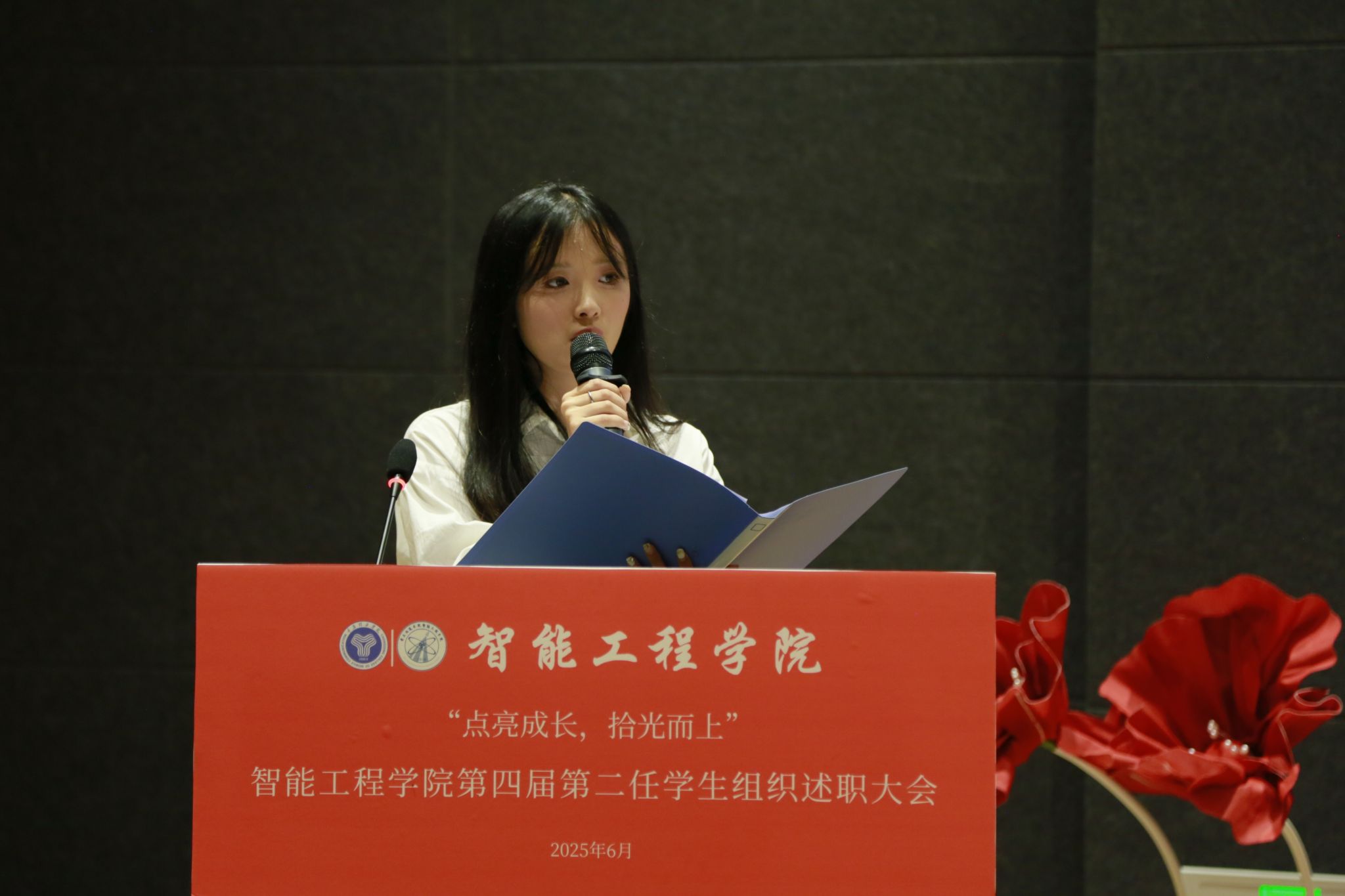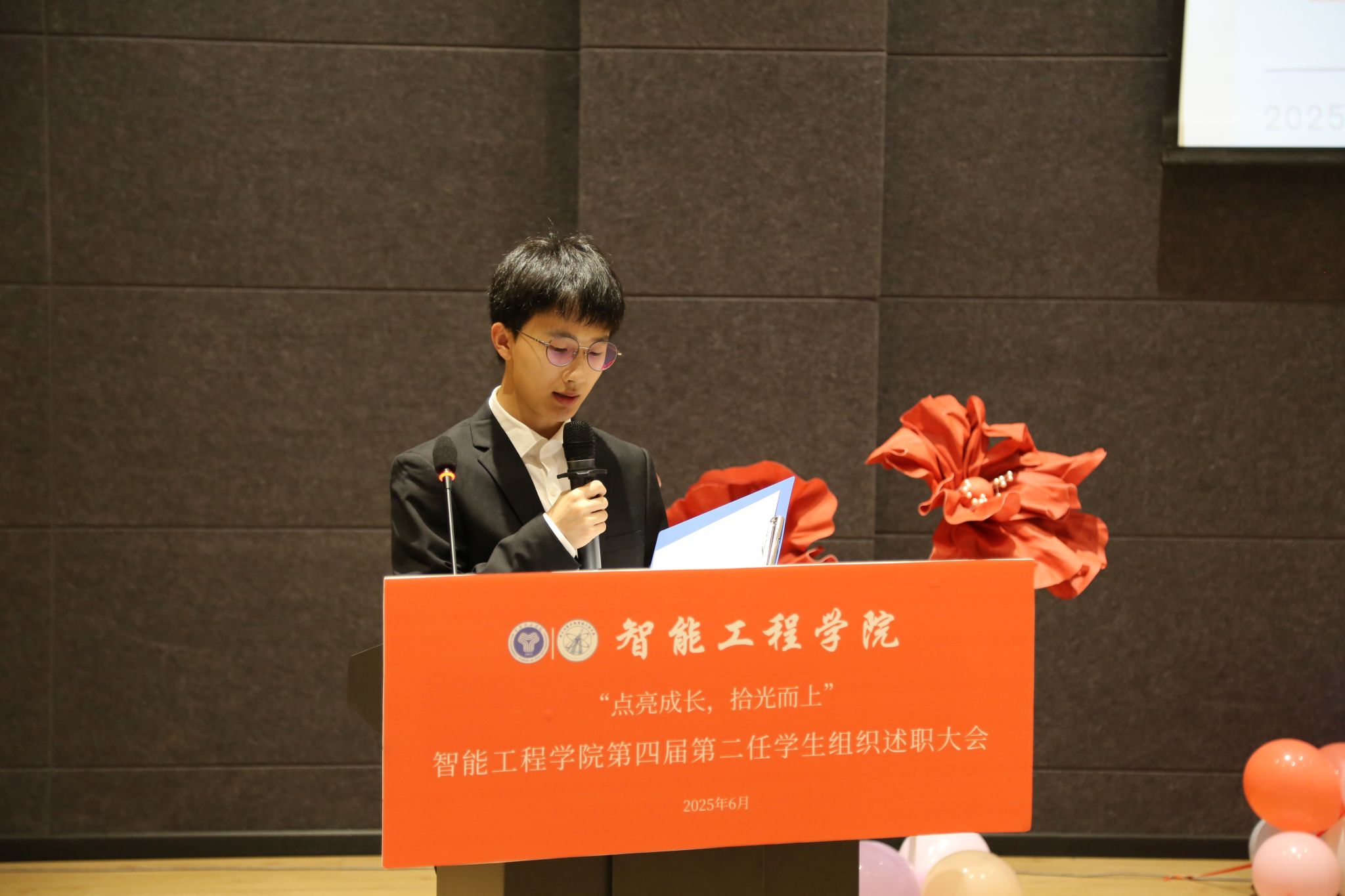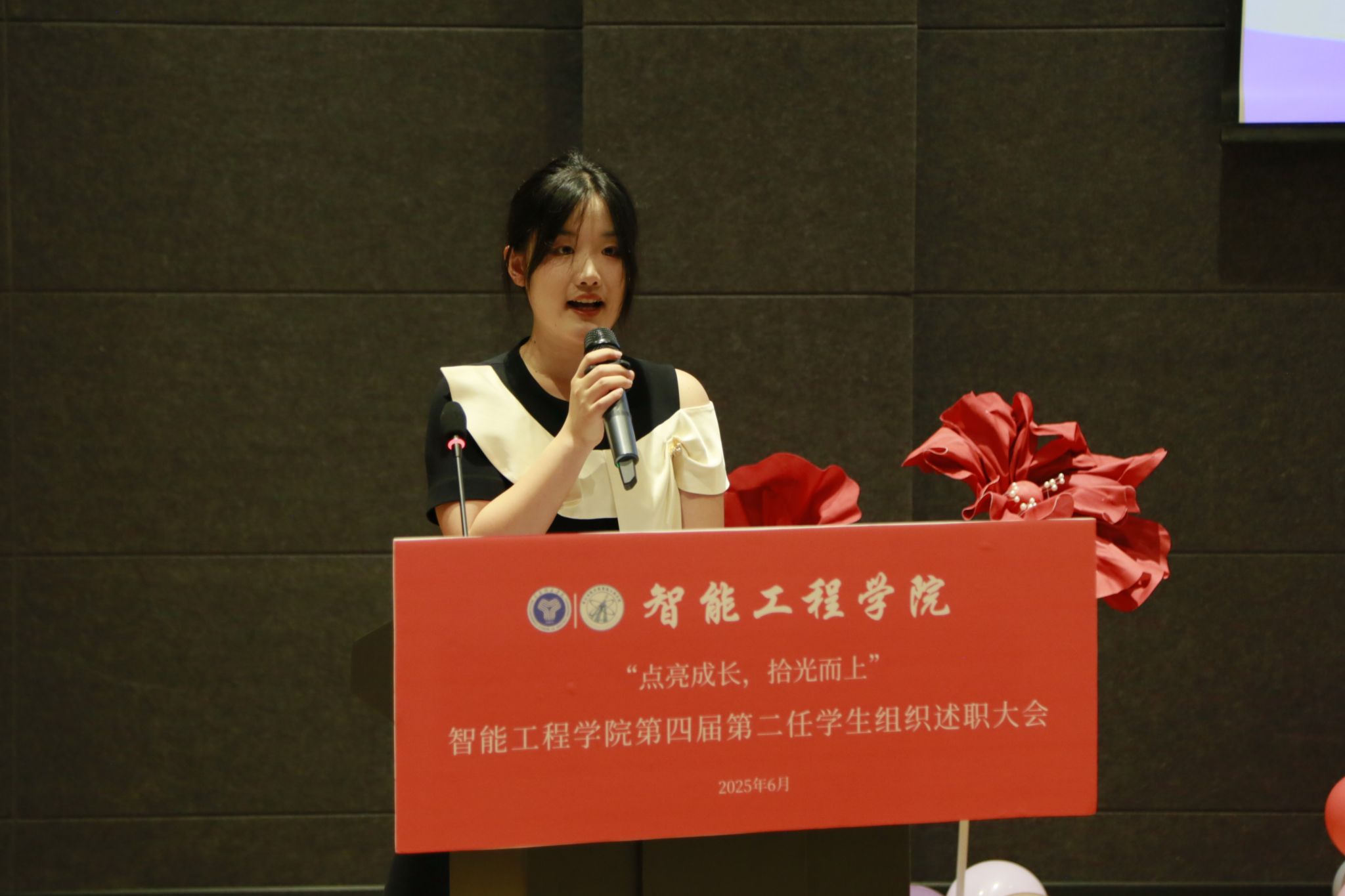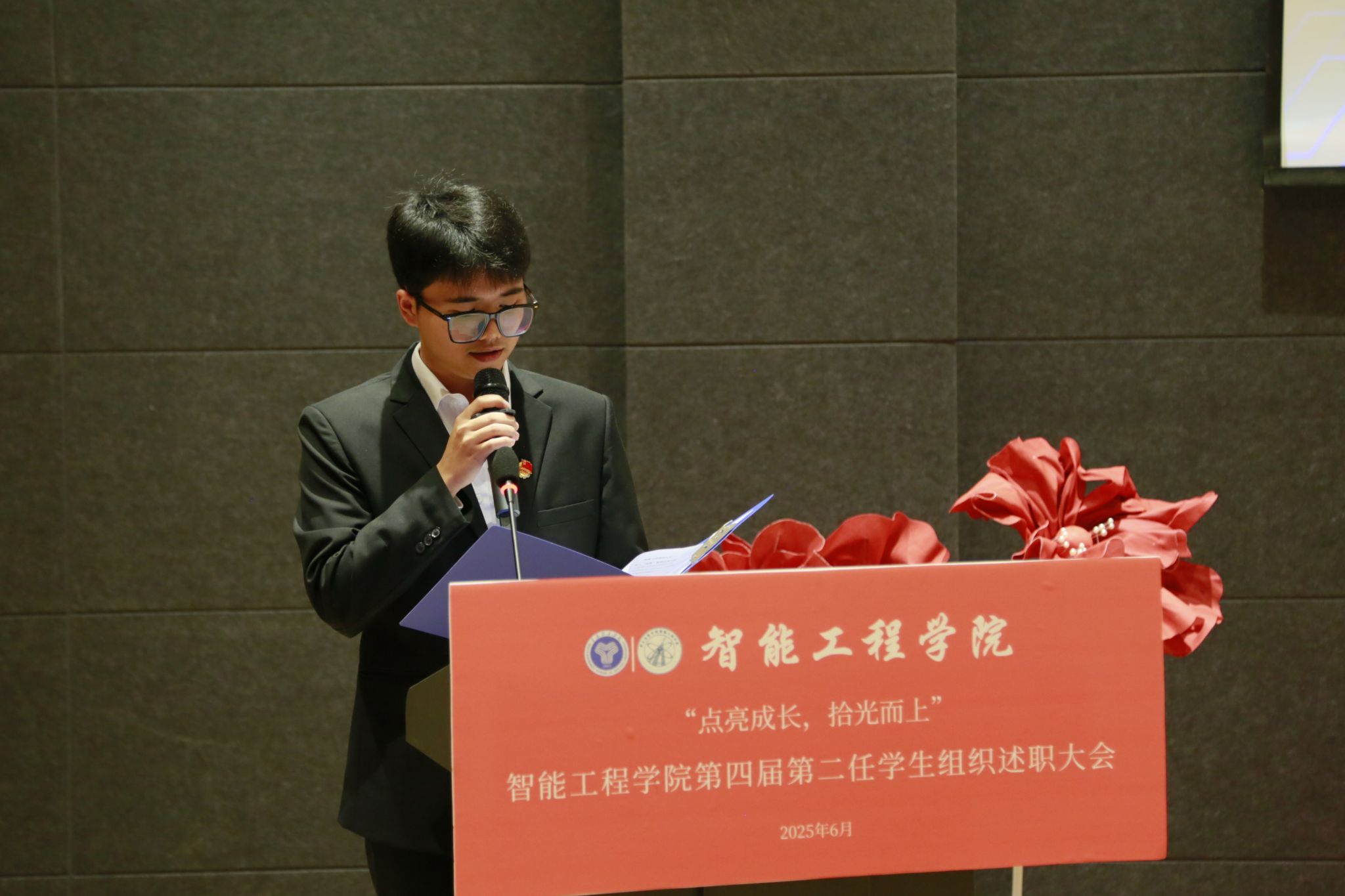 智能工程学院祝玮副院长首先发表致辞,他对学生组织过去一年的工作给予了充分肯定,赞扬了成员们在服务同学、助力学院发展中展现出的责任与担当,同时也对接下来的工作提出了殷切期望,鼓励大家在新的起点上继续秉持初心,开拓创新。 接着,四届二任主席团代表依次进行述职。