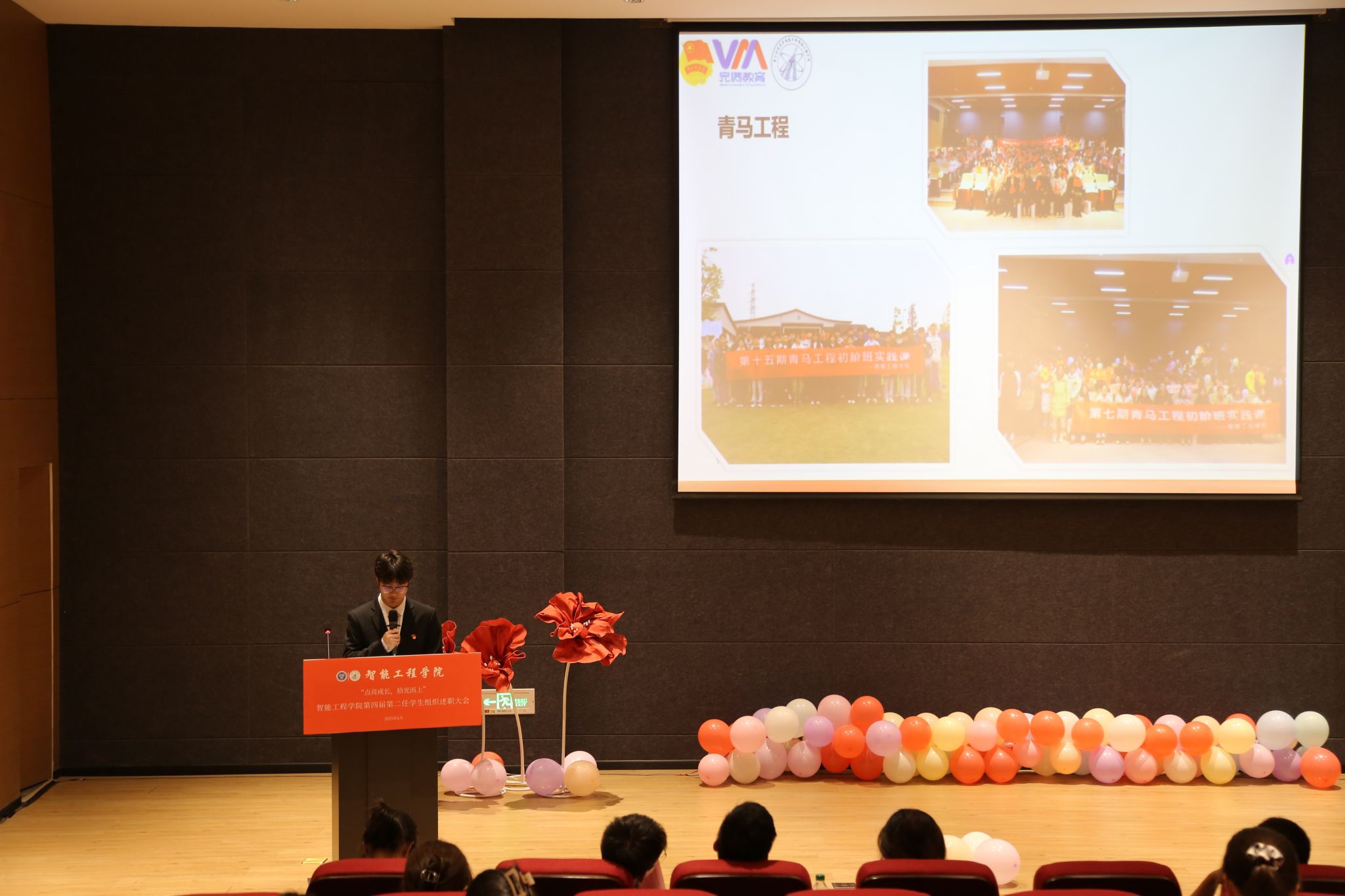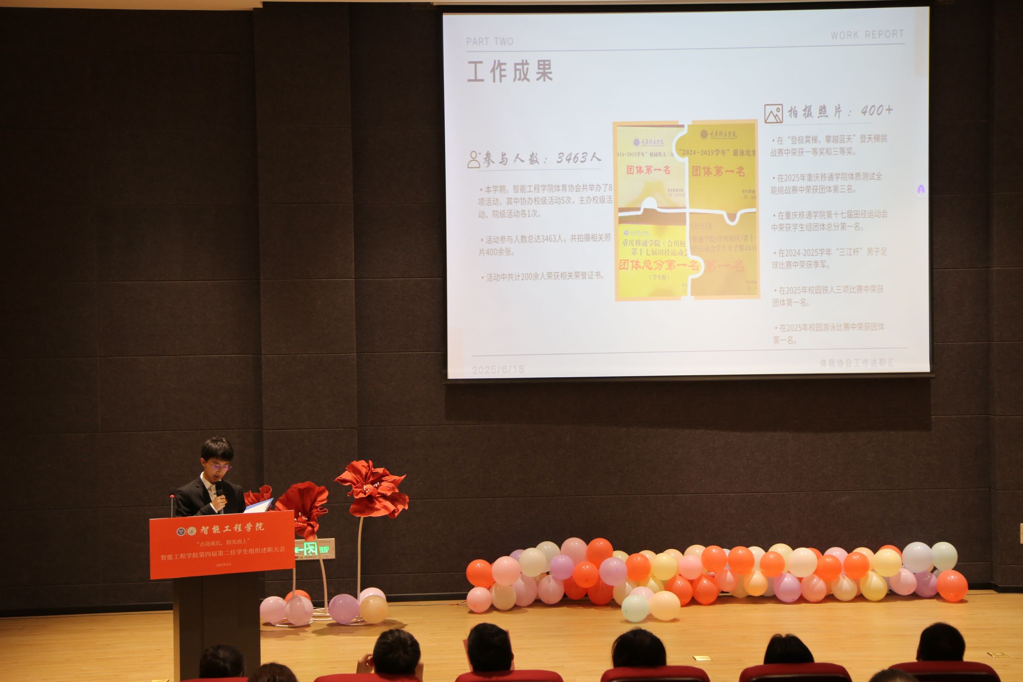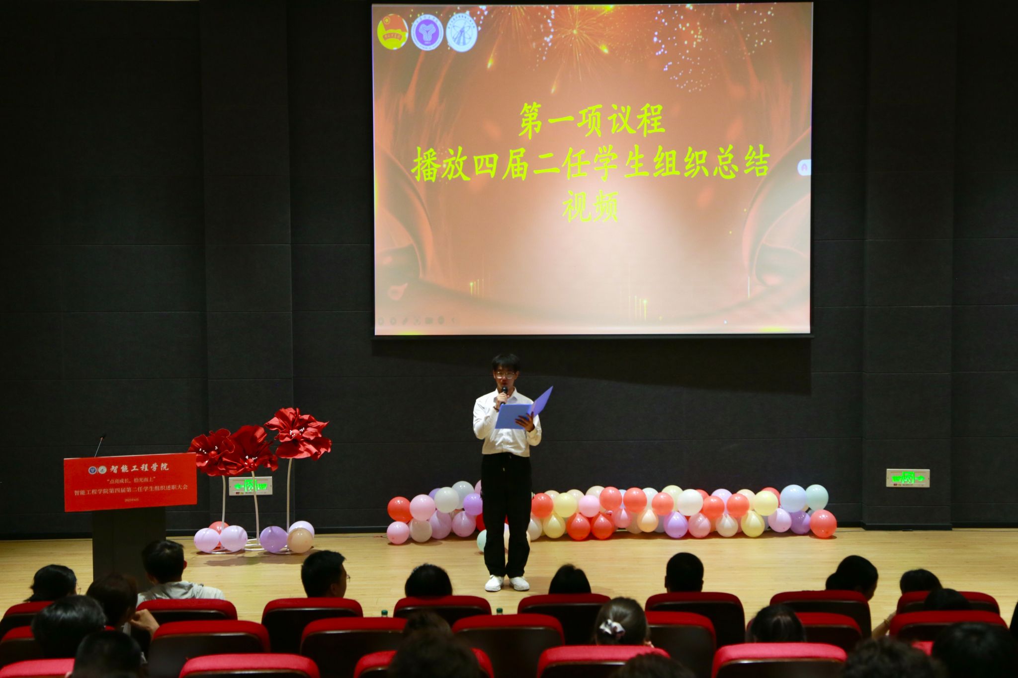 大会在四届二任学生组织总结视频的播放中拉开帷幕。视频以时光为轴,串联起学生组织在过去一年里开展的各项活动与取得的成果,从社团活动的丰富多彩到科技竞赛的奋勇拼搏,从志愿服务的温暖瞬间到日常工作的严谨细致,每一帧画面都承载着成员们的心血与回忆,让在场人员深切感受到学生组织的蓬勃活力与成长轨迹。 随后,全体起立奏唱智能工程学院院歌《相信我们会创造奇迹》。“相信只要我们在努力,未来将无比绚丽”的歌声回荡在会场,歌声中饱含着对学院的热爱与对未来的信心。