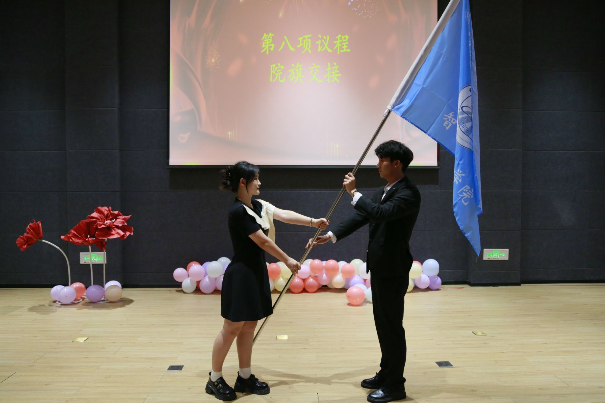 大会第七项议程宣读了四届三任聘用名单,朱红、文璐、郭丁诚等同学被委以新的重任,开启学生组织工作的新篇章。随后进行的院旗交接仪式庄重而神圣,四届二任学生组织代表将院旗郑重传递给四届三任代表,这不仅是一面旗帜的交接,更是一份责任与使命的传承,象征着学生组织的精神将在新一代成员手中继续发扬光大。最后,全体人员进行合影留念,用镜头定格这一意义非凡的时刻。