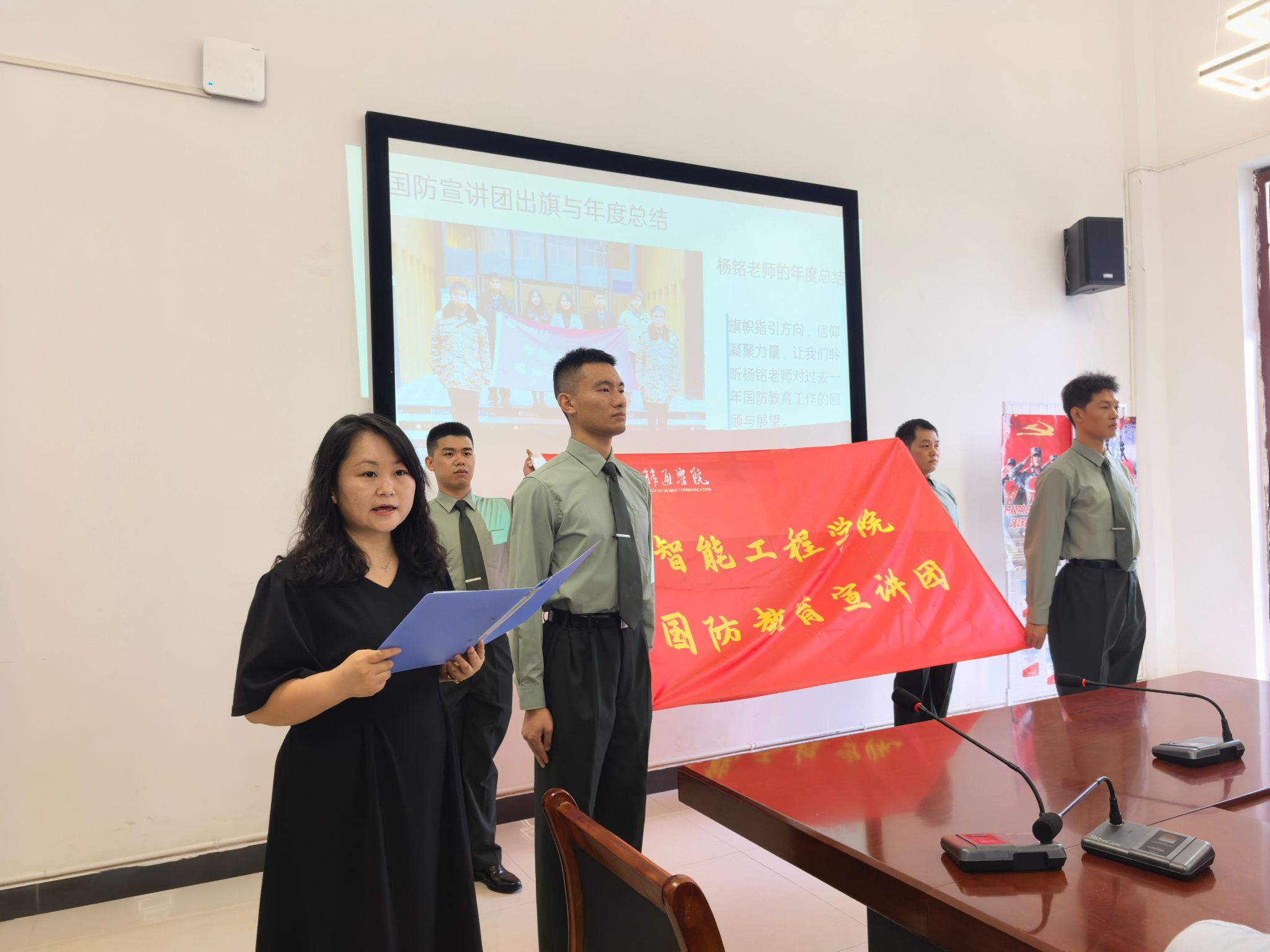 活动由院国防宣讲团成员文迪主持,在齐唱的国歌声中拉开帷幕。智能工程学院国防教育宣讲团以铿锵步伐完成出旗仪式。随后杨铭老师作出工作总结并指出:“宣讲团自成立以来,始终以党建为引领,成员们既是政策宣讲的‘排头兵’,更是党团精神的‘传播者’,累计开展国防教育进年级、进班级活动10余场,覆盖全院师生。”