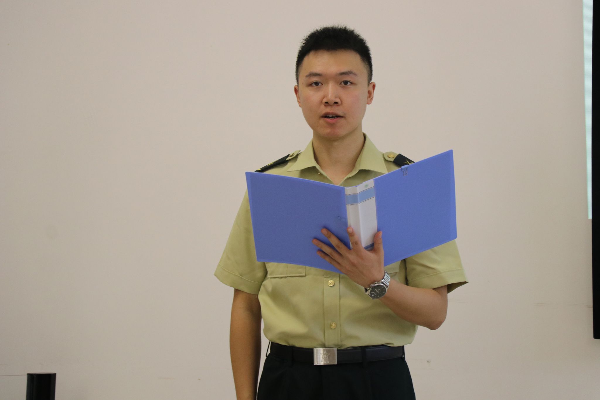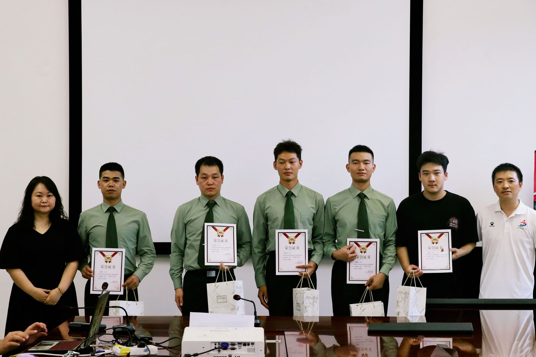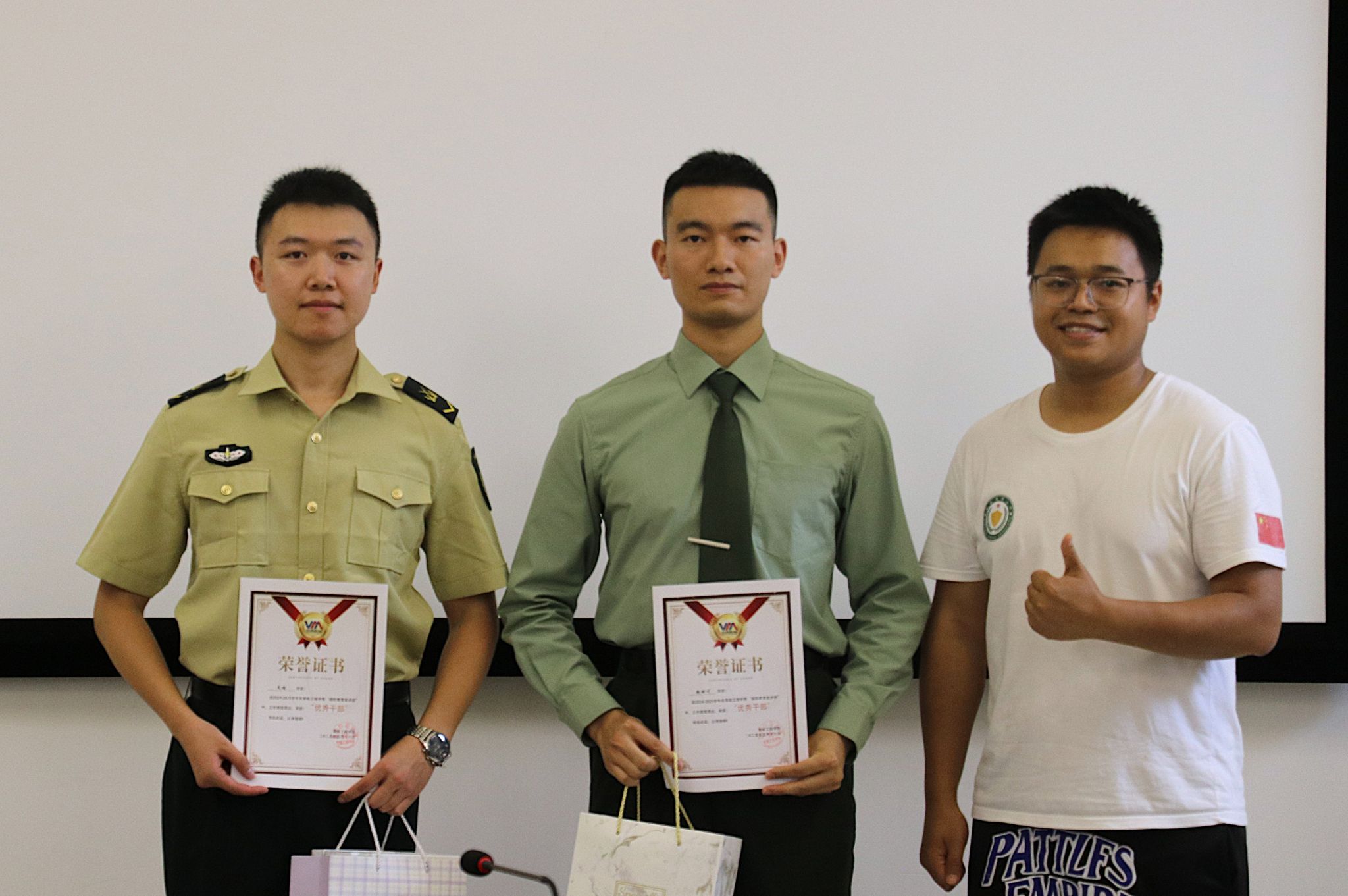 在荣誉表彰环节,江旭东老师与刘桃老师为宣讲团骨干颁发荣誉证书和奖品。赞扬了他们作为政策“传声筒”、军营“代言人”的贡献,肯定了他们在传播强军信念、点燃学子激情方面的付出。