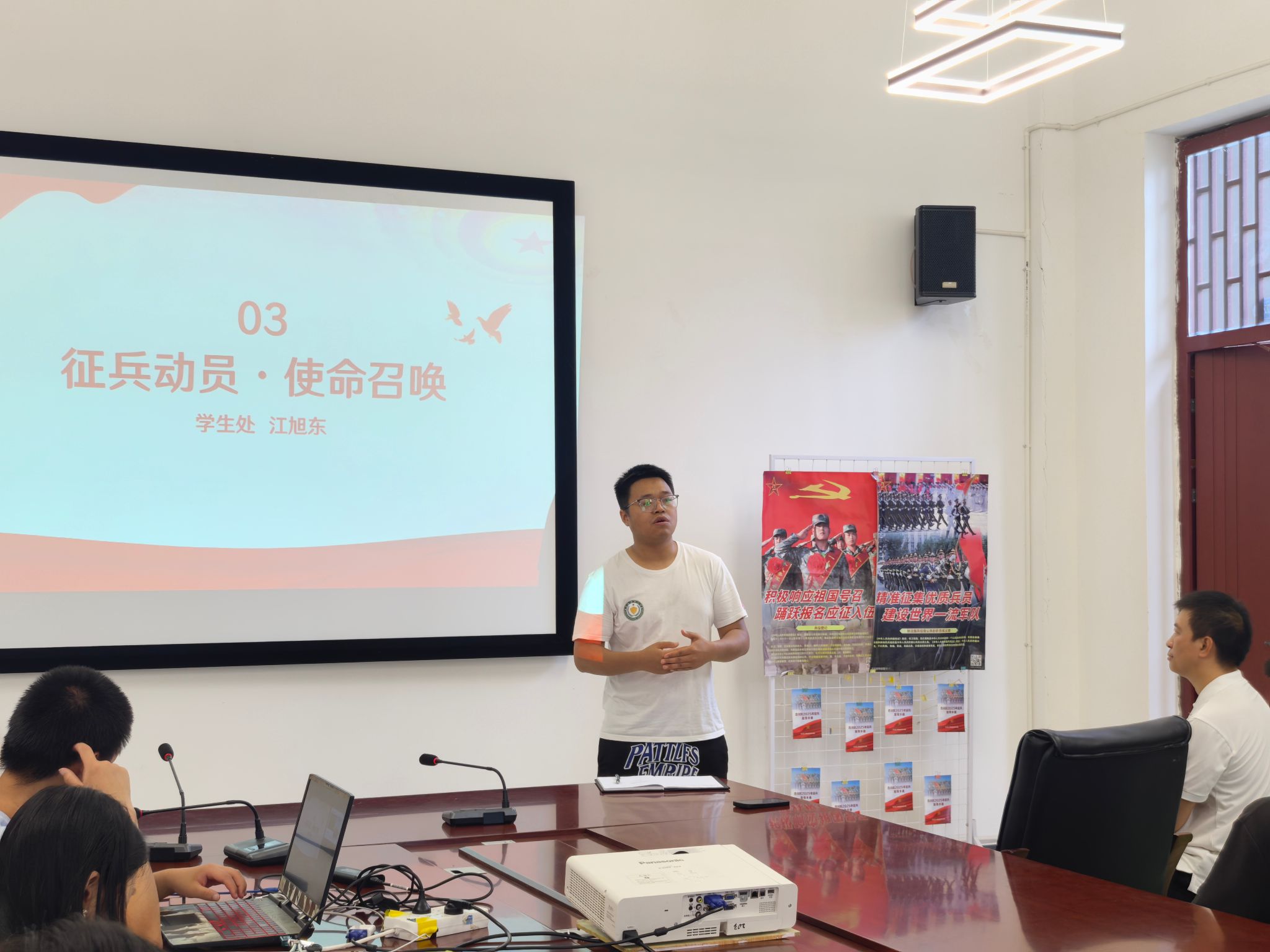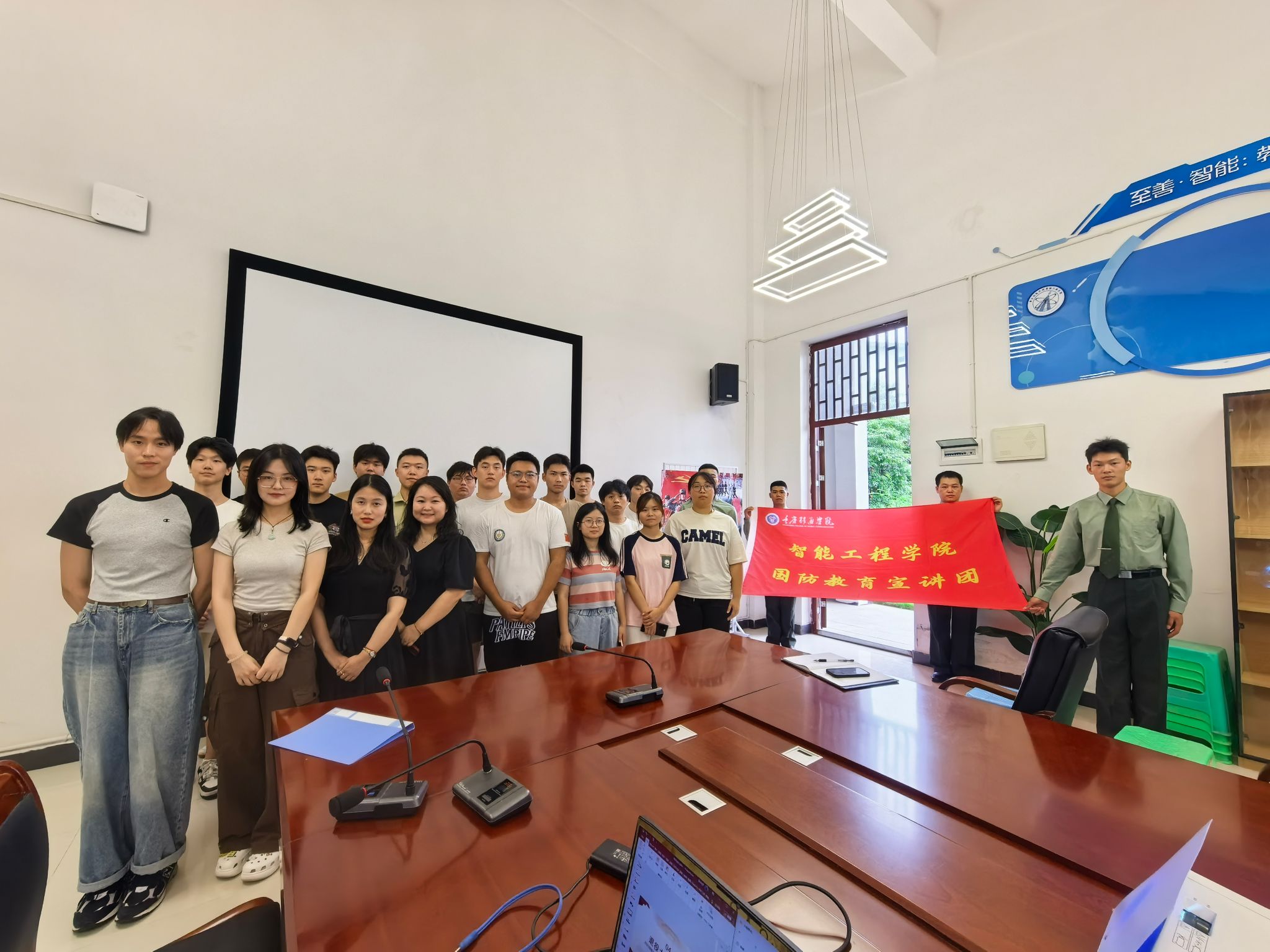 2025年6月21日,智能工程学院在梅若207会议室以“荣耀传承,强军有我”为主题,举行2025年秋季入伍欢送会暨国防教育宣讲团骨干表彰大会。学生处江旭东老师、学院学工办主任刘桃老师、学院党支部书记黄一老师与谭英姿老师、院国防教育宣讲团专项指导老师杨铭与张丁月老师出席活动,院国防教育宣讲团全体成员、即将入伍学生代表及各年级学生党员代表参会。活动通过征兵动员、分享军旅故事、表彰先进、壮行寄语等环节,传承红色基因,厚植家国情怀,激励青年学子以实际行动践行强军使命。