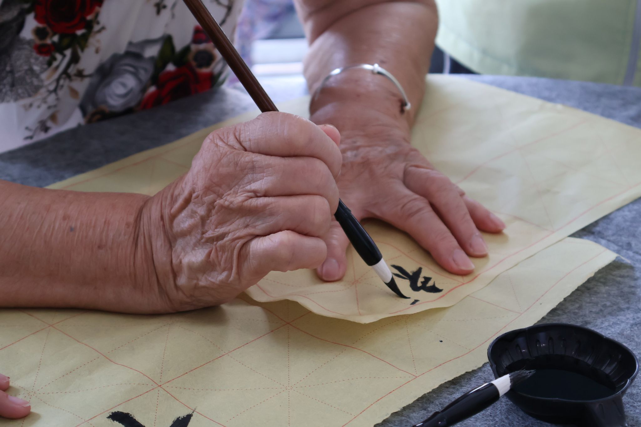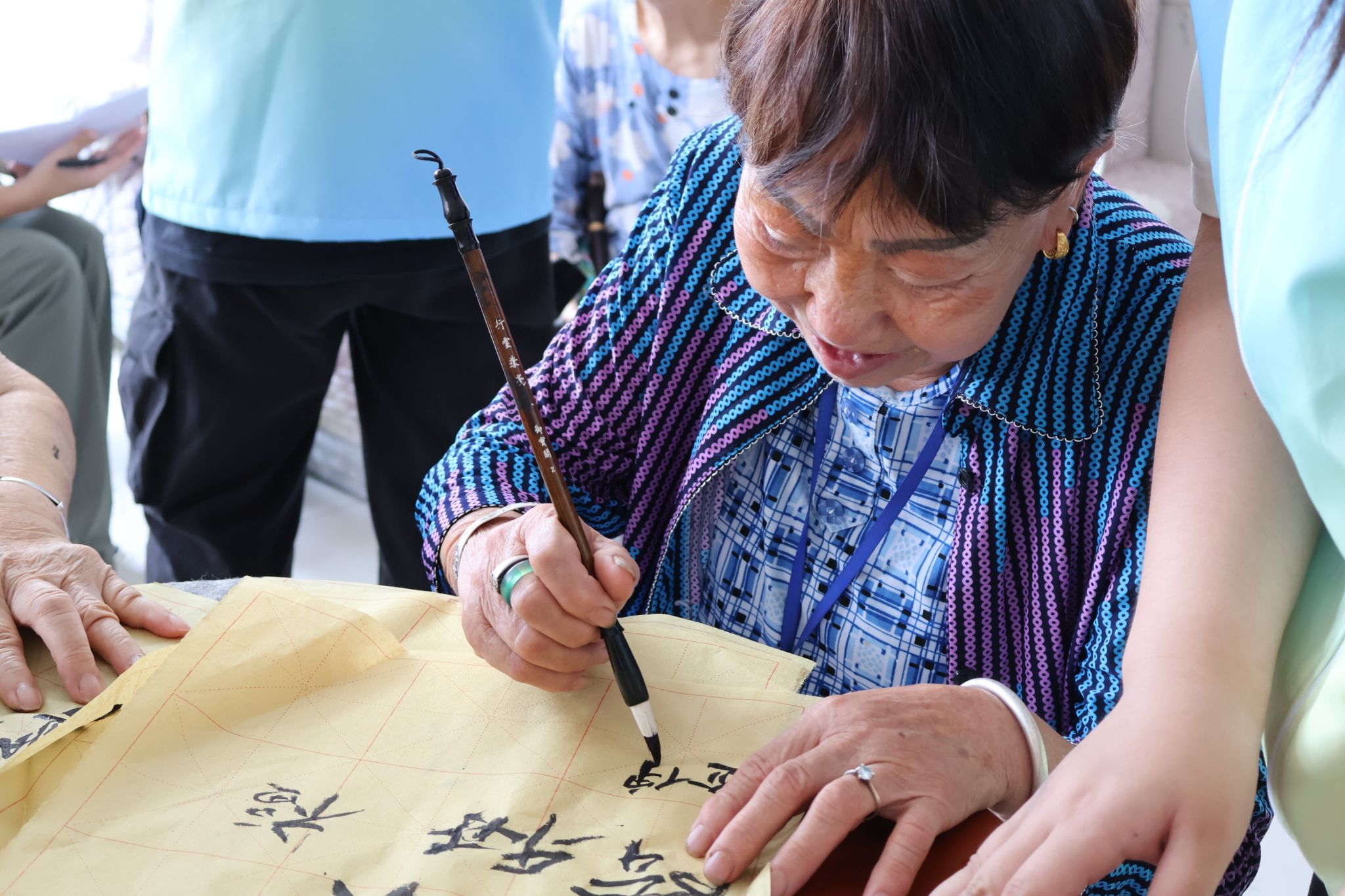 在甘家坝康养老院,实践团成员们采用“方言+普通话”双语模式,向老人们推广普通话,开场先全体合唱耳熟能详的《茉莉花》。随后,实践团成员们与老人一起下象棋、写书法,在互动中拉近距离。一位成员们在书法环节写下“老有所乐”四个字,赠予老人以表祝福。活动最后,实践团成员们进行了才艺展示,一首合唱经典老歌《东方红》将活动气氛推向高潮。志愿者们深情的演唱让老人们回忆起过去的美好时光,不少老人跟着节奏打起了节拍,眼中闪烁着感动的泪花。