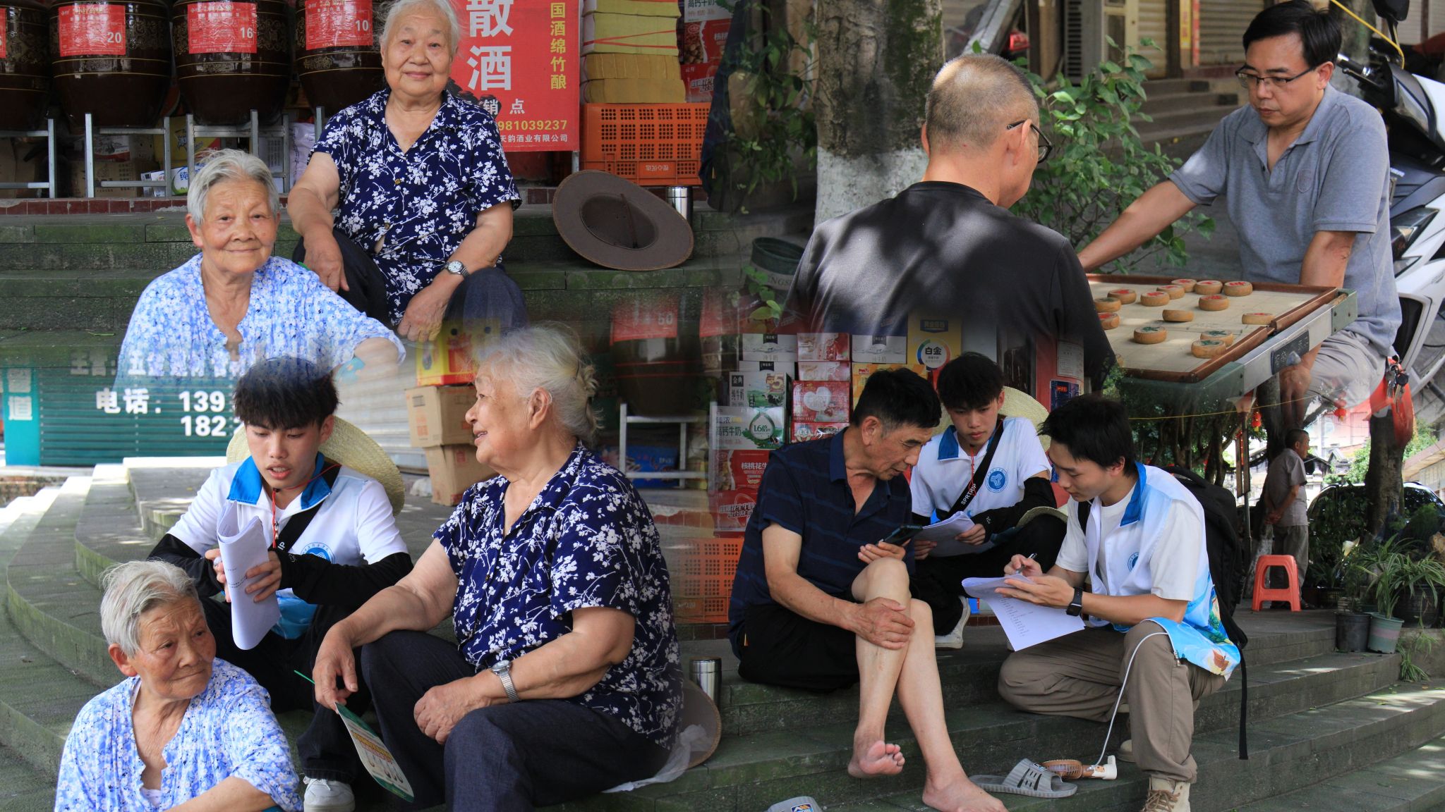 离开渔村,实践团一路欢歌笑语,乘车前往盐井老街。老街依江而建,两岸绿树成荫,此起彼伏的蝉鸣为炎炎夏日增添了几分诗意。街边石桌旁,白发老者专注地下着象棋,举手投足间尽显岁月的从容;屋檐下,大娘戴着老花镜飞针走线,指尖的虎头鞋、香囊等手工艺品,承载着代代相传的匠心。热情的老街居民围坐过来,向实践团成员讲述盐井兴衰的传奇往事,分享着“靠山吃山,靠水吃水,更要护山护水”的生存智慧。