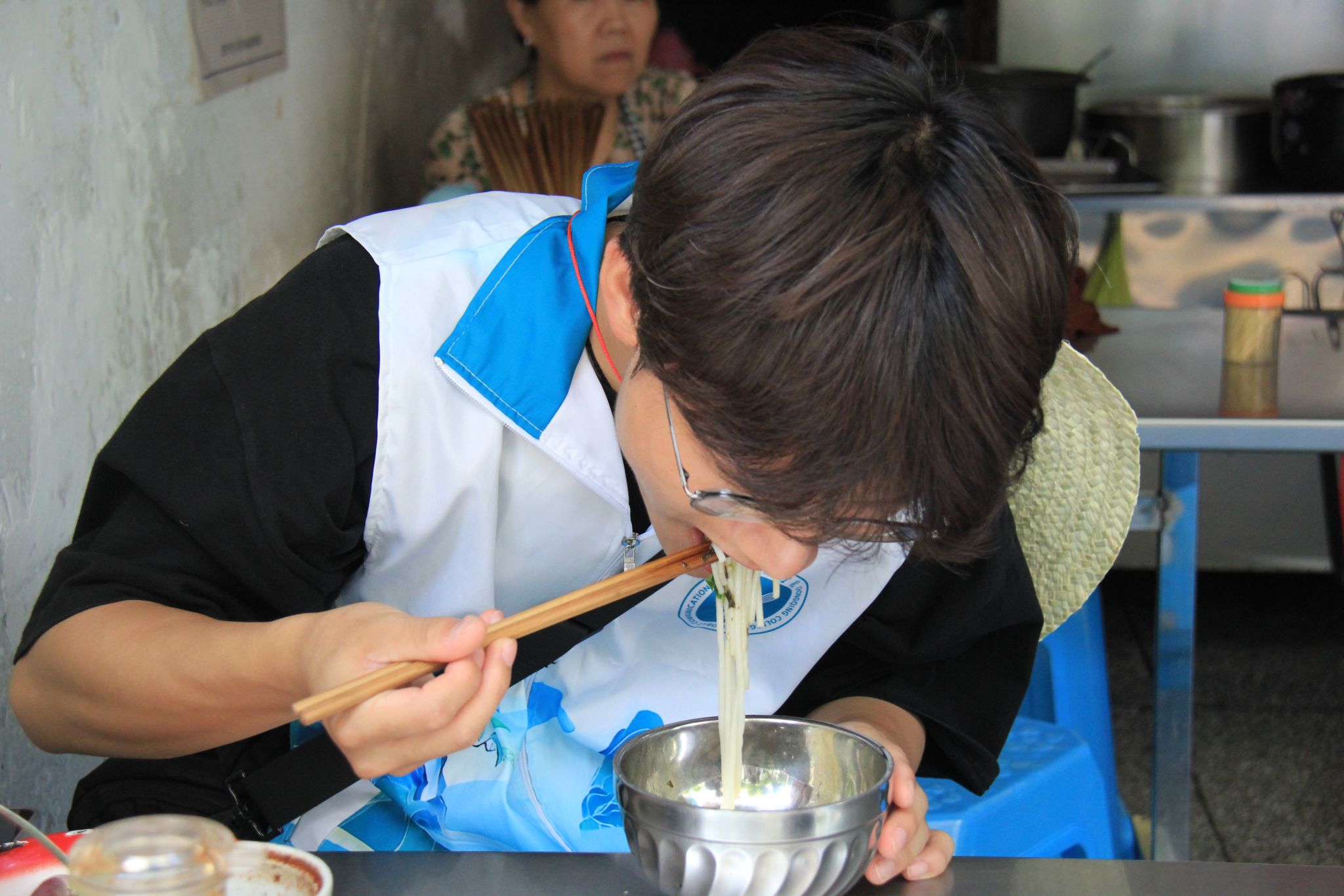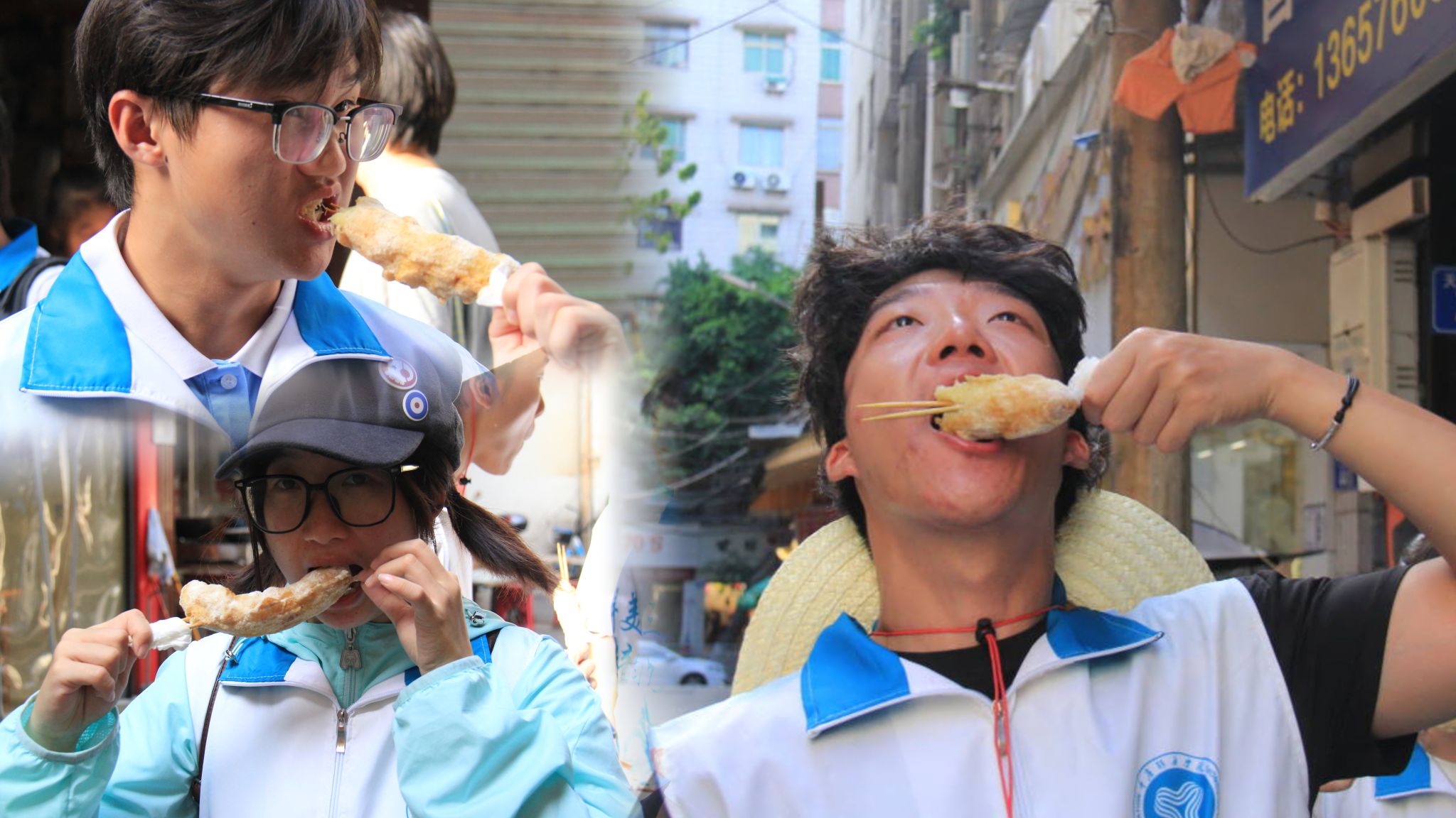 午后,实践团成员走进黄敏小吃店,尝试创意十足的炸香蕉与炸甜甜圈。金黄酥脆的面衣裹着雪白糖粉,咬开时绵密的香蕉泥缓缓流出,搭配酸甜番茄酱,口感层次丰富;撒满糖霜的炸甜甜圈蓬松轻盈,咀嚼间散发着淡淡酵母香气。不远处的少水粉店内,红油在碗中泛着诱人光泽,劲道的红薯粉裹满秘制酱料,鲜嫩牛肉裹着浓郁肉香,卤蛋散发醇厚酱香,脆爽榨菜碎增添层次。麻辣滋味在舌尖肆意绽放,每一口都酣畅淋漓,令人直呼过瘾。