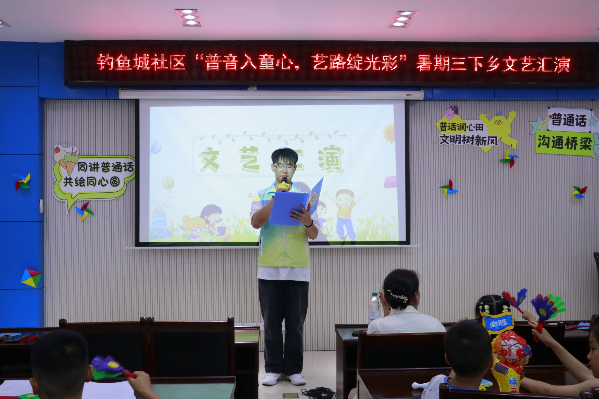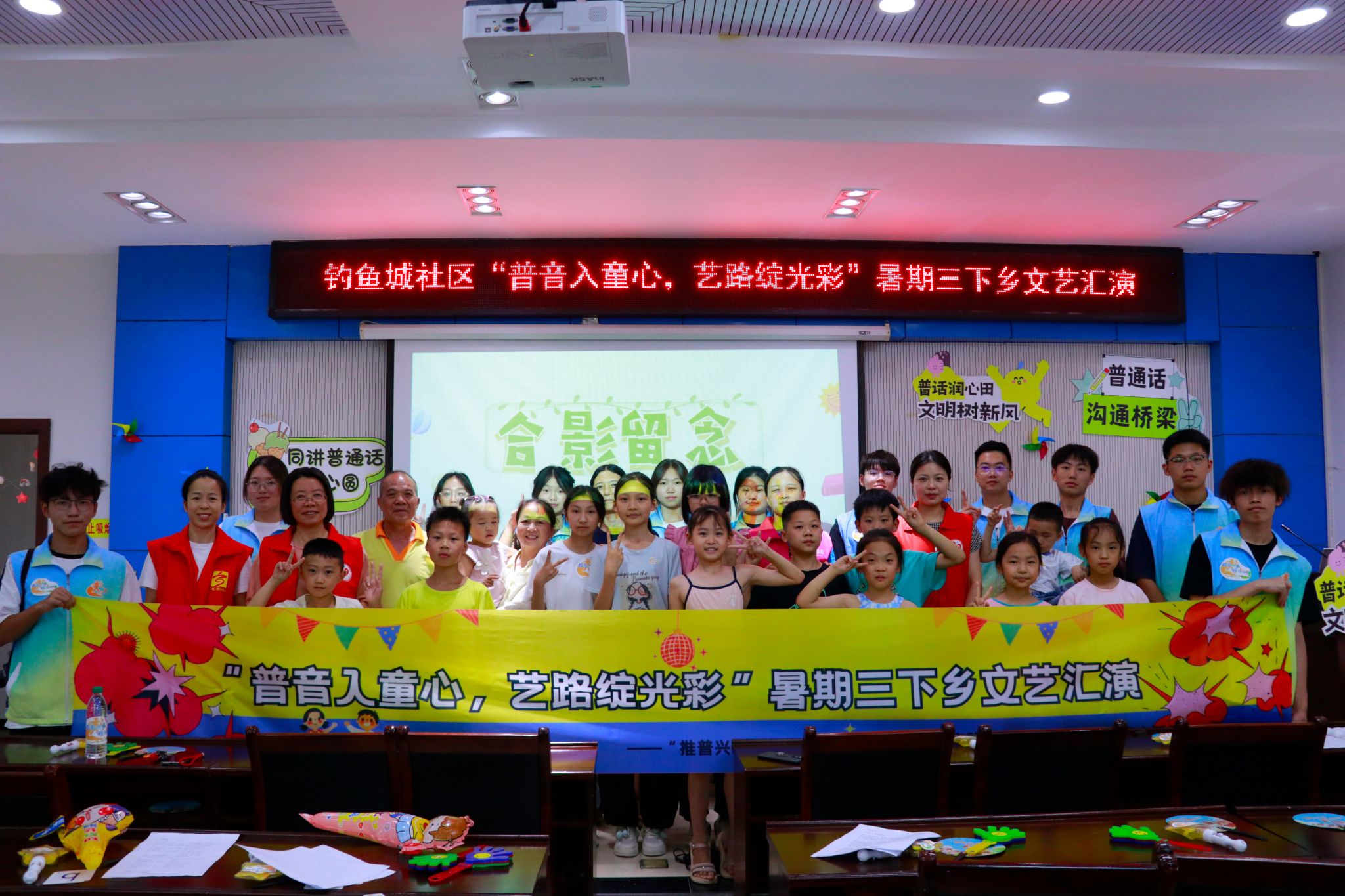盛夏骄阳似火,乡村热情如歌。为进一步扎实推动普通话在基层的普及应用,奏响新时代语言文字事业发展的强音,2025年7月7日,重庆移通学院智能工程学院“推普兴乡,‘移’路同行”乡村振兴实践团联动钓鱼城社区新时代文明实践站共同举办了一场以“普音入童心,艺路绽光彩”为主题的暑期三下乡文艺汇演,通过歌曲、朗诵、手势舞等形式,将国家推广普通话的政策精神融入精彩纷呈的节目中,为乡村振兴注入文化新动能。