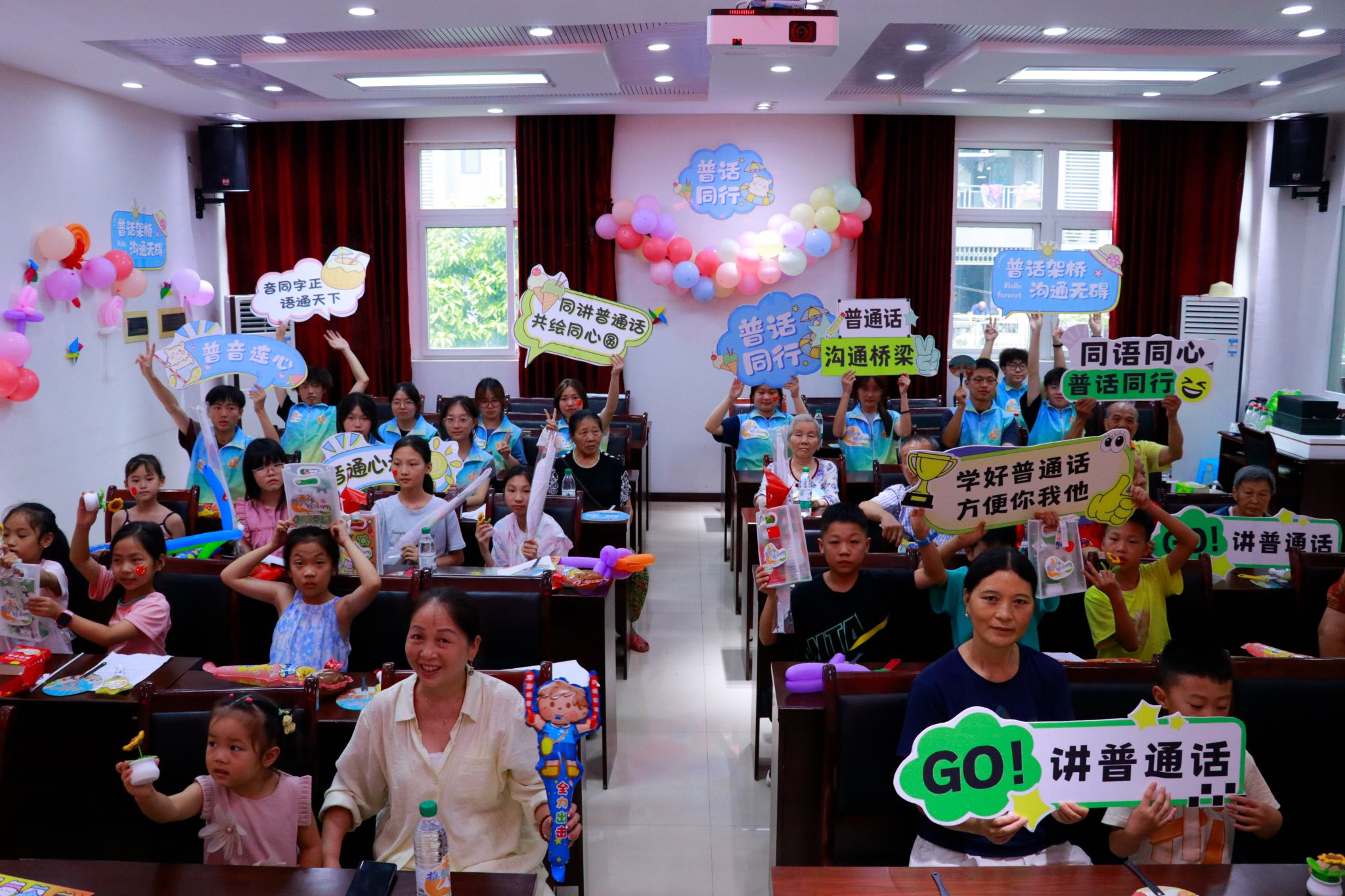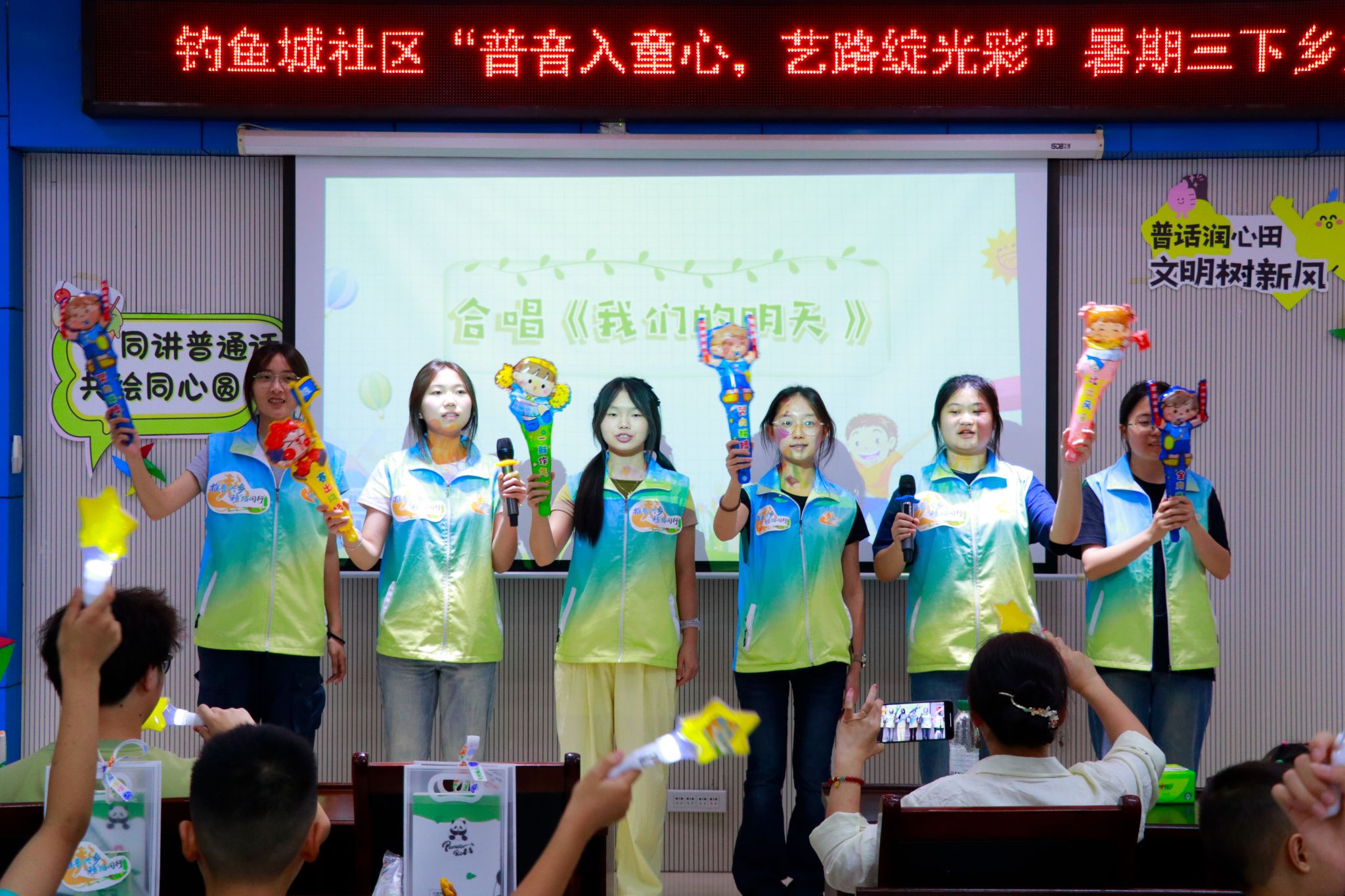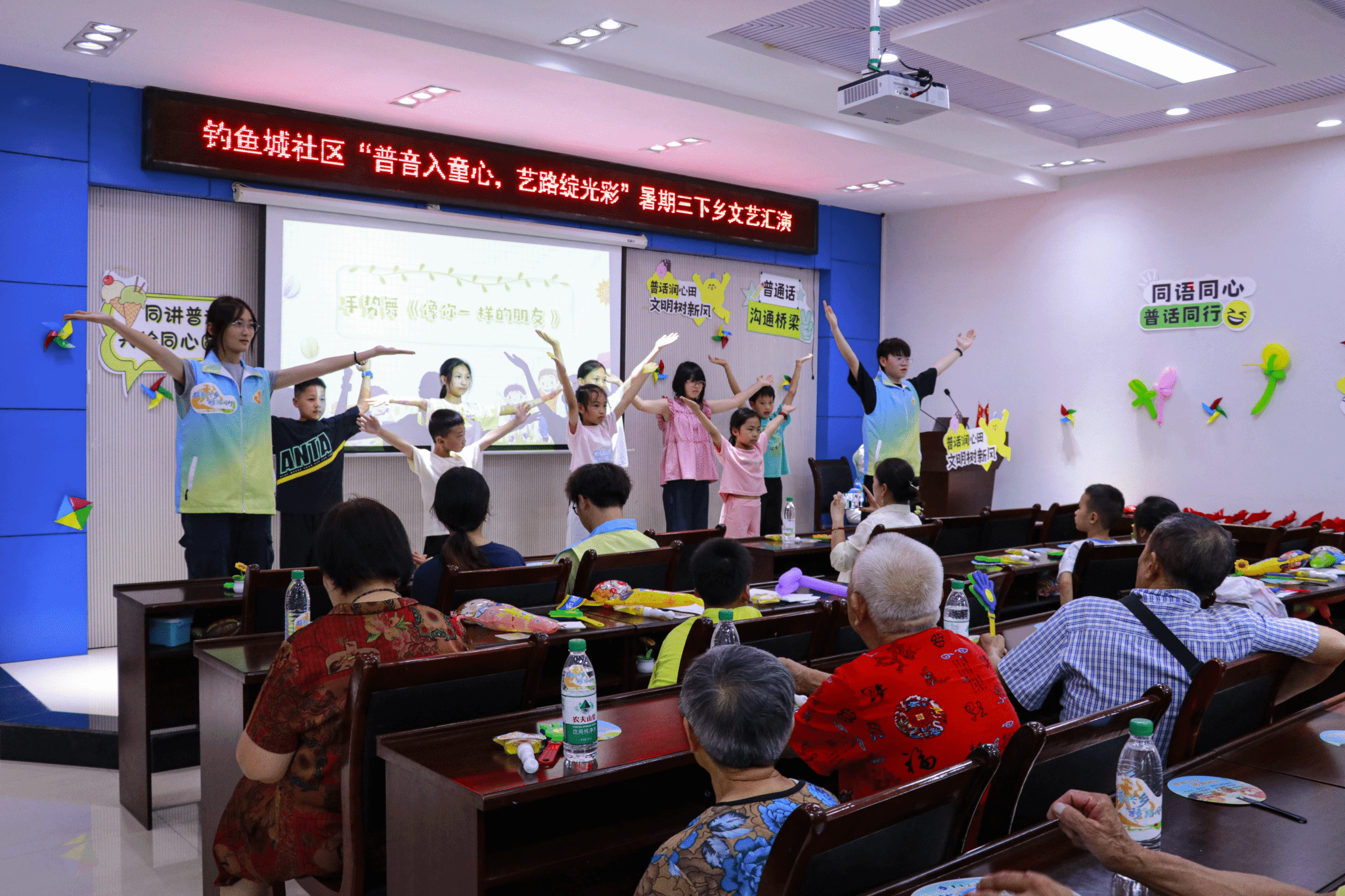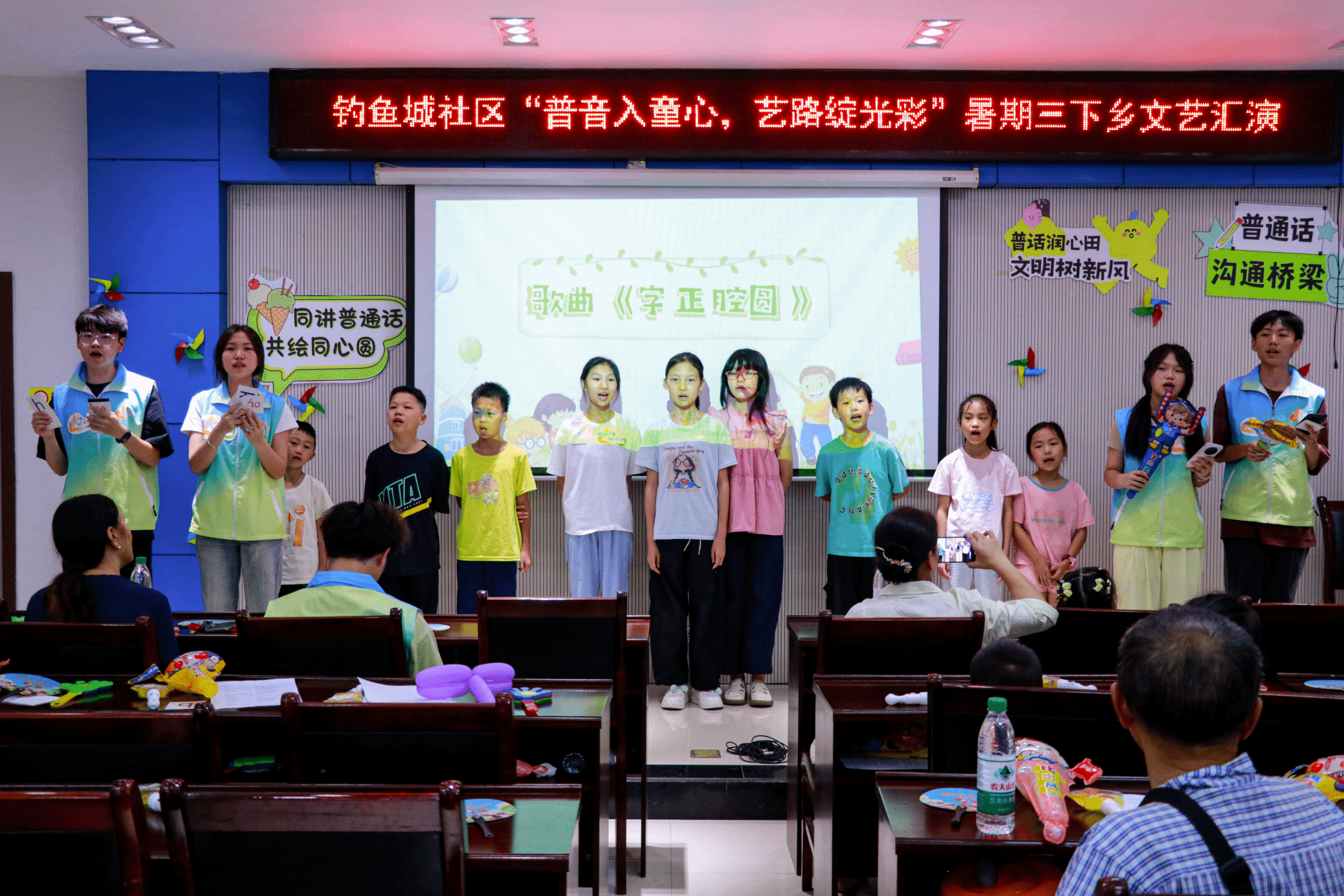 在文艺表演环节,现场气氛热烈非凡。全体志愿者和小朋友们共同带来的歌曲《字正腔圆》,“横平竖直皆风骨,撇捺飞扬是血脉”,普通话的魅力在这些表演中展现得淋漓尽致,大家在旋律中尽情感受汉字的铿锵韵律。此外,志愿者和小朋友们共同演绎的《像你一样的朋友》手势舞,既展现了普通话的韵律美,又诉说着这几天大家的同行情谊。