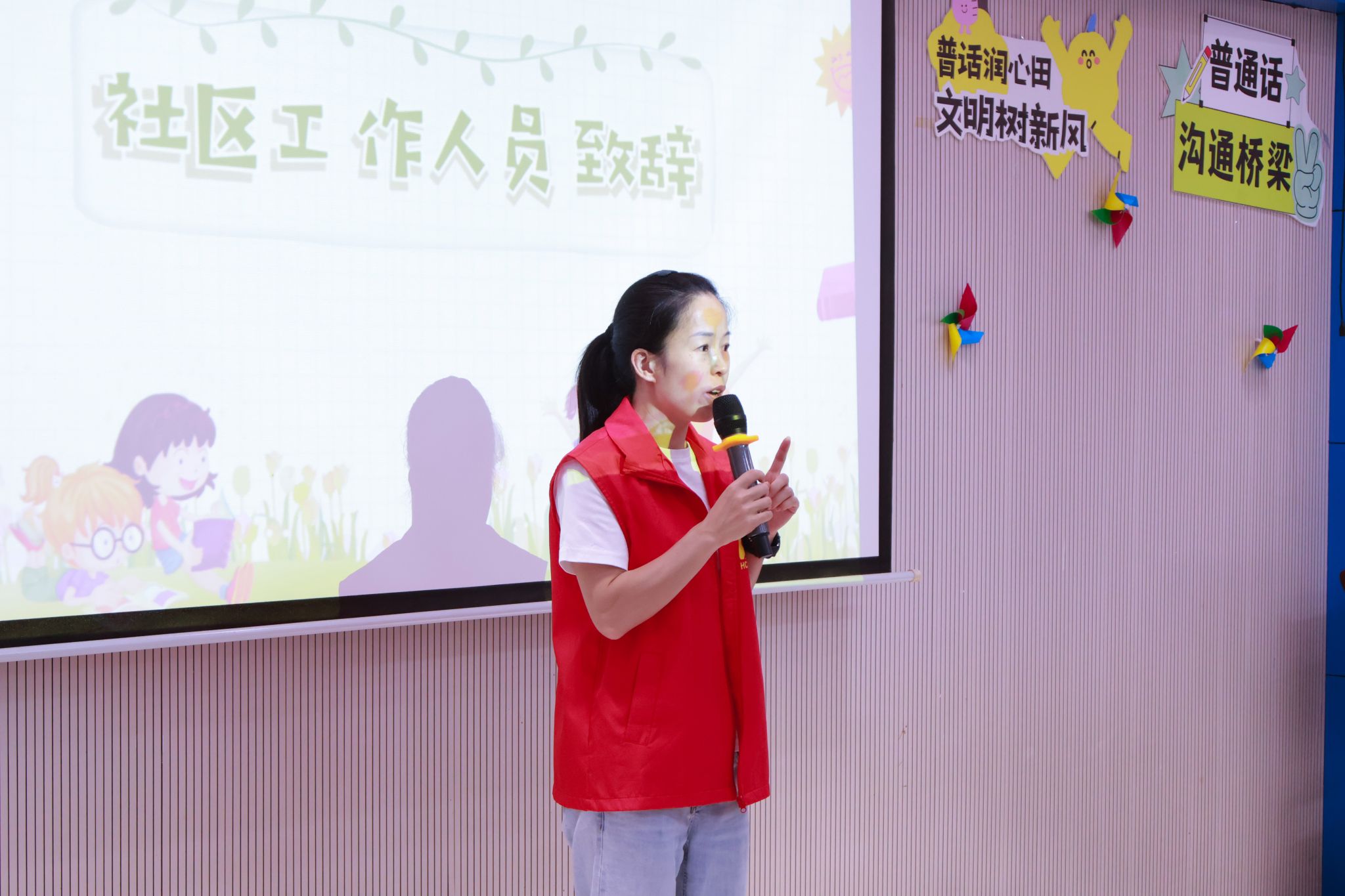 活动伊始,主持人热情开场,点明了普通话不仅是沟通工具,更是乡村振兴的“信息钥匙”。他指出,在电商直播、文化交流等场景中,普通话的普及能有效提升村民表达能力,助力乡村产业“走出去”。随后,钓鱼城社区新时代文明实践站宣传干部李曦老师上台,她肯定了实践团过去7天的辛苦付出,表示语言不仅是沟通工具,更是文化传承的纽带。今天的文艺汇演,既是成果展示,更是新起点,希望大家能将普通话融入日常,让社区成为语言文明的窗口。同时,李曦老师也表示,后续社区也将继续创新形式,用更贴近生活的方式,让普通话真正成为邻里间的“连心桥”。