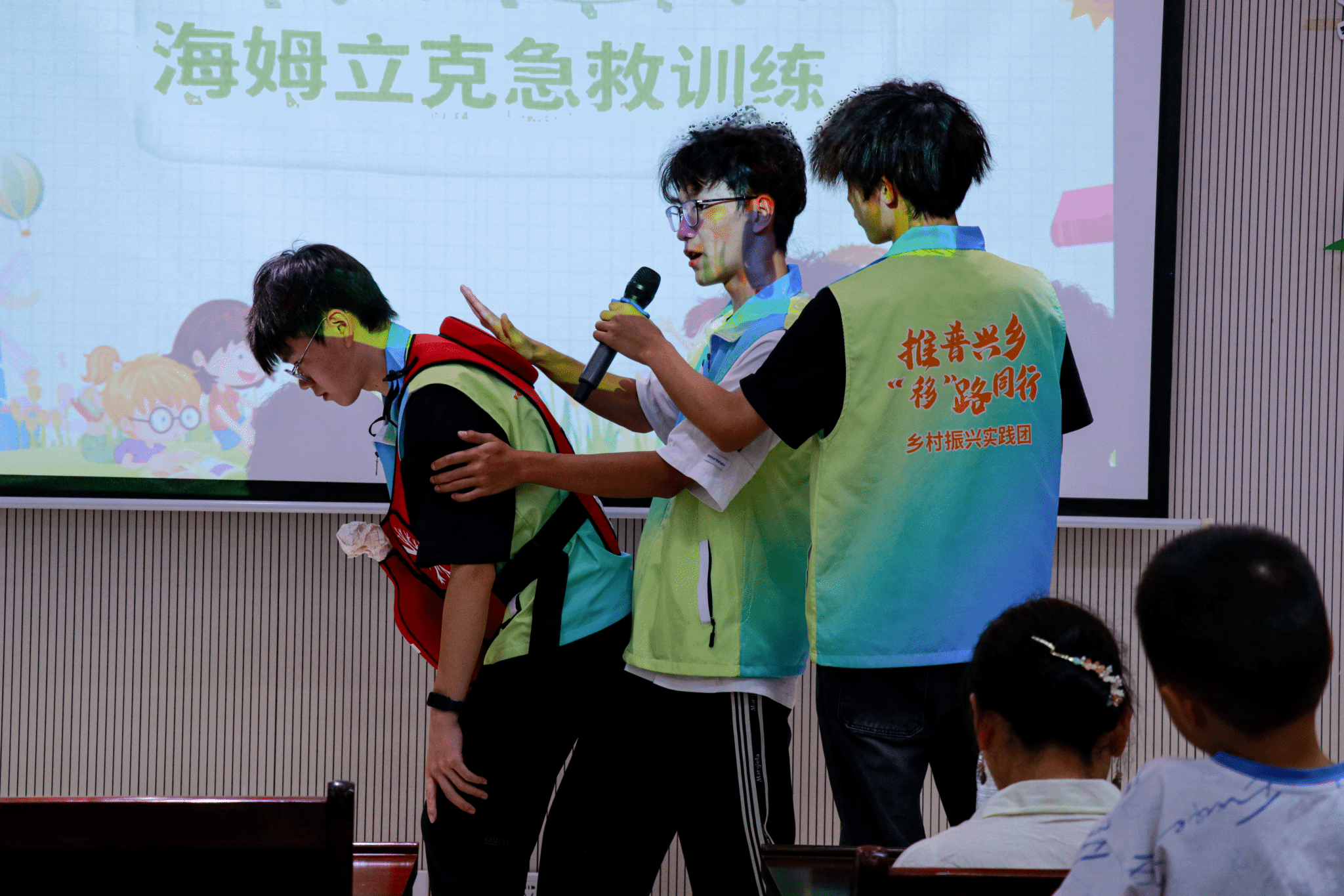 普通话不仅是交流的工具,更是展现自信的舞台。陈吕琪、谢乐森、杨景涵等“小小演说家”闪亮登场,他们用稚嫩却清晰的声音,讲述着家乡的美好故事,表达着对家乡的热爱之情,带来了精彩的演讲表演。随后,实践团也现场用标准的普通话教学及演示了海姆立克急救法的操作流程,为在场观众送上了实用的生命安全技能。另一方面,小朋友们用清澈的童声深情朗诵经典篇目《中国话》,以稚嫩而坚定的声音展现普通话的魅力,传递对中华语言文化的热爱。