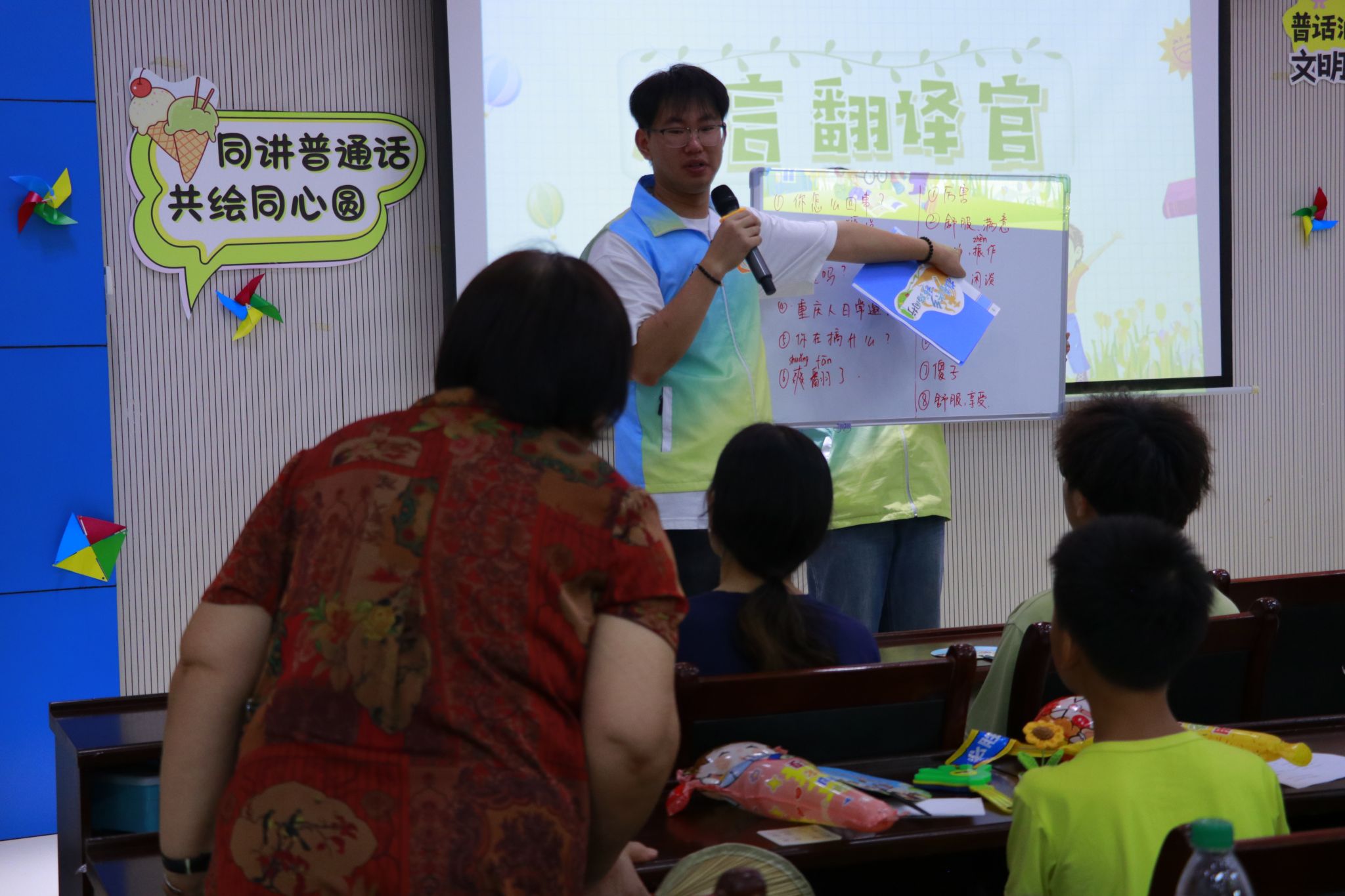 为了让更多的社区居民能参与到推普活动中来,扩大影响力,活动现场还设置了“方言翻译”游戏环节。主持人邀请乡亲们用方言说句子,由现场的小朋友用普通话翻译。此环节激发了现场观众的参与热情,现场气氛十分活跃。乡亲们积极踊跃地用方言表达,小朋友们也纷纷举手抢答,在欢声笑语中增进了对普通话和方言的理解与运用。