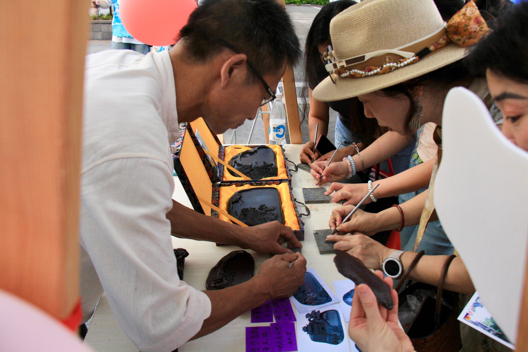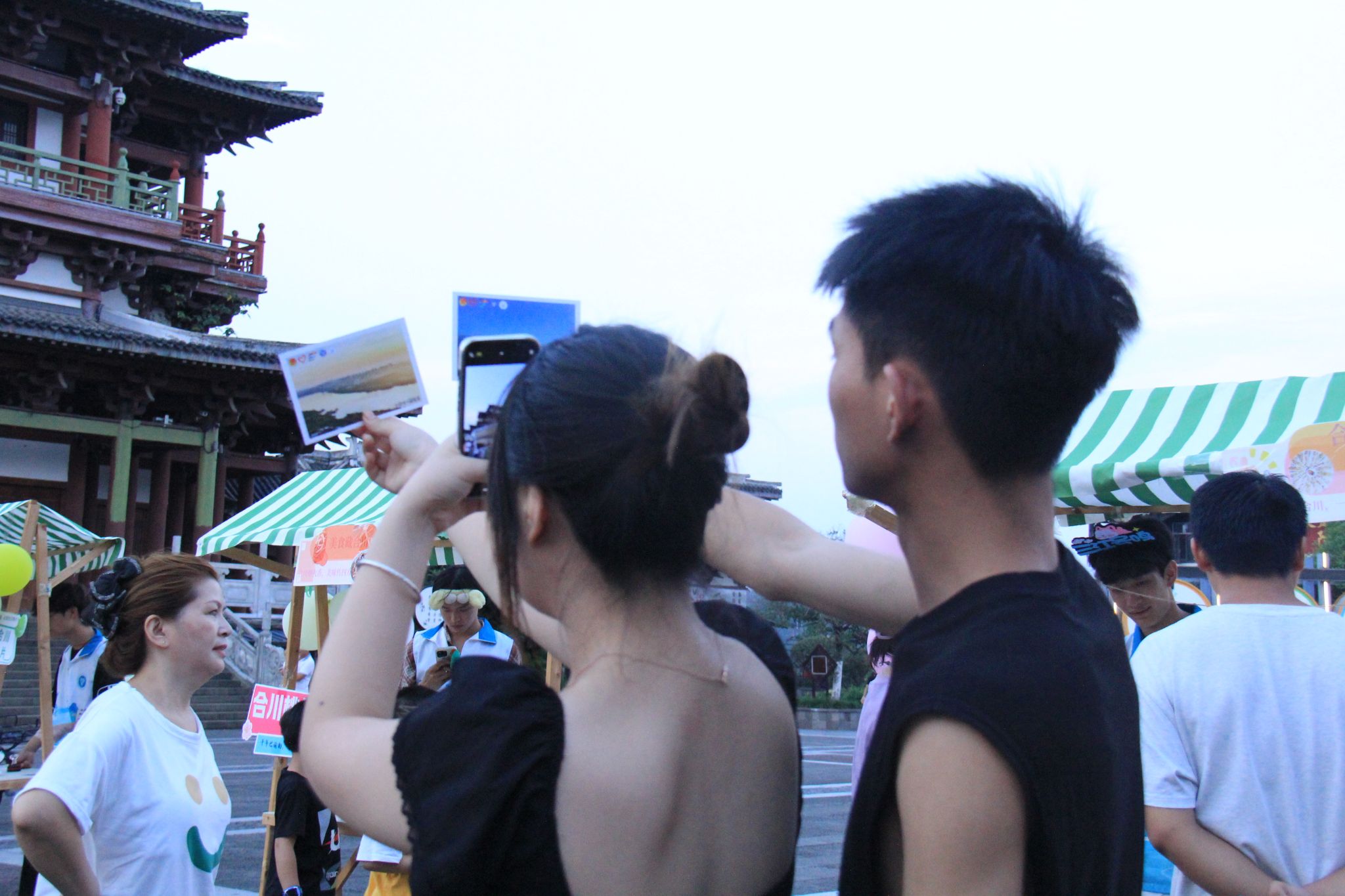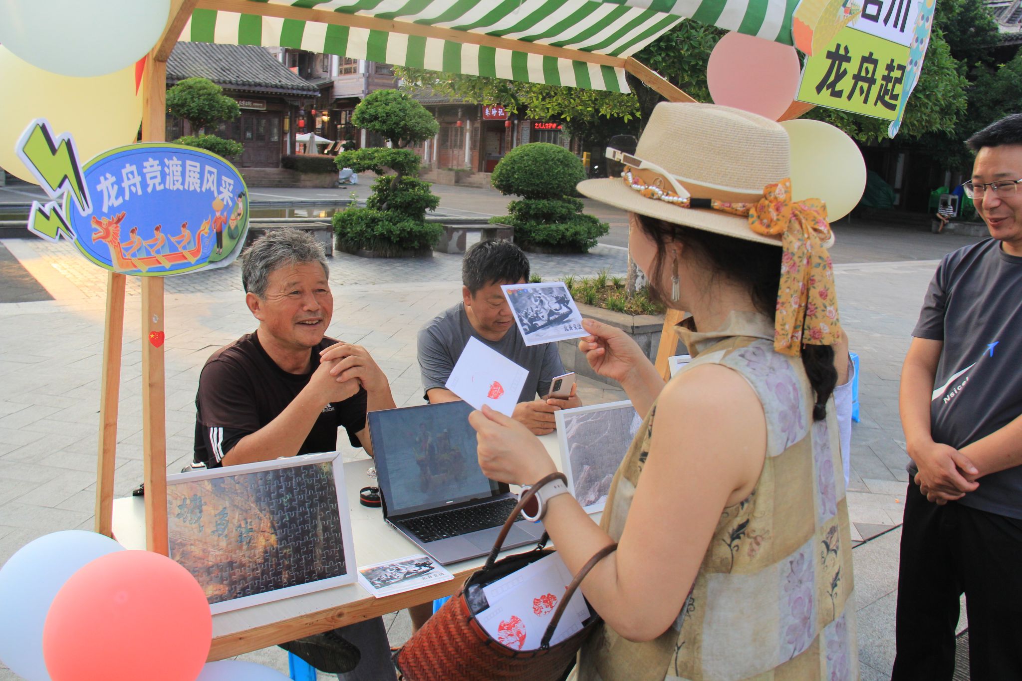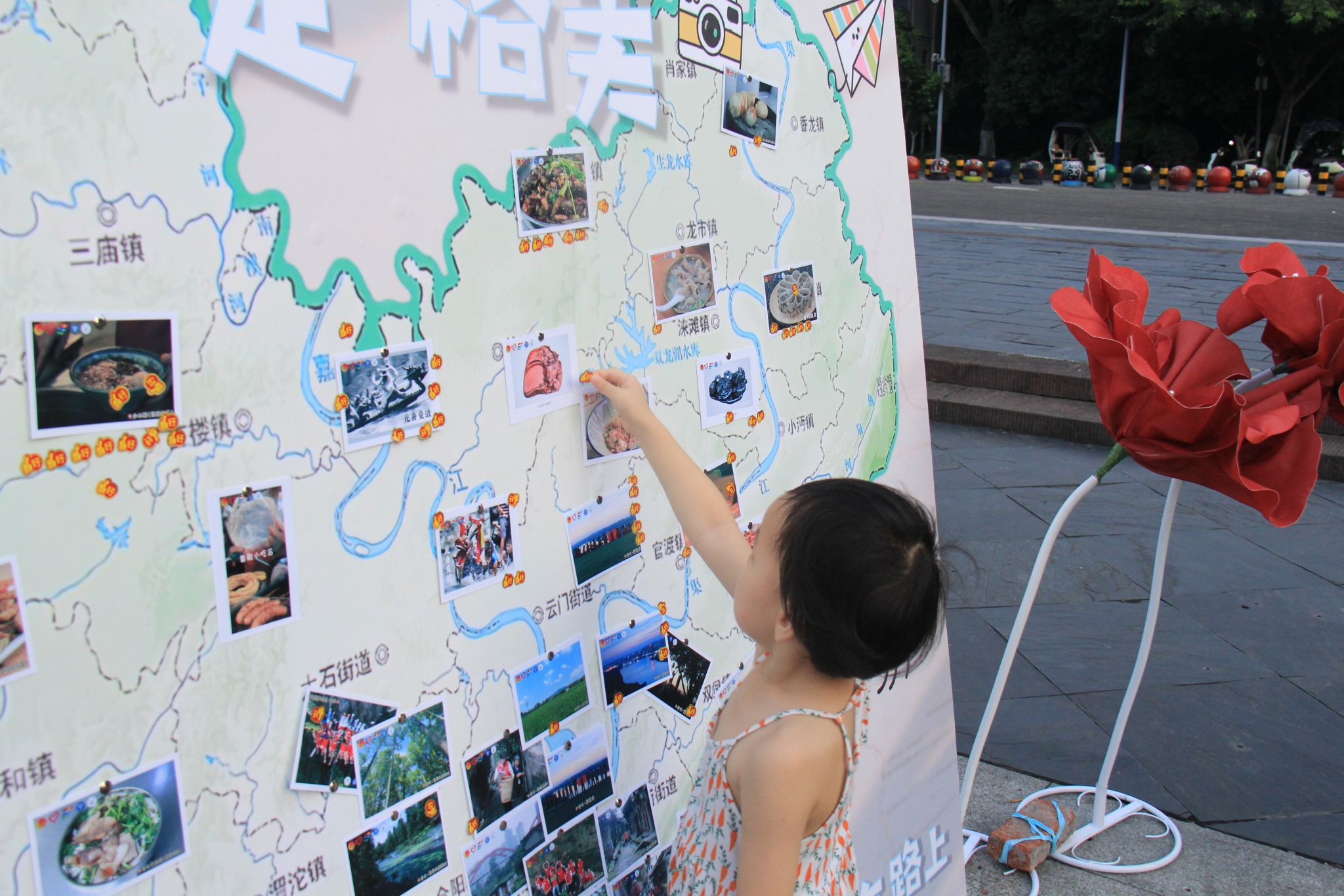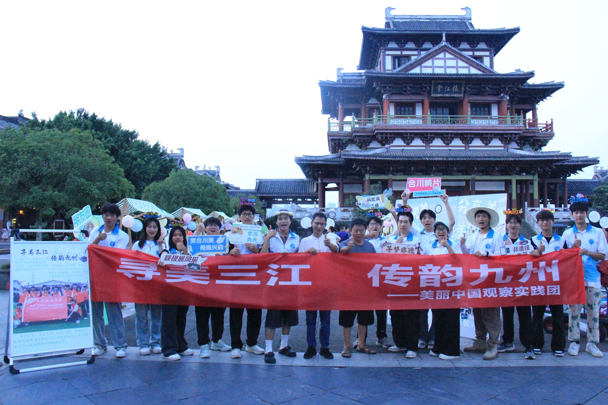 7月7日,实践团将数日积累的“美”浓缩于文峰古街的“寻美游园会”集市活动中。经过前期精心筹备,会江楼前的摊位依次亮相:白塔打卡区、非遗展示台、美食体验区、合川美景摄影板等,让市民与游客沉浸式感受合川的自然之美、文化之韵与烟火之气。活动中,小朋友为桃片的香甜点赞,老一辈在熟悉的味道中回忆往昔,青年们通过体验非遗技艺理解传承意义,往来者纷纷在美景展示栏前合影,让合川之美借由社交平台传播更远。实践团成员通过讲解、互动,将走访调研中积累的故事与感悟传递给每一位参与者,实现了“分享美”的最终目标。