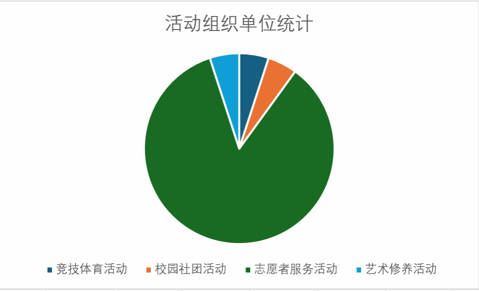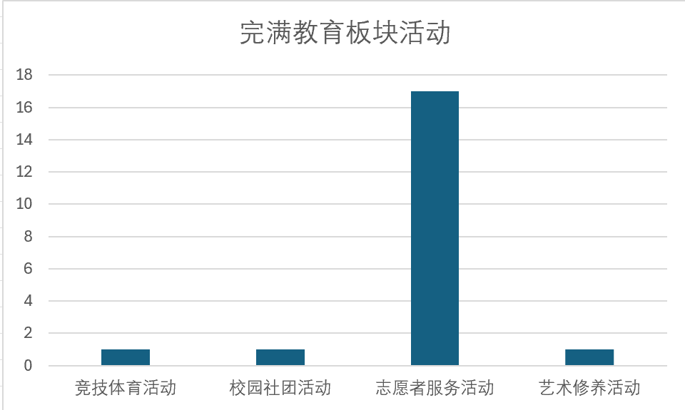 由这个月的数据来看,智工的志愿者服务活动参与率最高,可见,智工的小伙伴对志愿者服务活动有着浓厚的兴趣,这正是作为大学生的我们应该具备的。在完满教育活动中,每一个活动都能帮助我们和外界进行交流,丰富我们的内涵,让我们的内核更强大。在这些完满活动中,我们可以在专研学业的同时也可以看看校园中其他人丰富多彩的生活,丰富自己,做到德、智、体、美、劳全面发展。