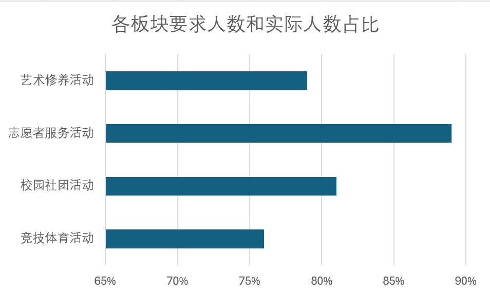 在智能工程学院的完满教育活动中不一样的板块活动规模大不相同,但从各个板块活动要求总人数和实际报名参加的人数可以看出,艺术修养活动参与率达到了78%,竞技体育活动参与率达到了76%,志愿者服务活动参与率达到了89%,校园社团活动参与率达到了81%。