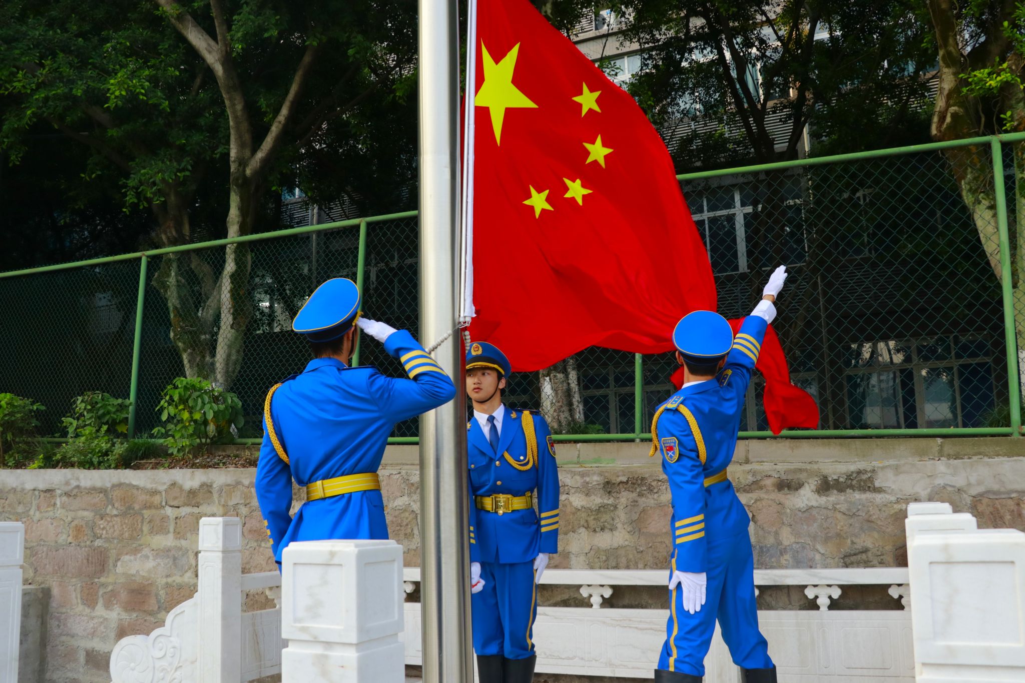仪式第一项,国旗护卫队队员们迈着铿锵有力的步伐,护送五星红旗走向升旗台。伴随着国歌奏响,五星红旗冉冉升起,全体师生庄严肃立,向国旗行注目礼,嘹亮的国歌声响彻校园上空。