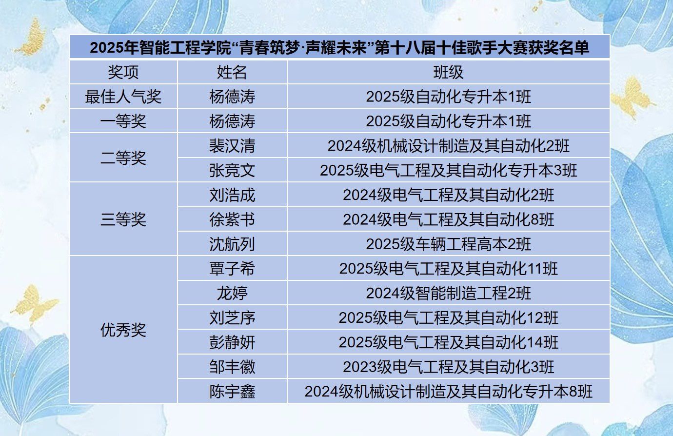 歌声落幕,梦想续航。此次十佳歌手大赛不仅为智能工程学院学子提供了展现自我的平台,更以音乐为纽带,凝聚了青春正能量,展现了当代大学生积极向上的精神风貌。未来,智能工程学院将继续打造更多优质艺术活动,为学子成长成才注入更多活力。