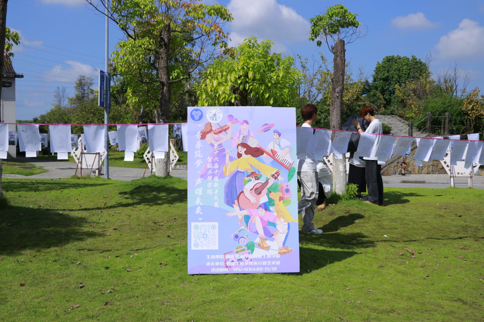 大赛自开始以来便获全院学子积极响应,经线上线下多渠道宣传,百余位歌唱爱好者踊跃报名。9月24日,初赛于行者公园草坪启幕,选手以清唱形式线上投稿,作品由学生观众扫码聆听打分,最终36位选手凭借扎实的唱功成功晋级复赛。当艺术元素与青春热情碰撞,青春声音与校园风景交融,一幅幅活力满溢的校园生活画卷正随悠扬旋律铺展。