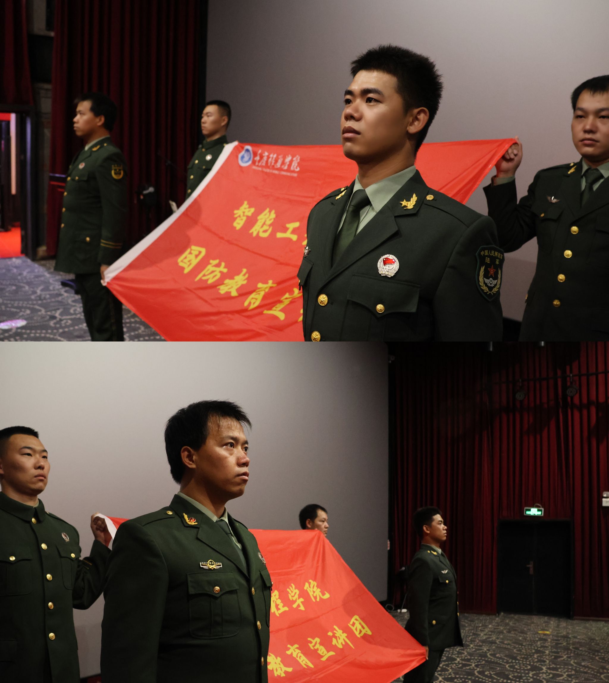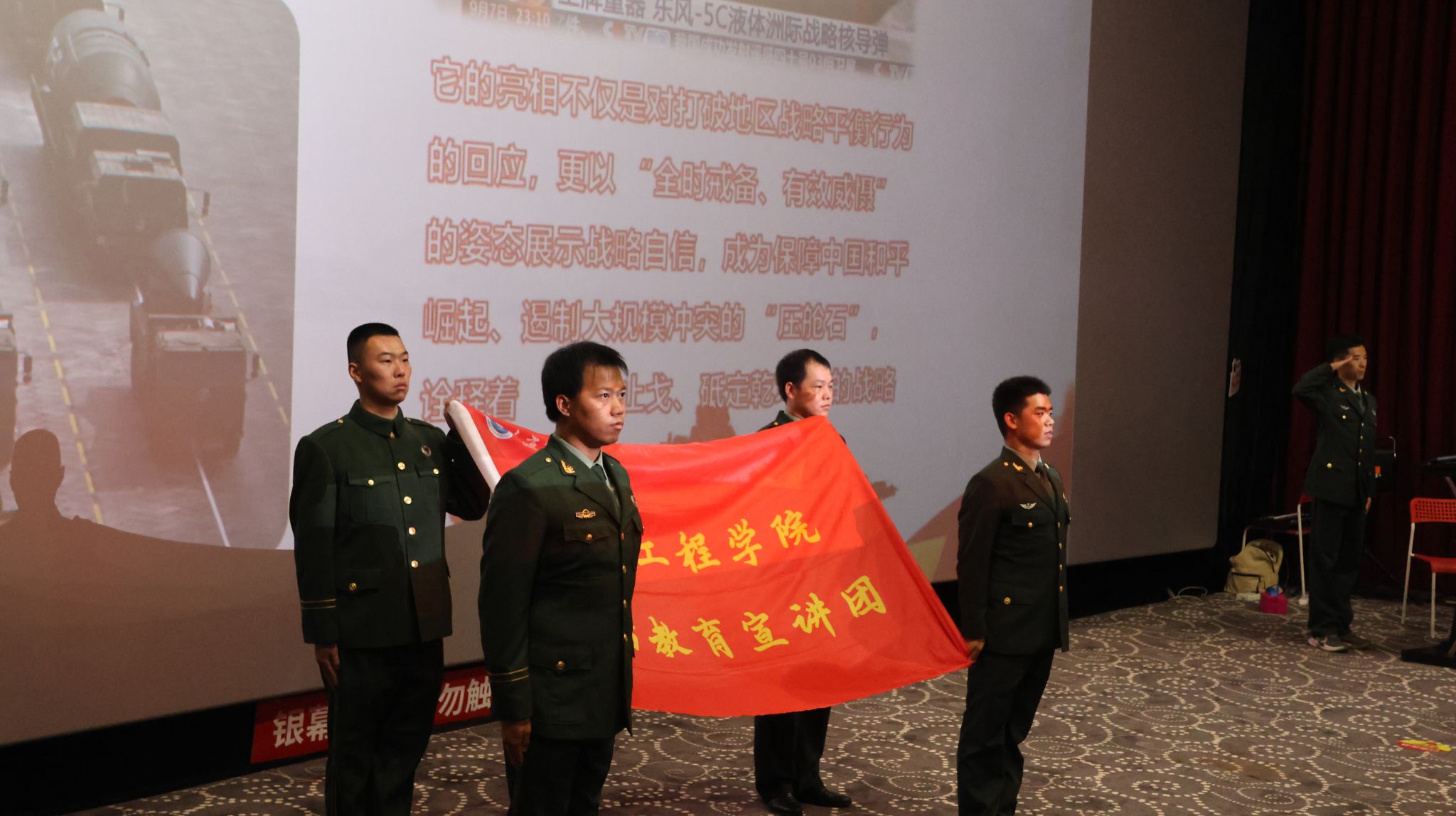宣讲介绍后,国防宣讲团的成员们身着常服、列队整齐,举行了庄严的出旗仪式。铿锵有力的步伐、挺拔如松的军姿,展现了新时代青年的精神风貌。仪式结束后,成员们与现场同学合影留念,定格下这一充满意义的时刻。辅导员雷艳老师总结道:“希望同学们以宣讲团为榜样,将爱国情怀转化为实际行动,在军营大熔炉中锤炼本领,为强国强军贡献青春力量。”