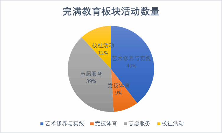 完满教育旨在完满、全面发展,智工的小伙伴们不要专注于一类活动,校园社团活动可以参与各种社团活动,开拓我们的视野;艺术修养与实践可以陶冶我们的情操,提高我们的修养;志愿者服务可以让我们投身于社会公益活动,奉献于社会;书院类活动是一项综合性很强的活动,包含着四大板块的所有性质。