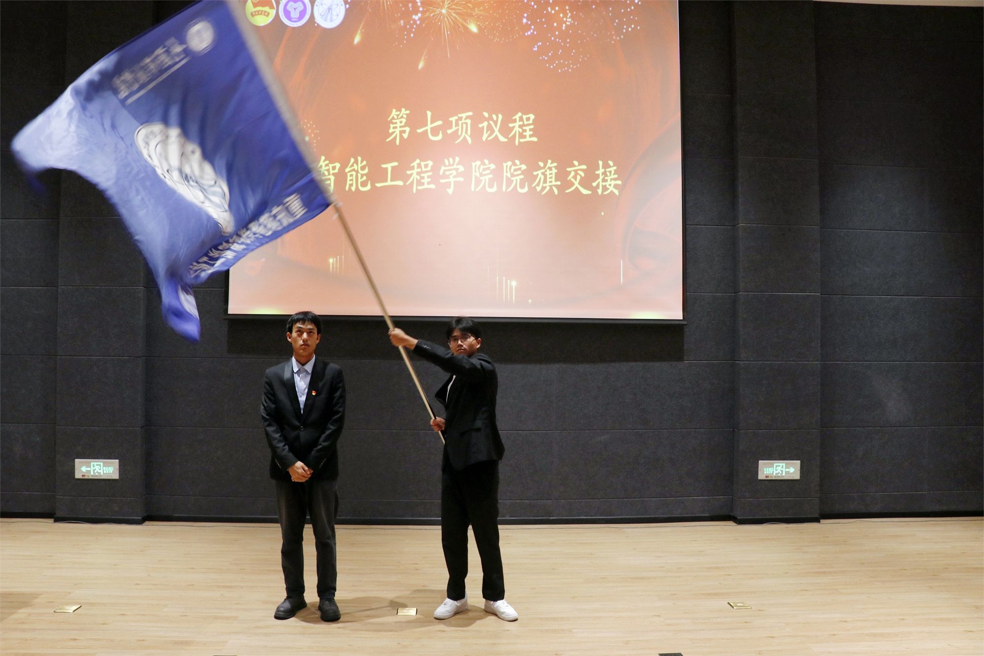 “今天我们在阵阵掌声中见证了四届一任的结束,同时即将迎来属于四届二任的新篇章。每一届学生组织的薪火相传,都在为学院的发展建设添砖加瓦。现在,由四届一任的主席团与四届二任的主席团交接院旗!”主持人话音刚落,两任主席团代表进行了院旗的交接。交接仪式中,挥舞的院旗不仅传递了四届二任即将扛起的使命,也表达了四届二任奋力前行的决心。